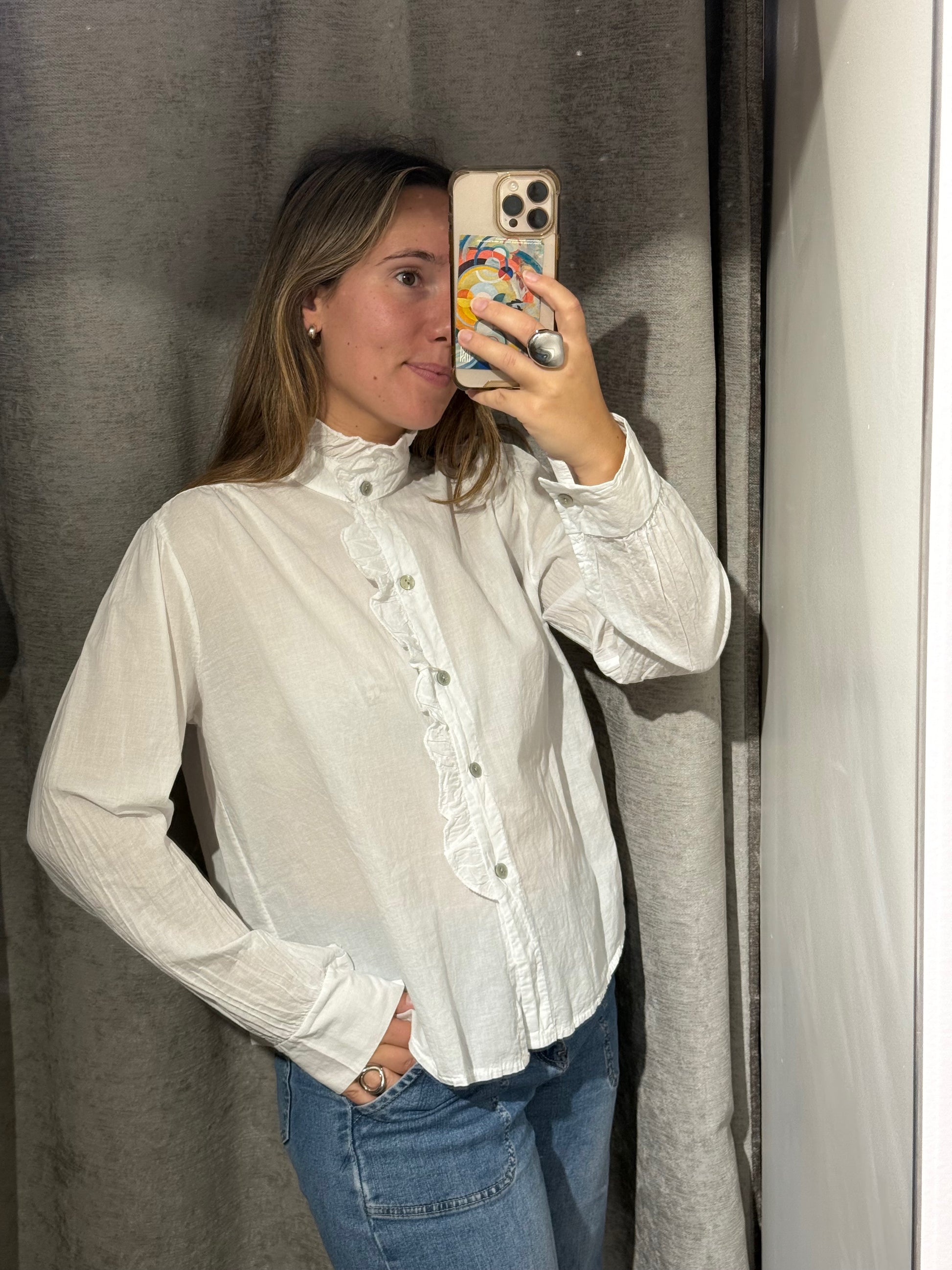 Blusa blanca fina con volantes en el cuello y en la apertura del medio.