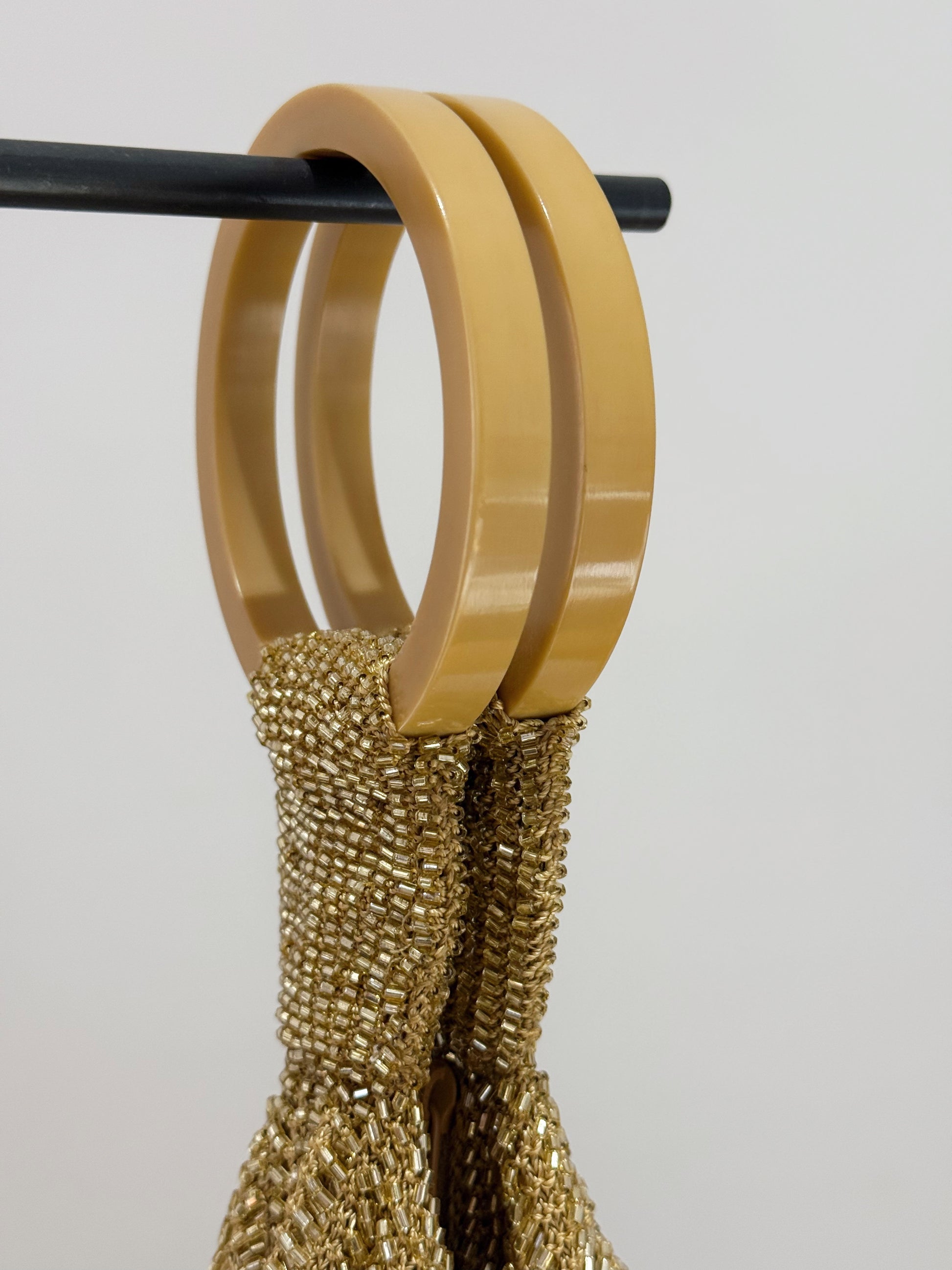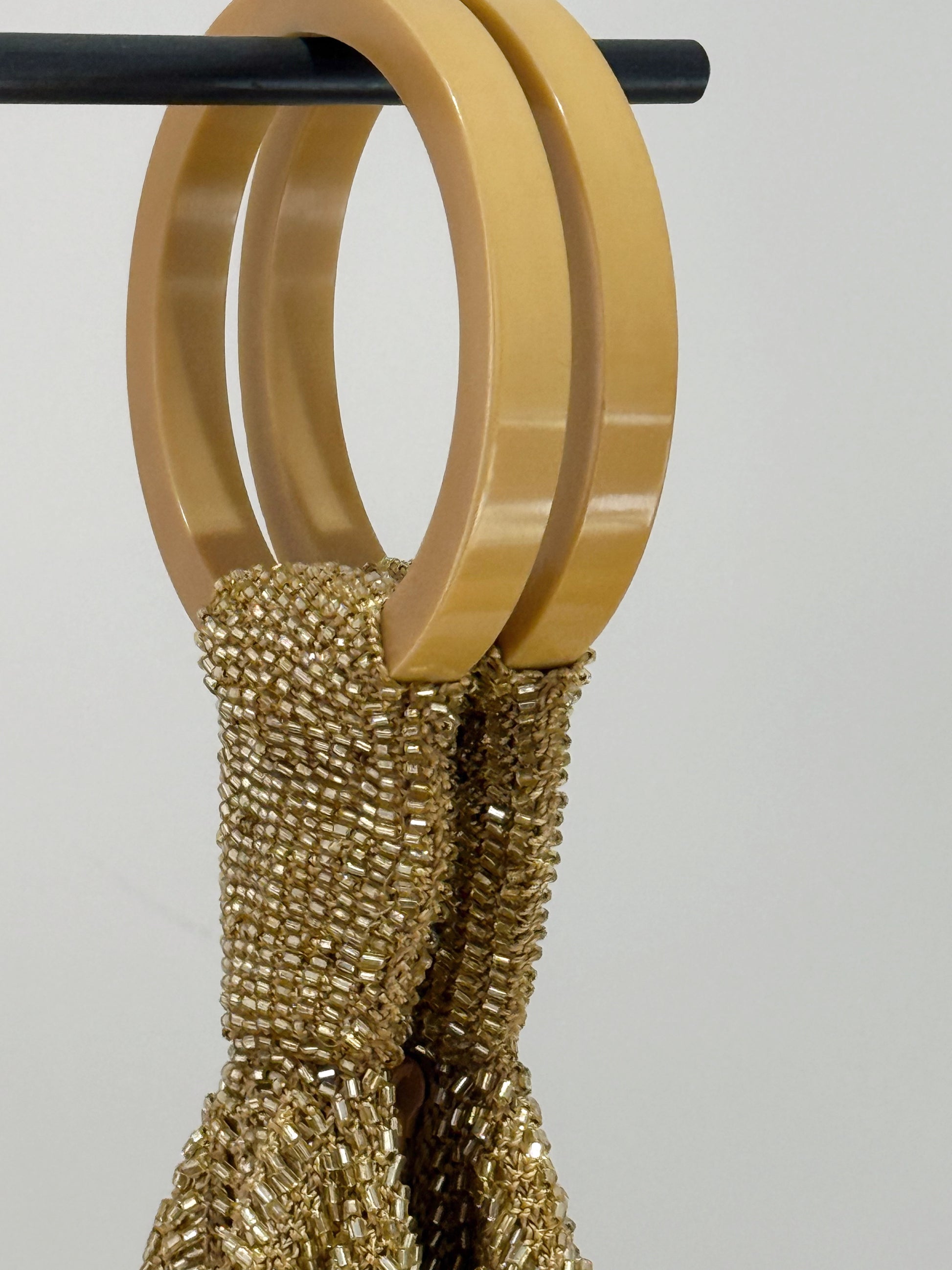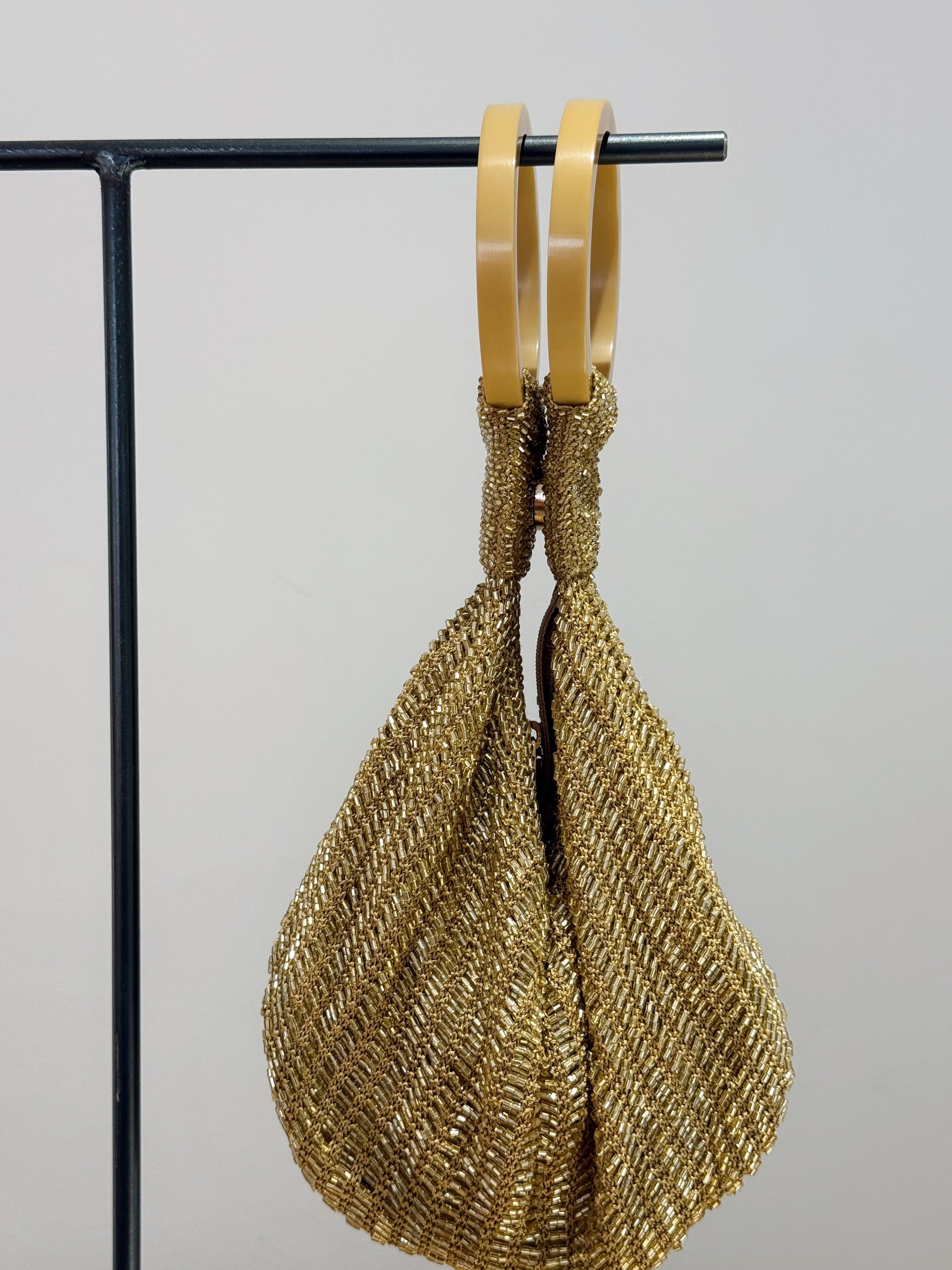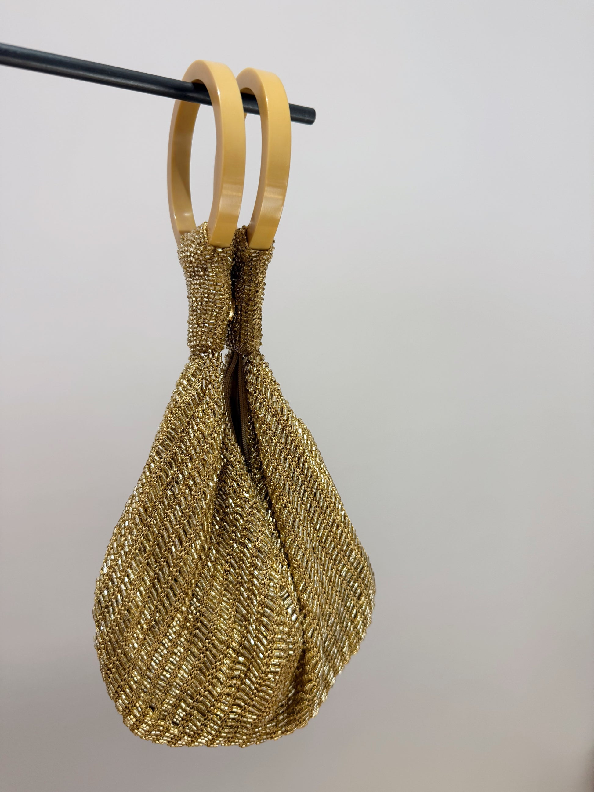 Bolso de mano con asa de pasta en forma circular. Vidrio textil en tonos dorados. Con cremallera.