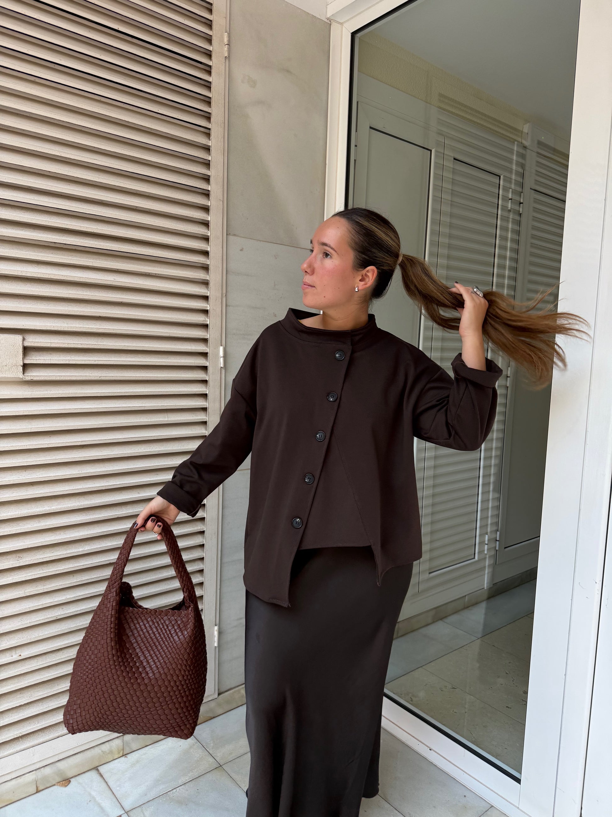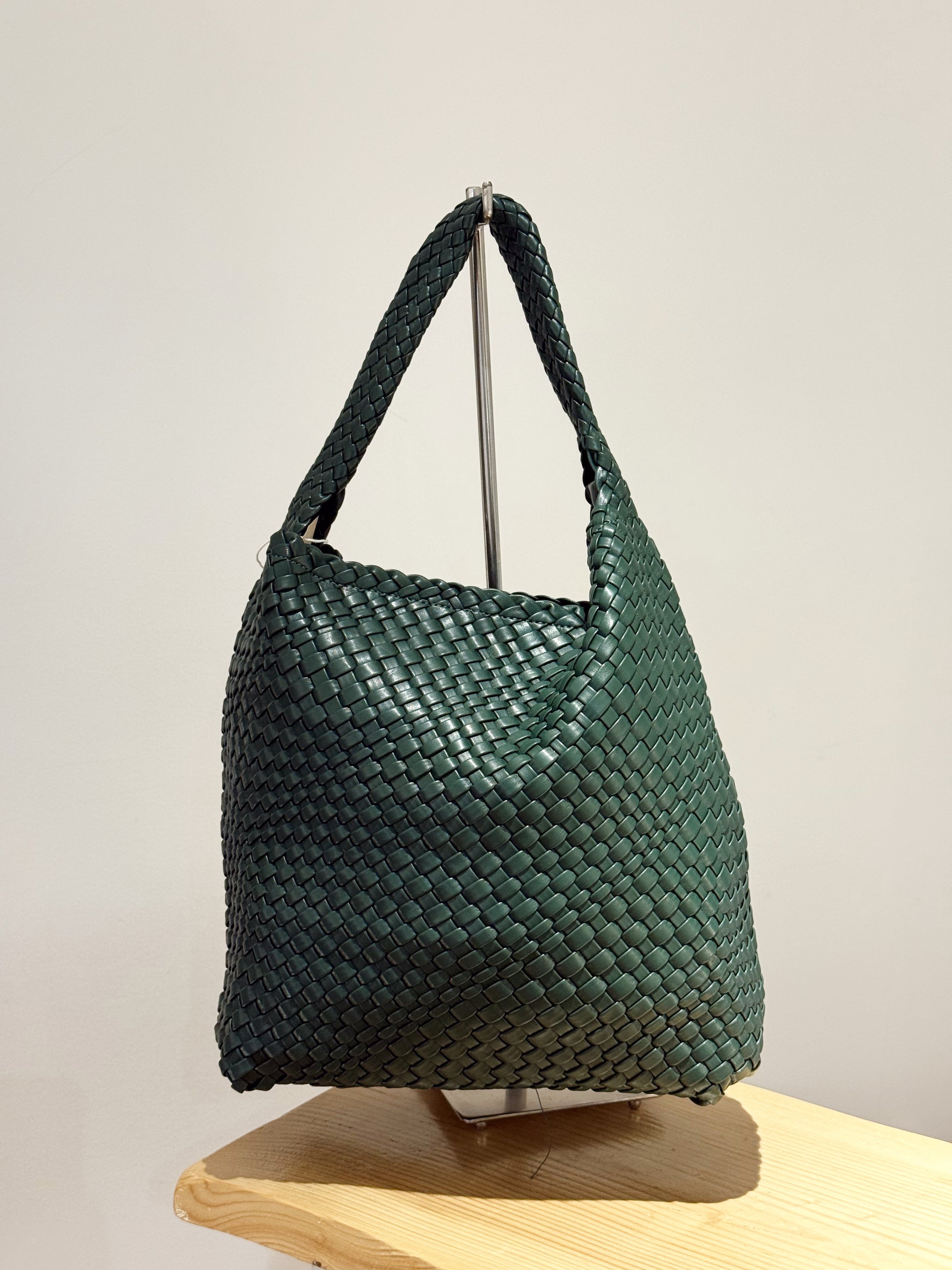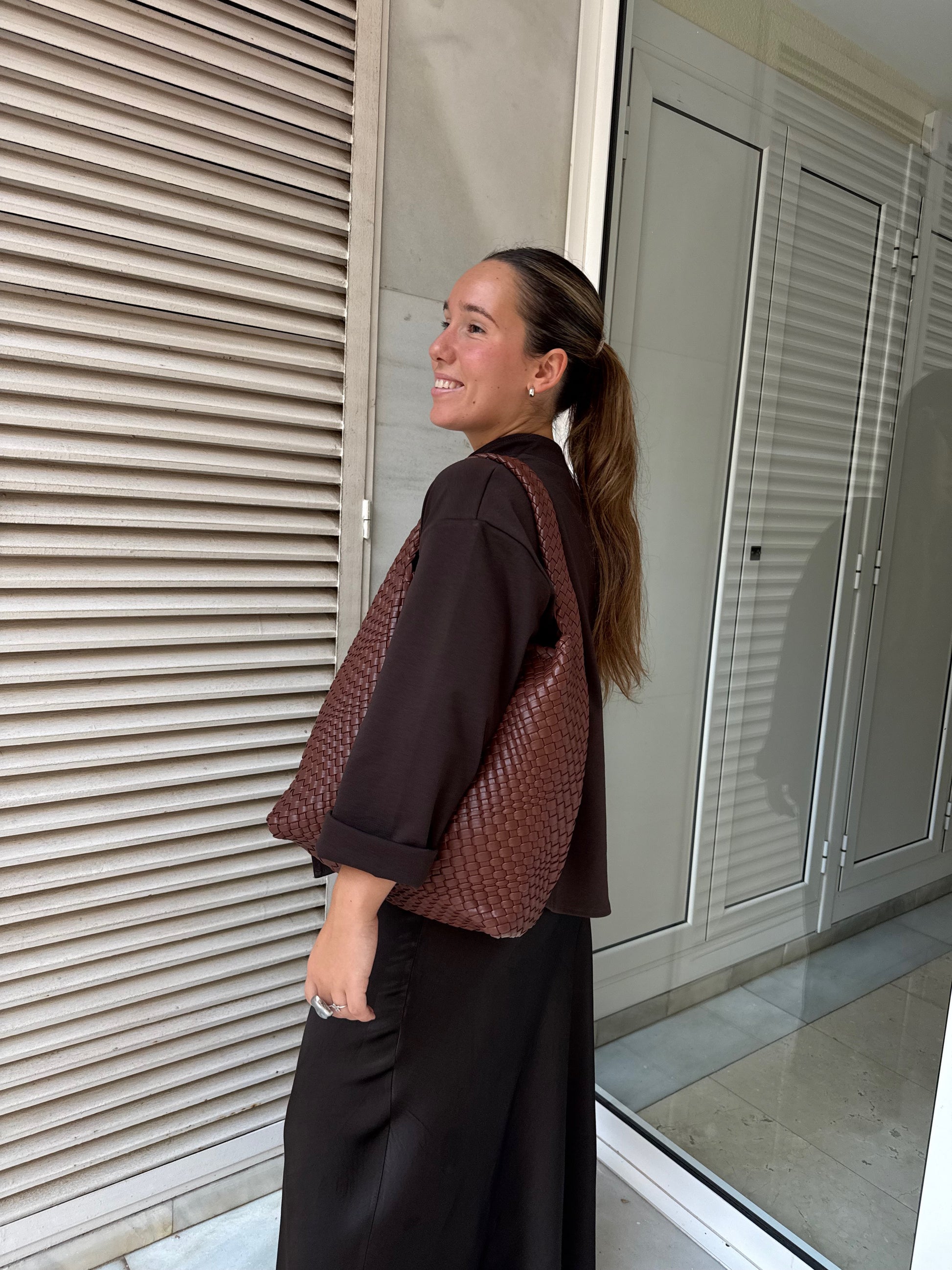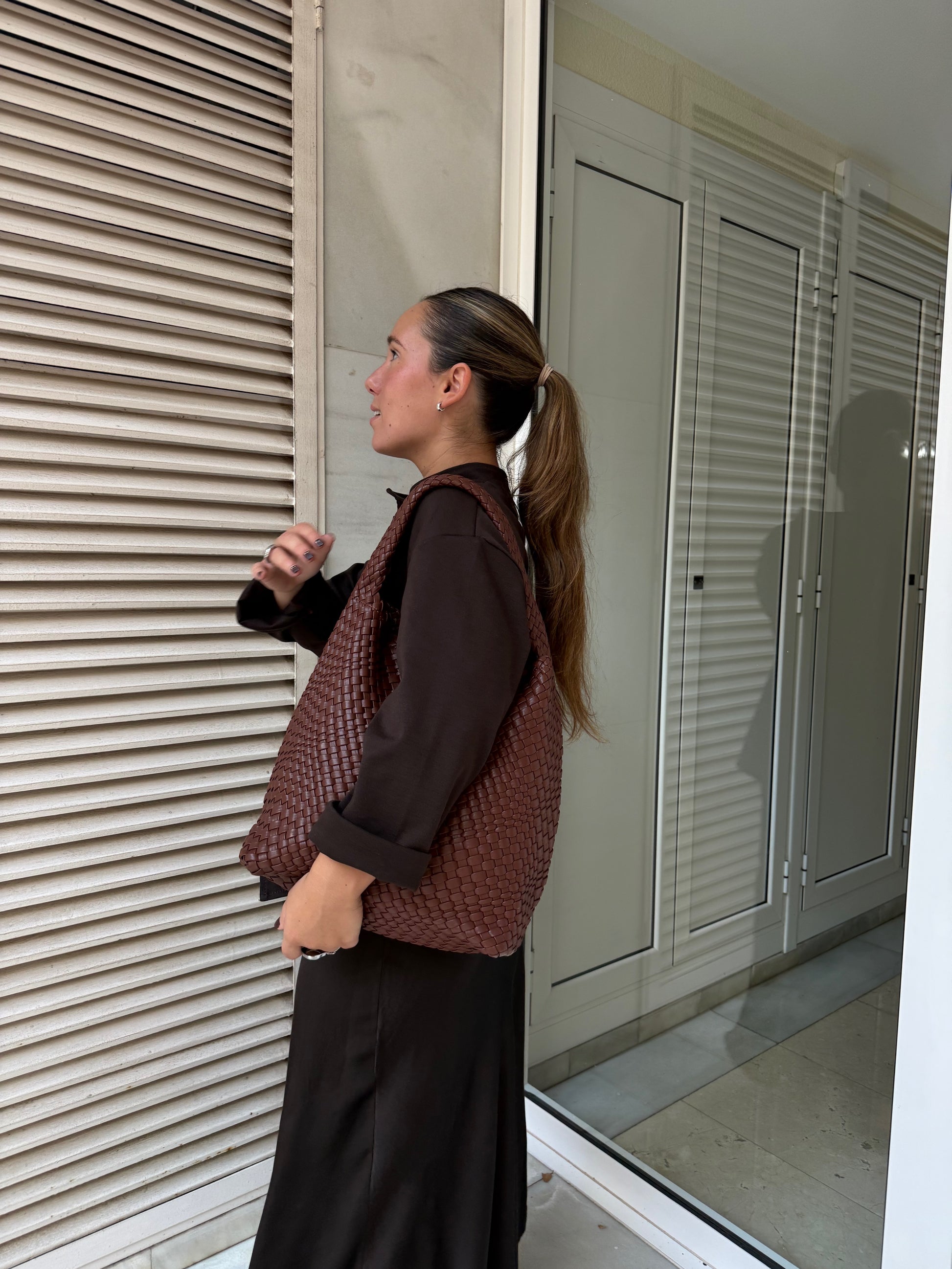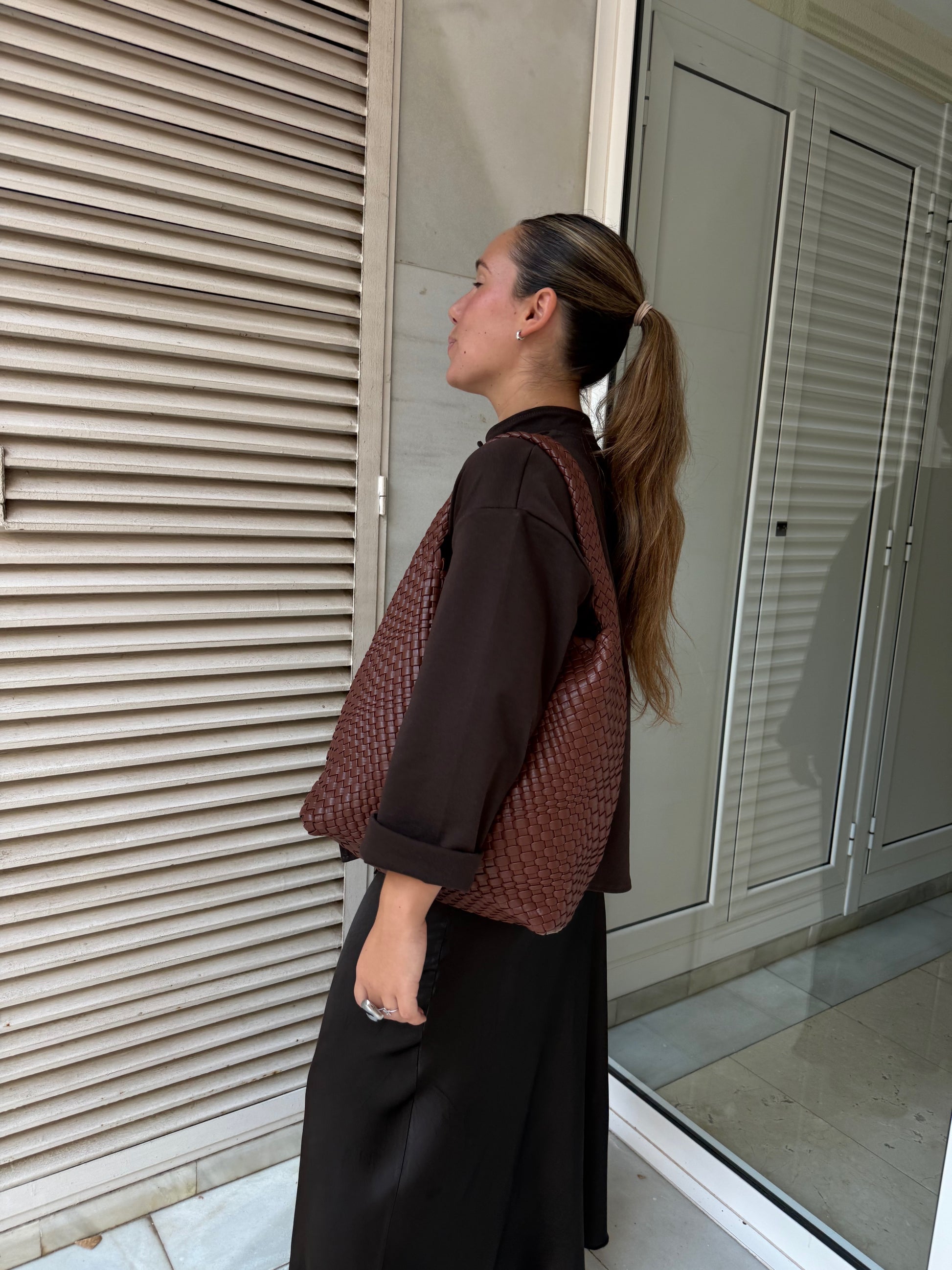 Bolso grande trenzado de polipiel, con asa de hombro.