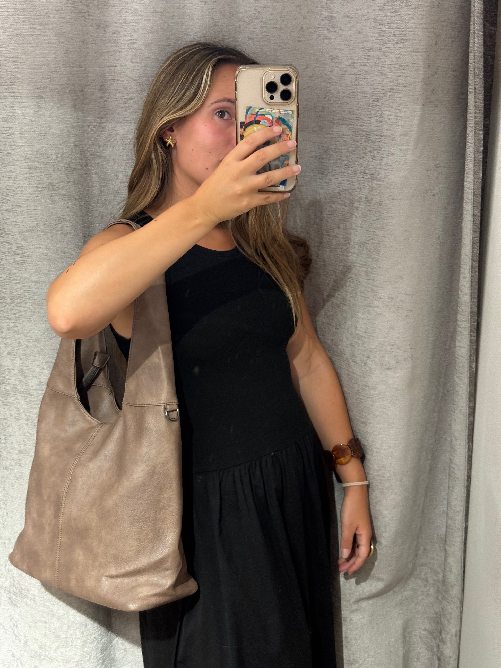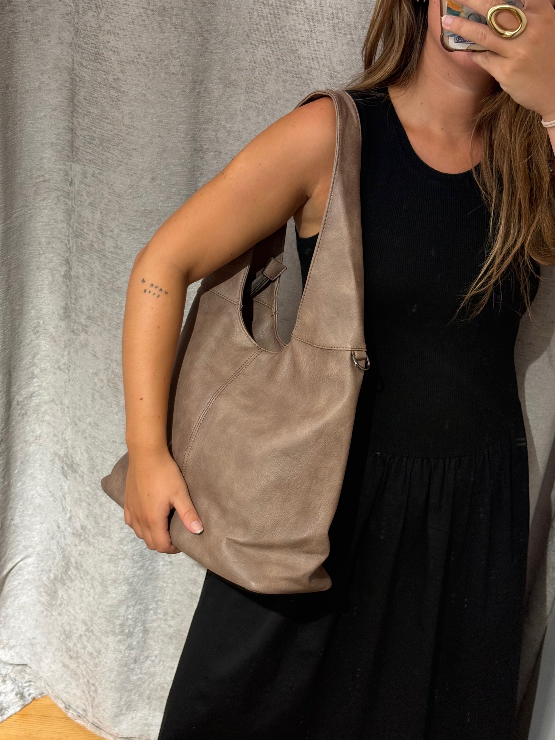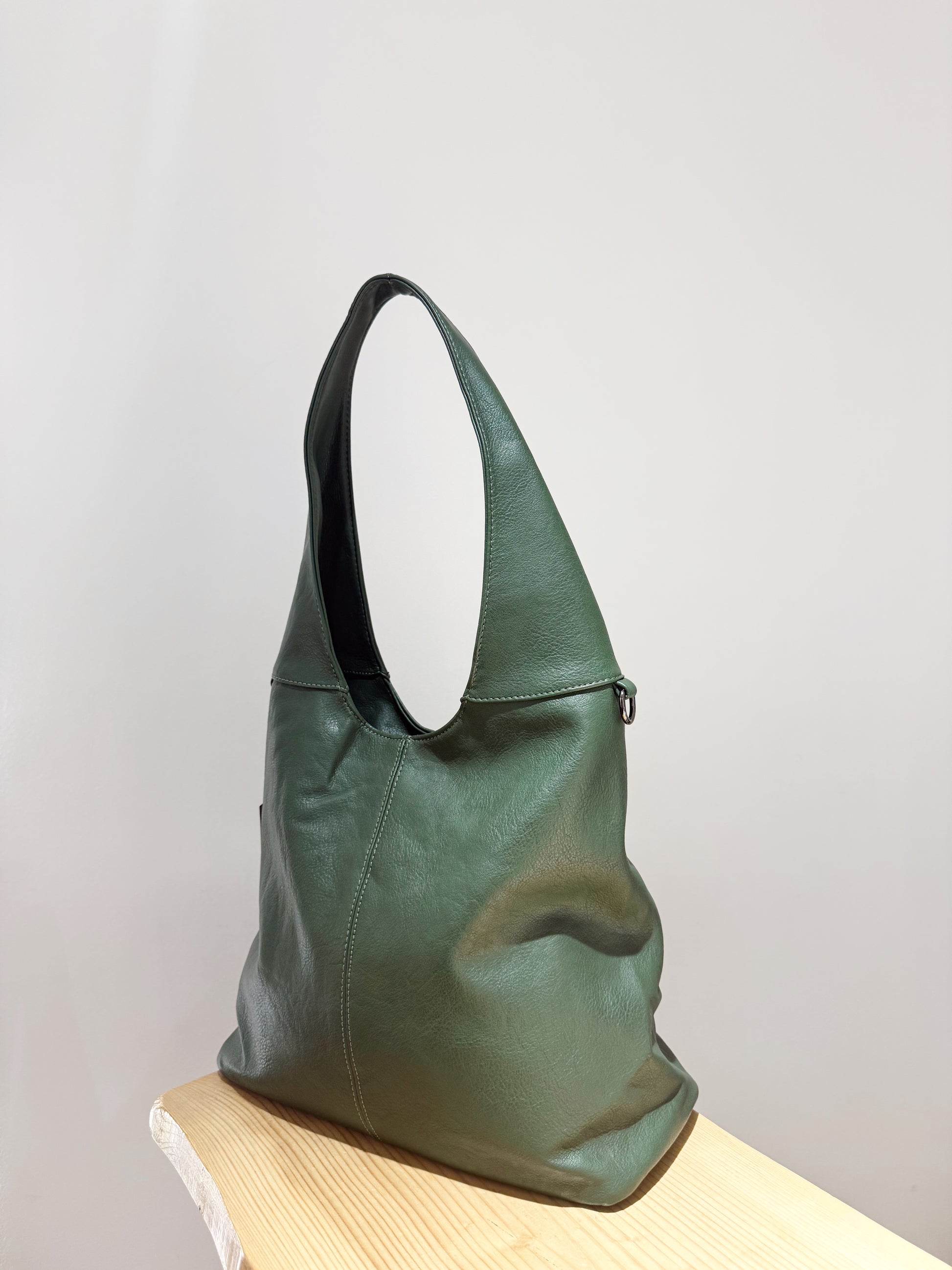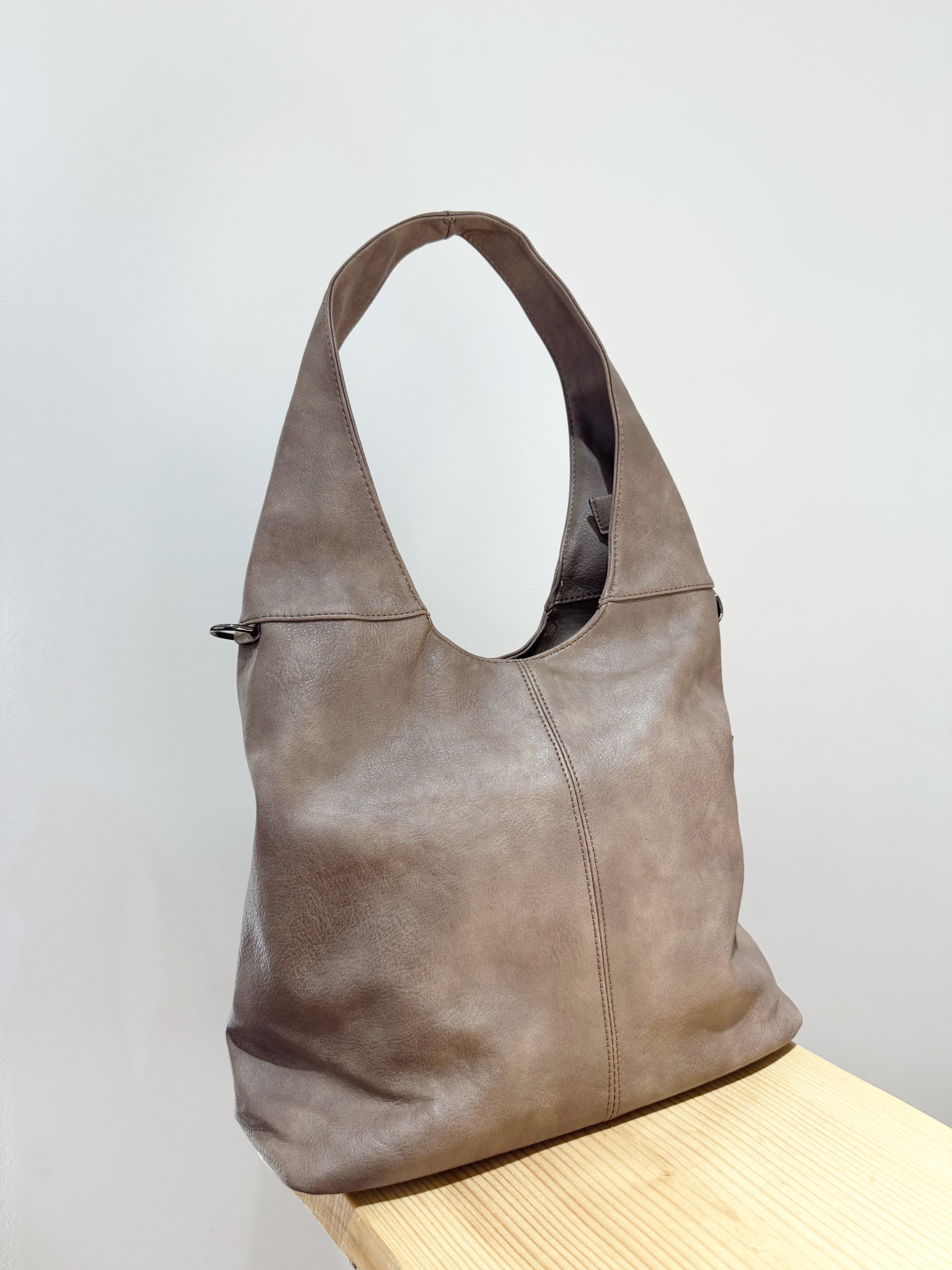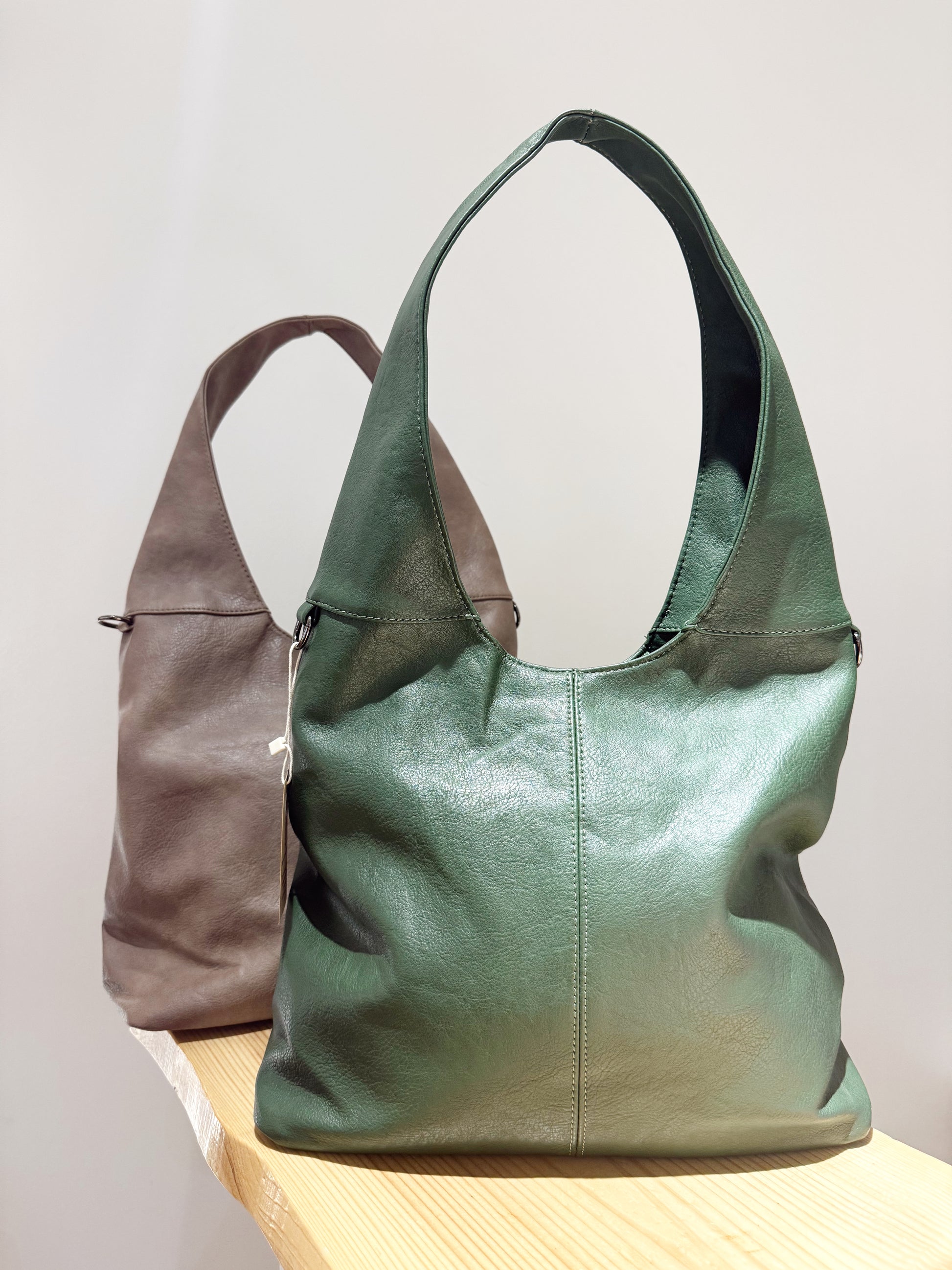 Bolso tipo saco de polipiel, con asa de hombro y cremallera.