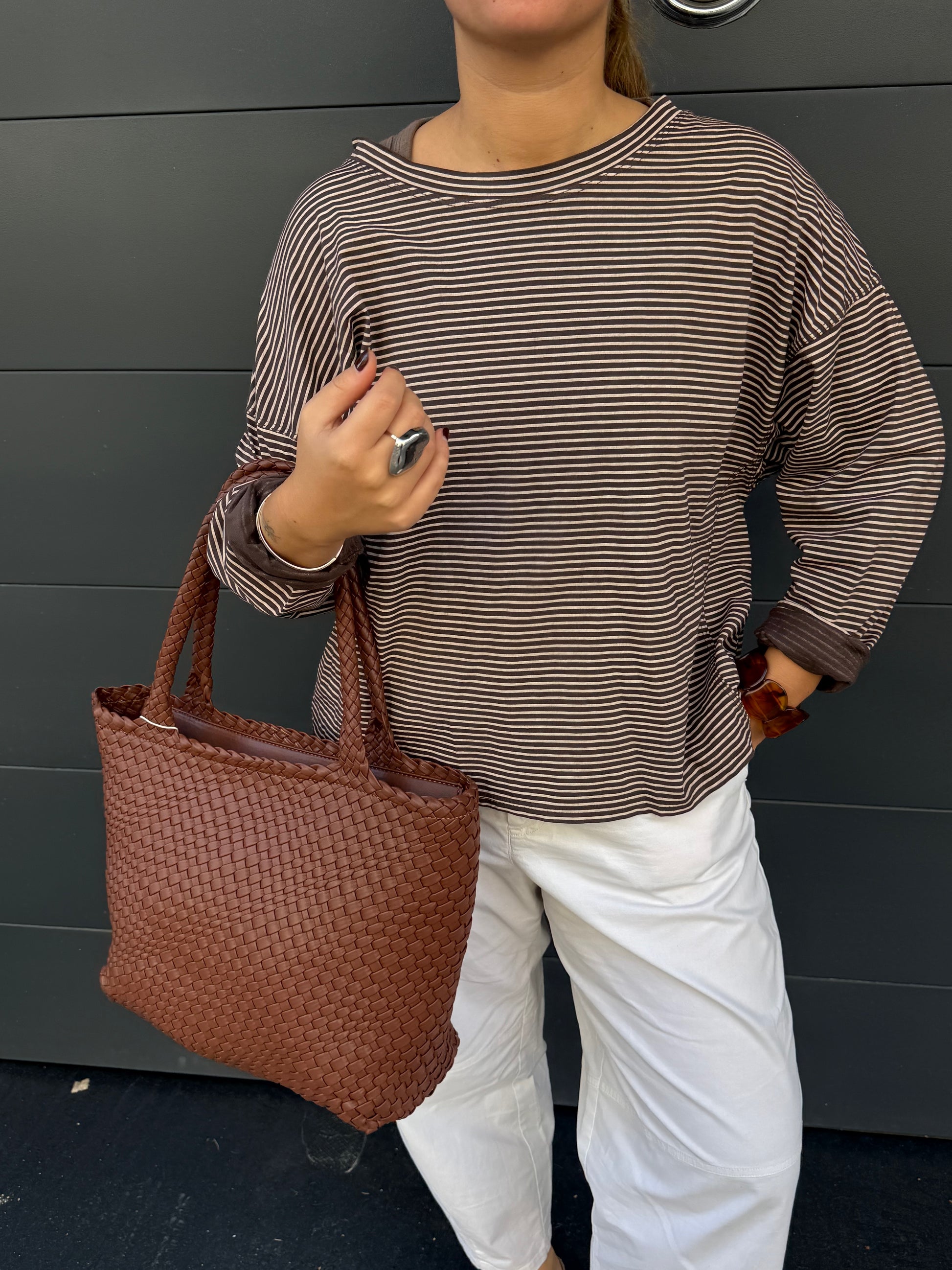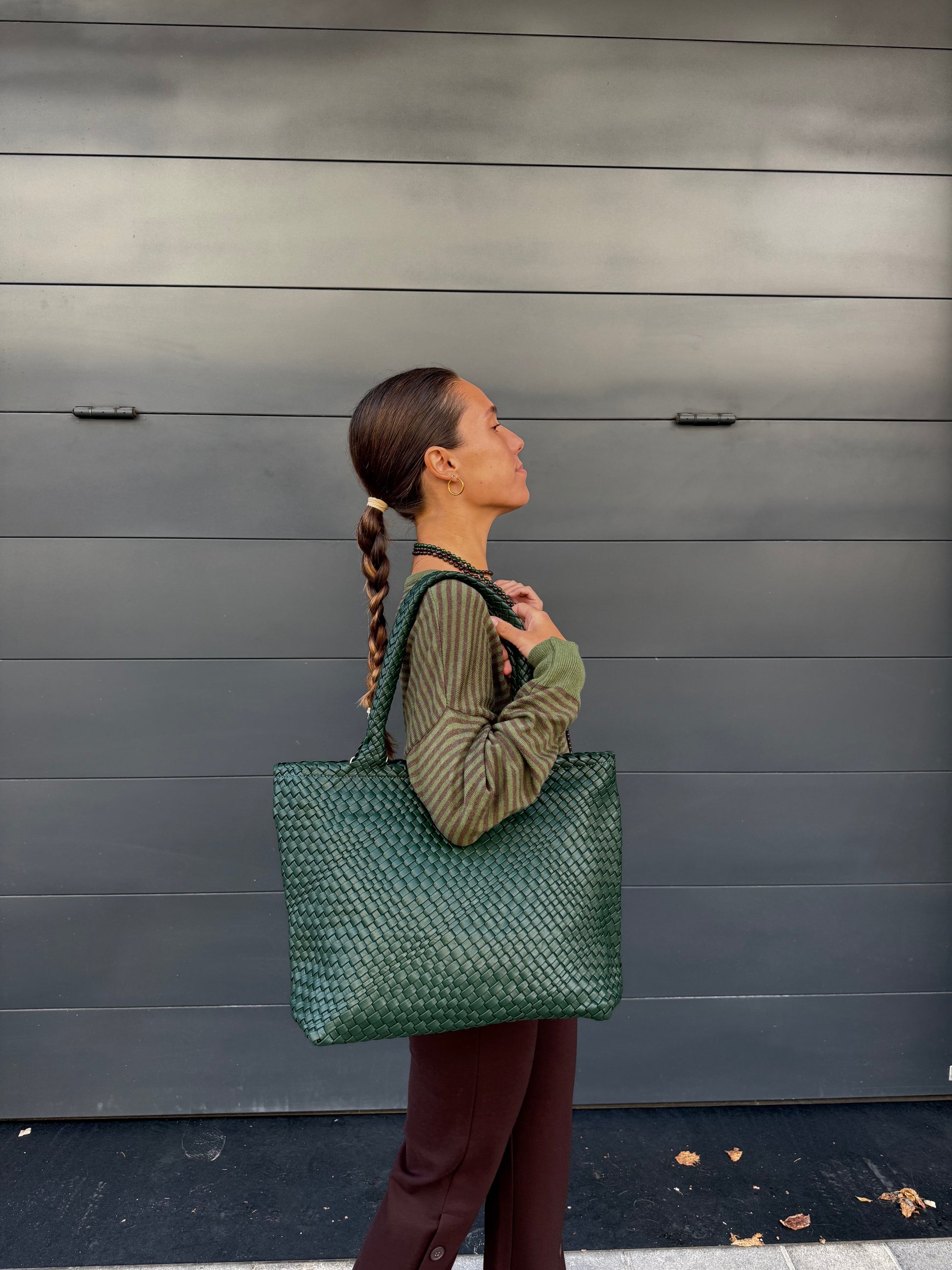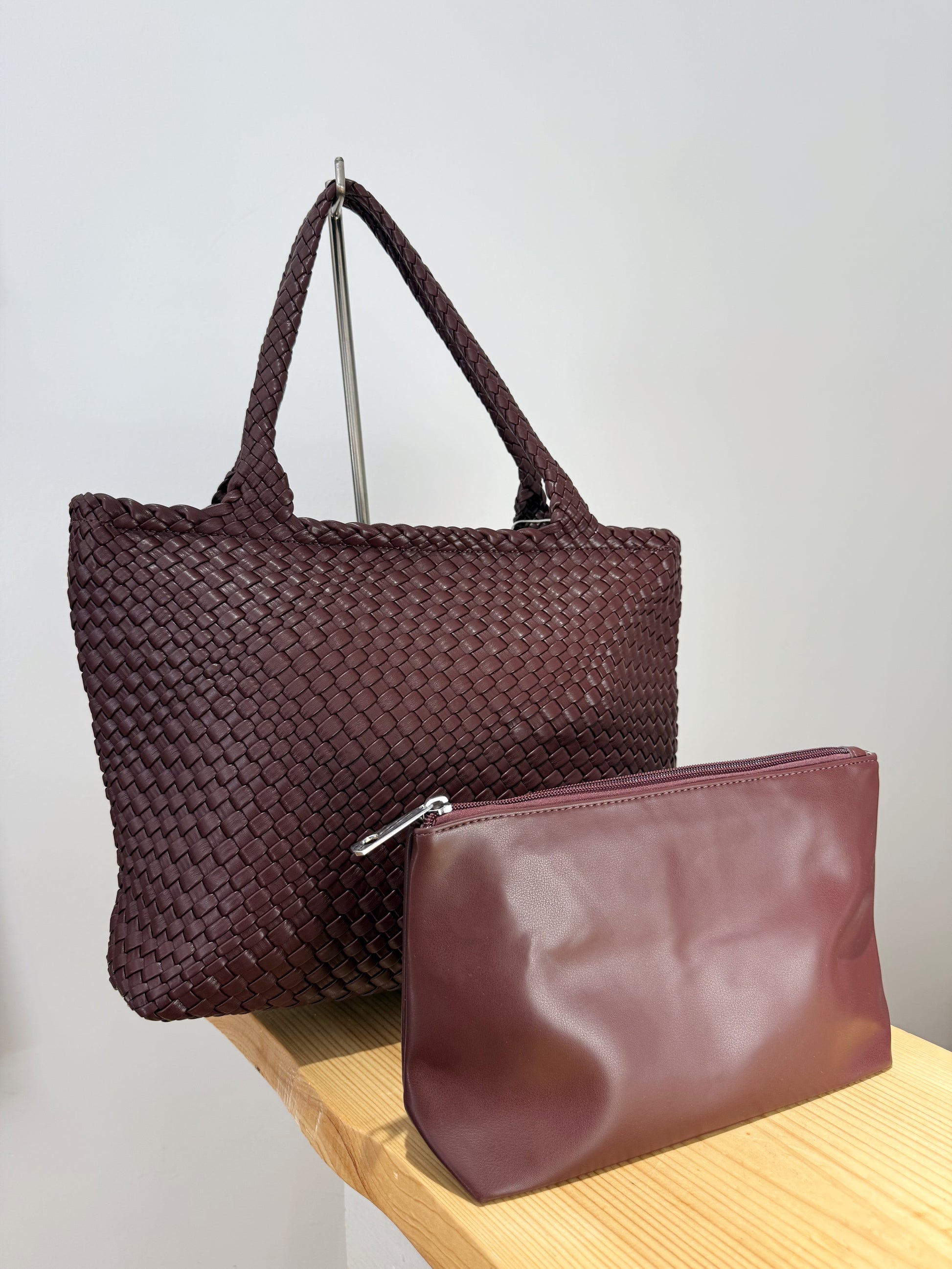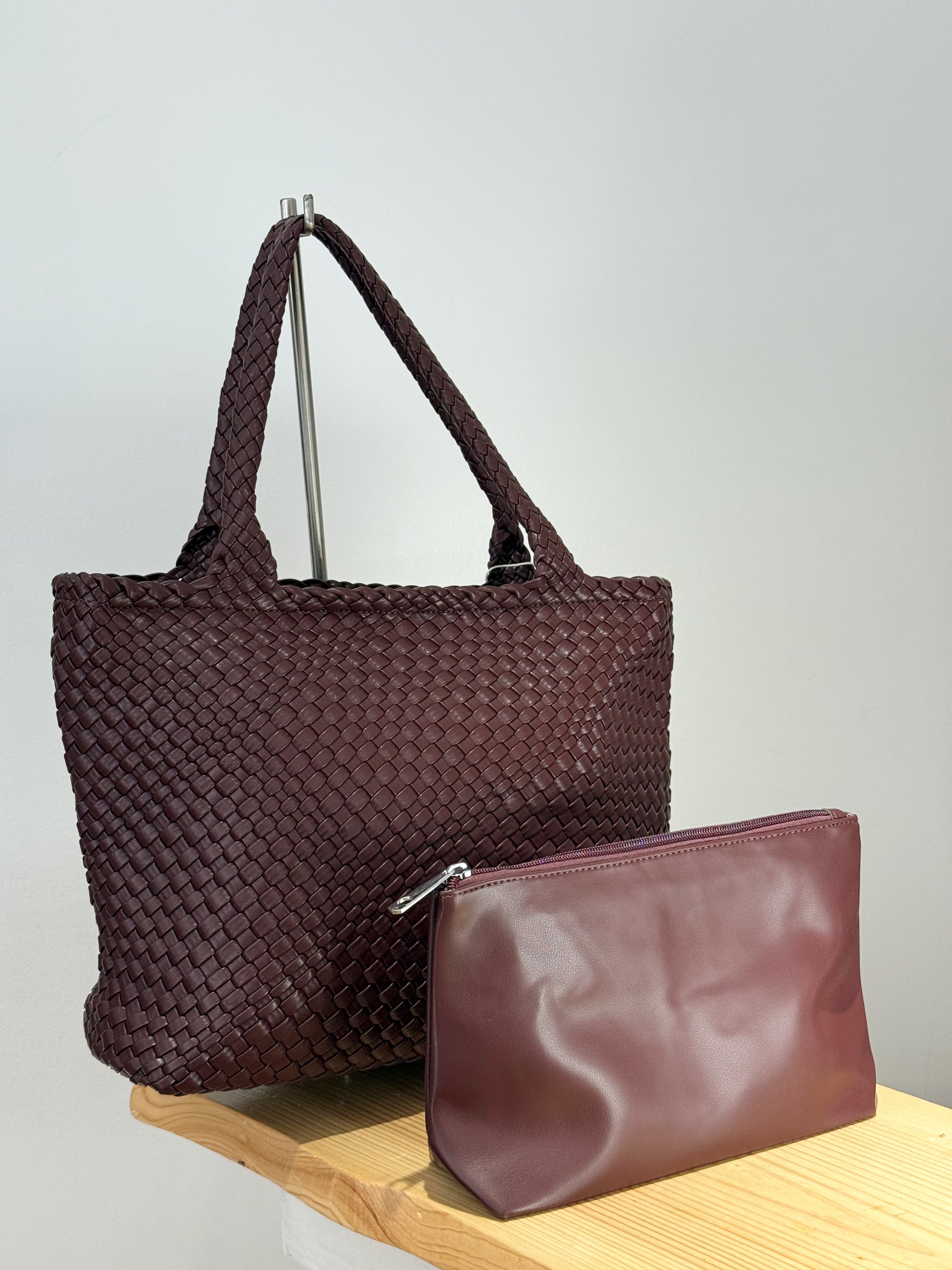 Bolso trenzado grande de polipiel en forma rectangular, con cremallera y mini bolso en el interior. Asa de hombro.
