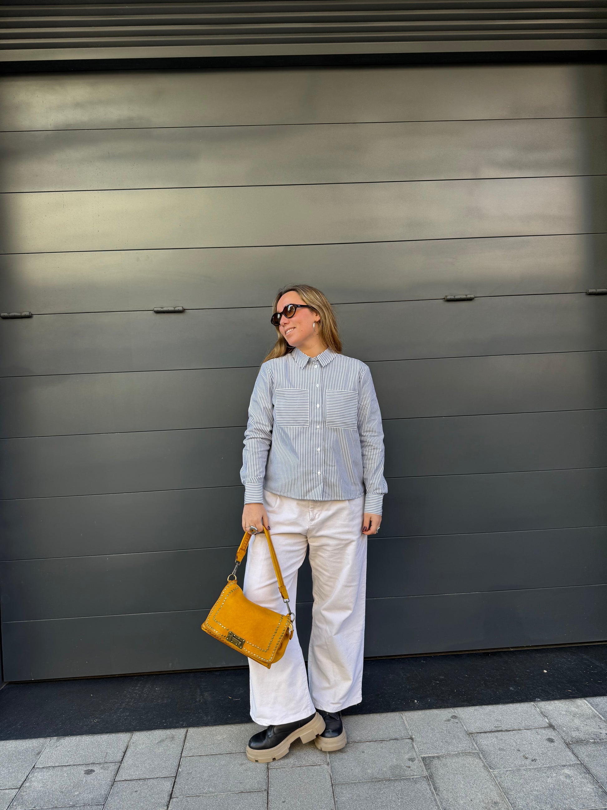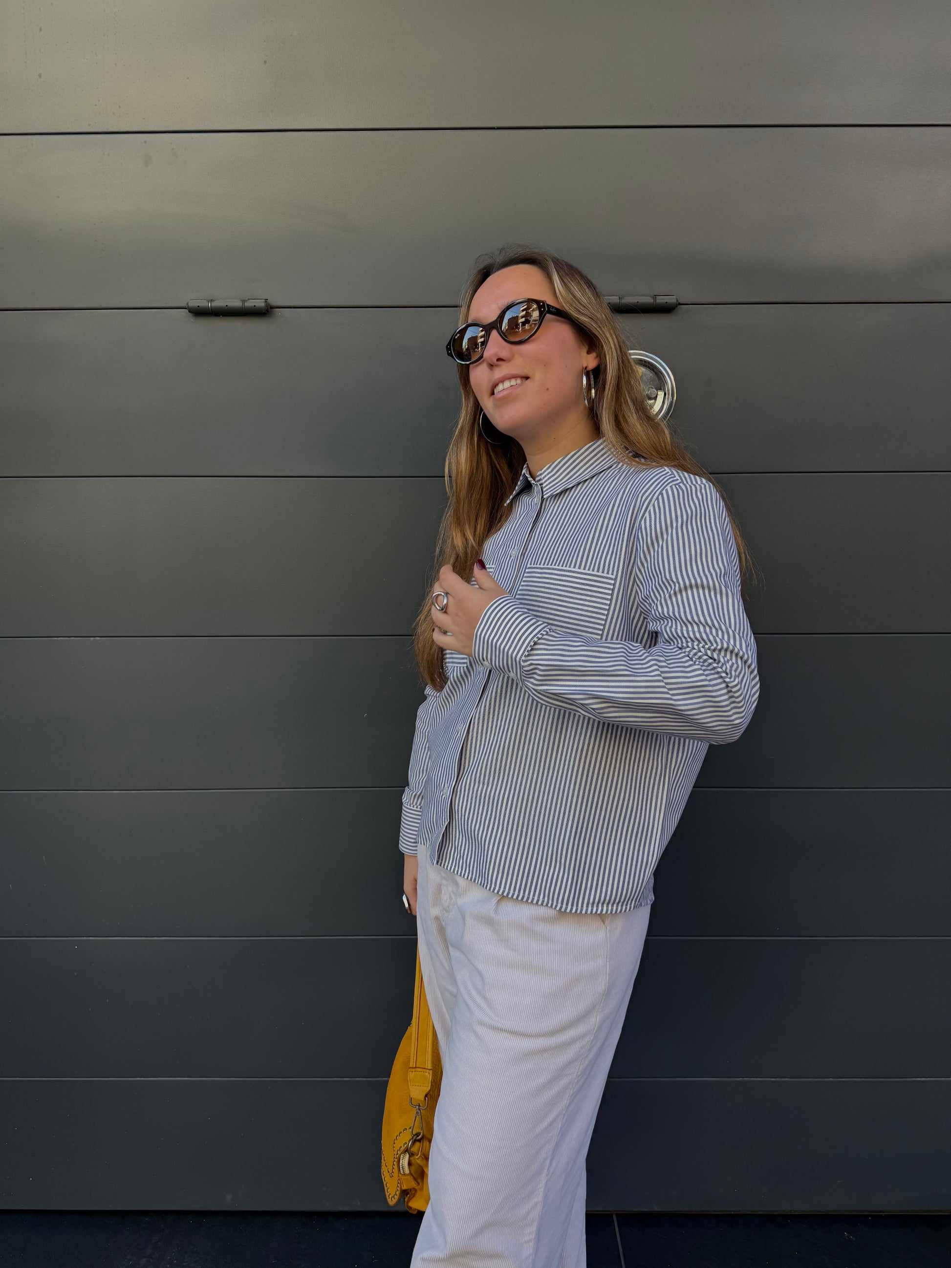 Camisa cuadrada de la marca Street One, con estampado de rayas azules y blancas, con bolsillos en el delantero con la dirección de las rayas al contrario.