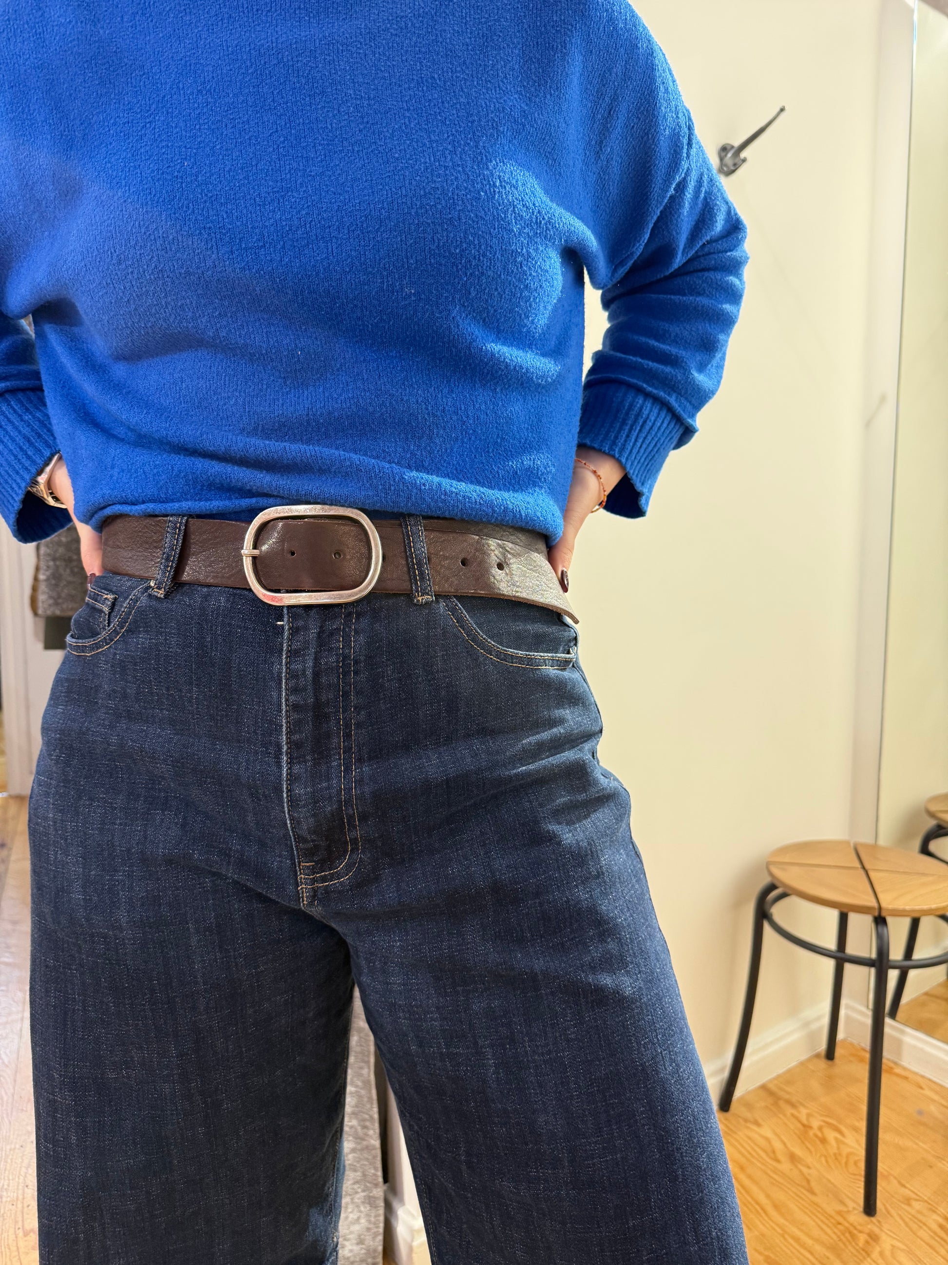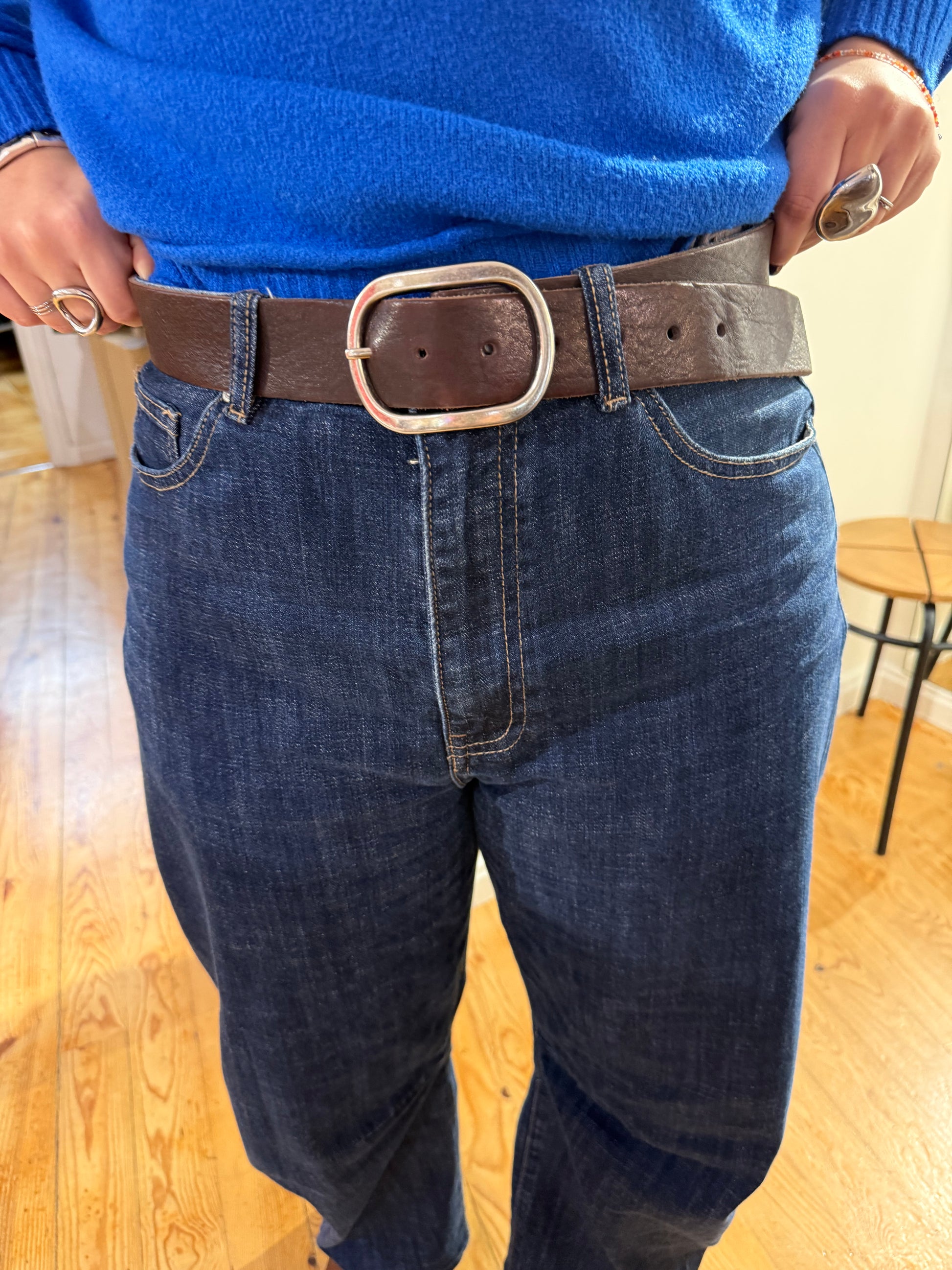 Cinturón de piel liso en marrón chocolate o negro con hebilla en plateado.