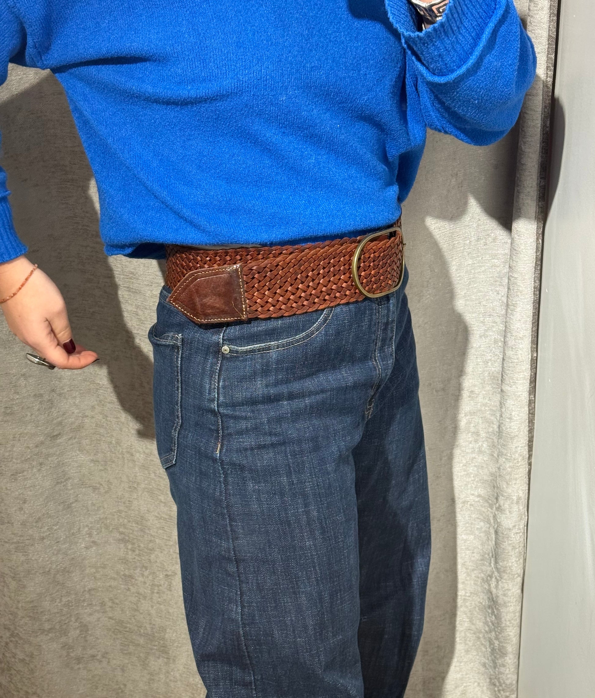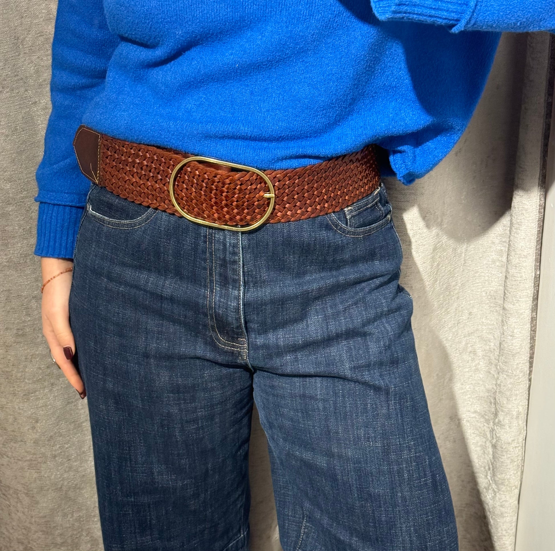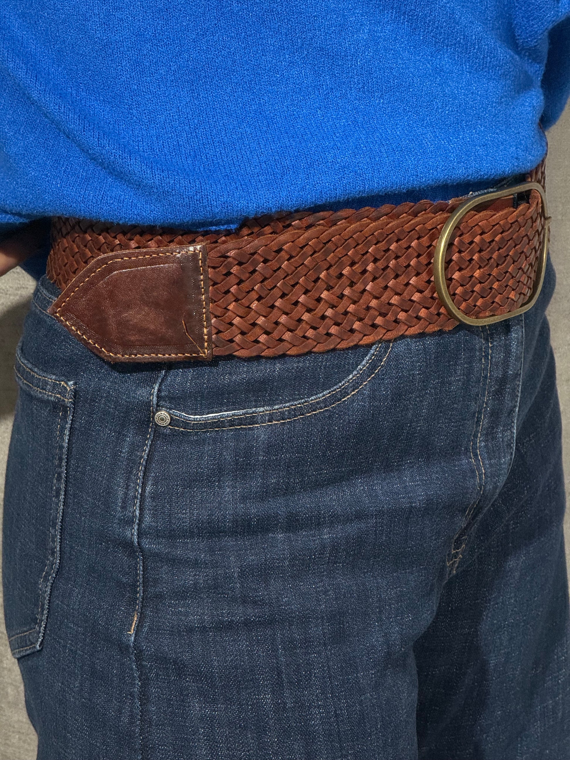 Cinturón ancho de piel trenzado (marrón) , con hebilla en dorado desgastado.