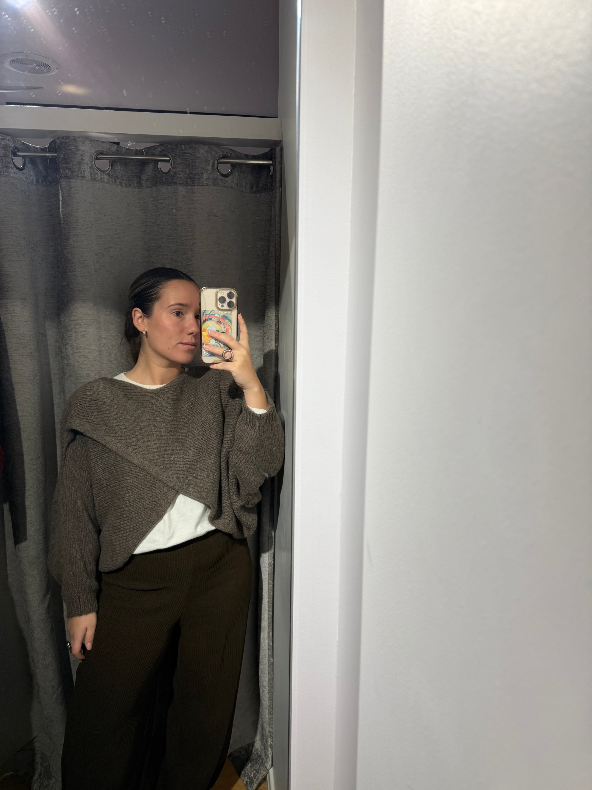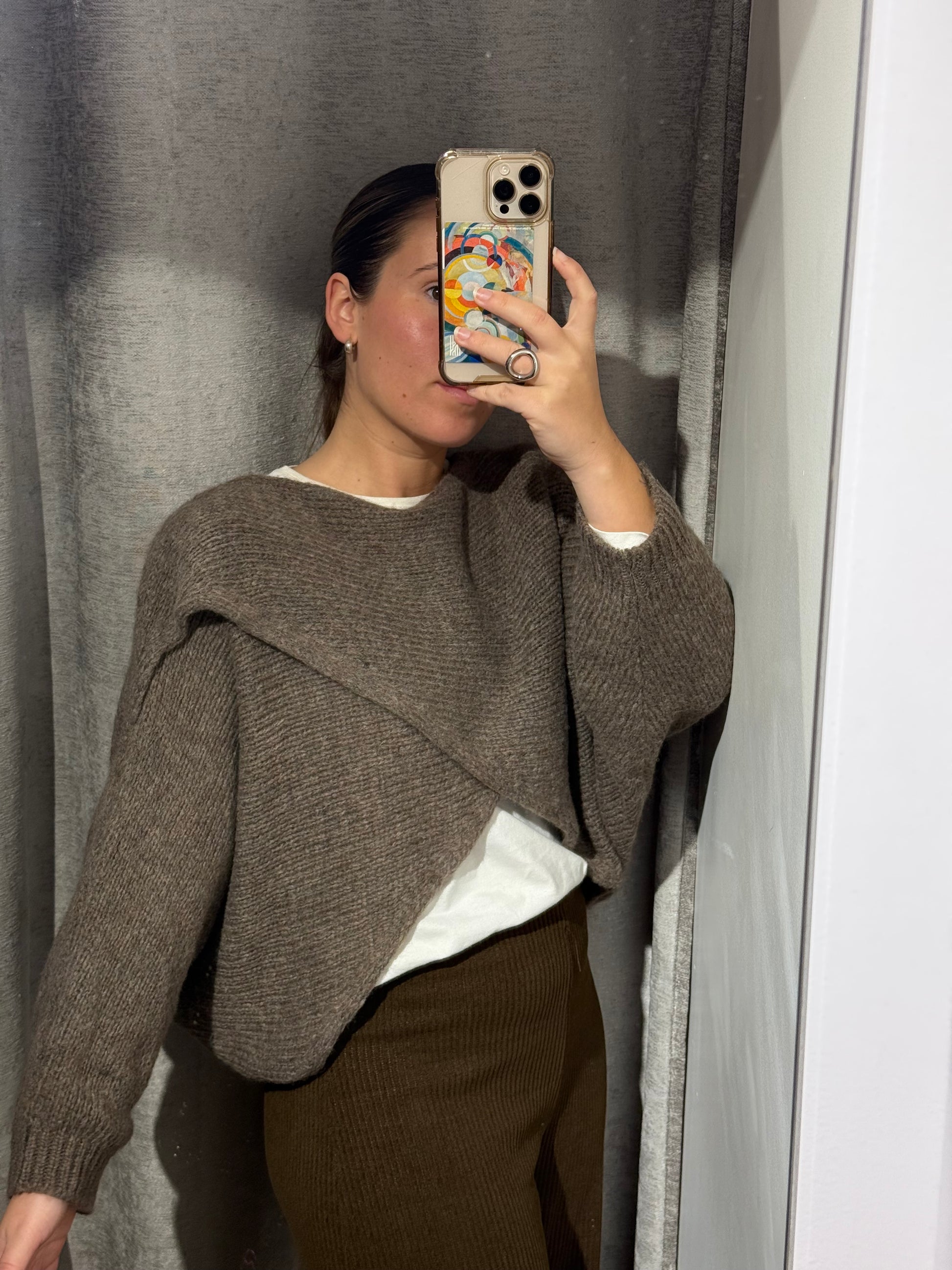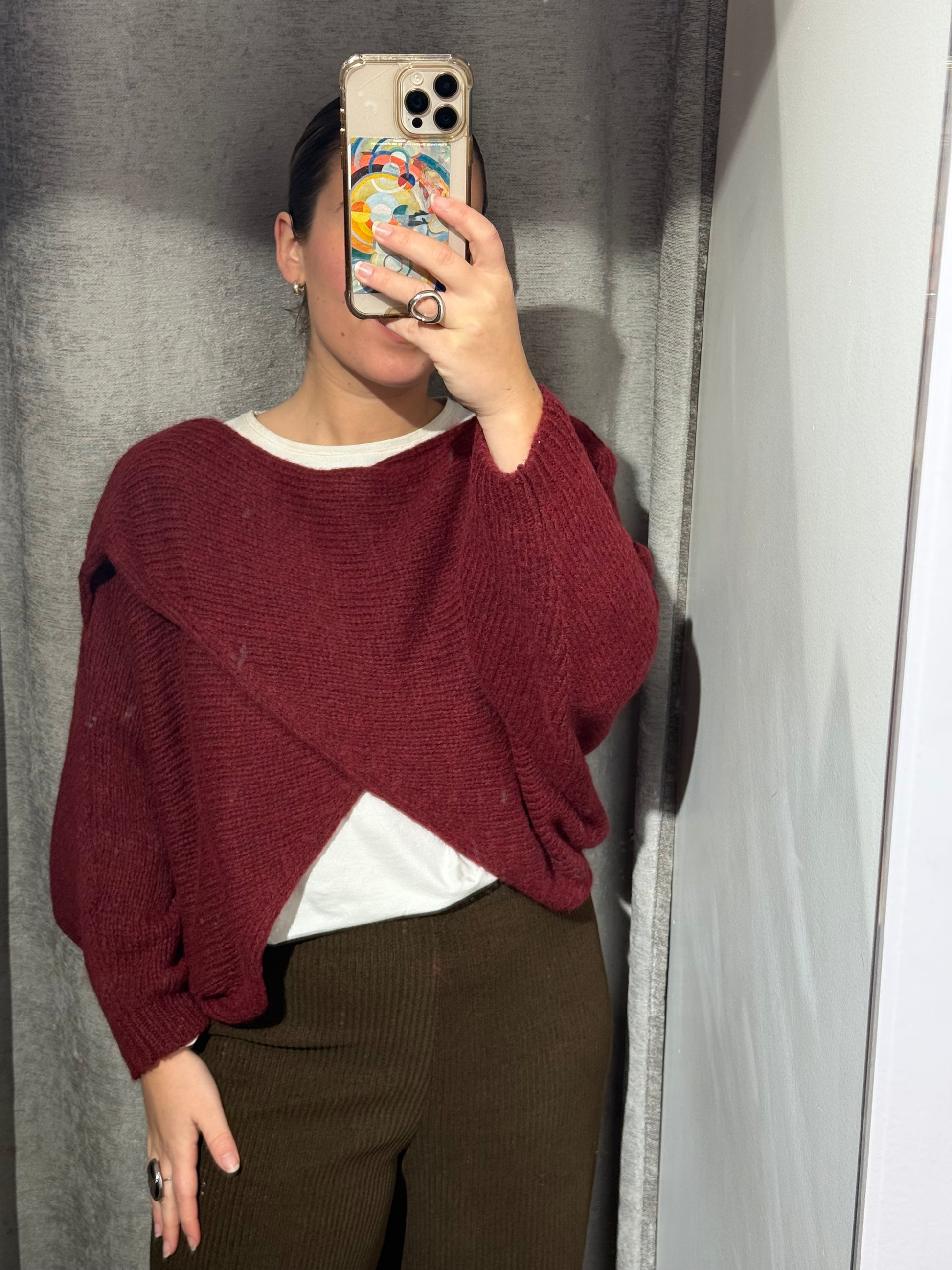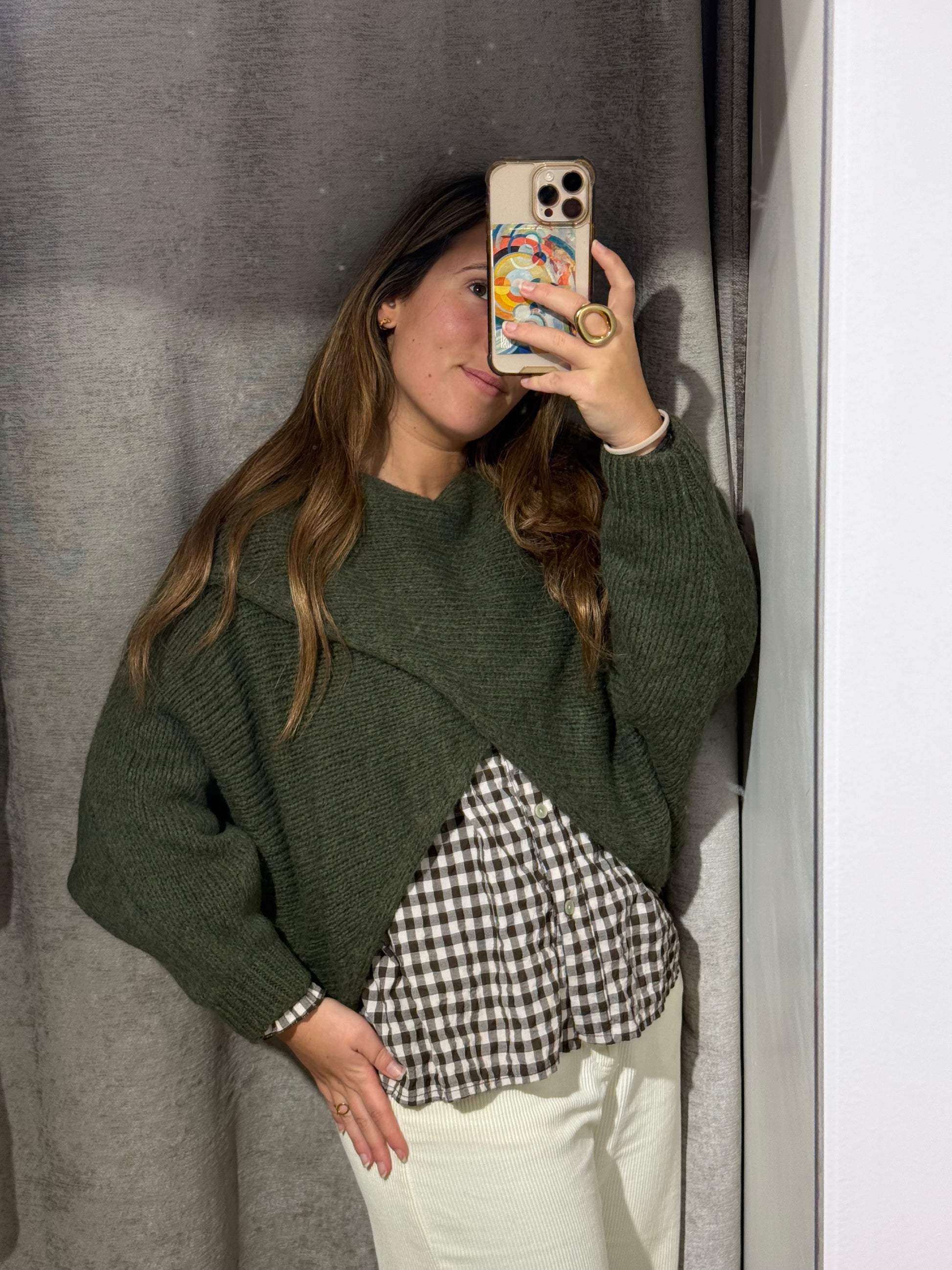 Jersey cruzado verde para que se aprecie la prenda de debajo.