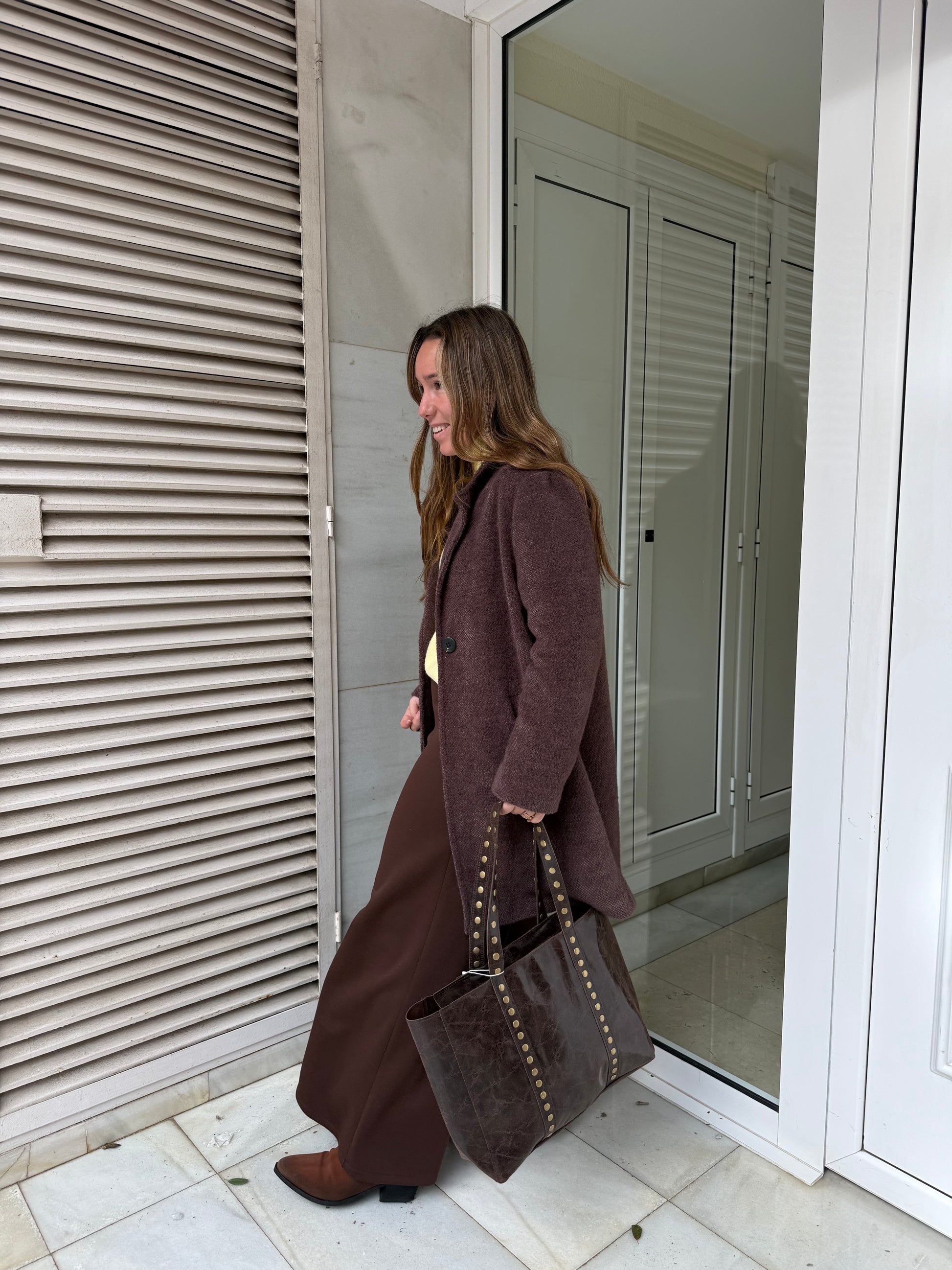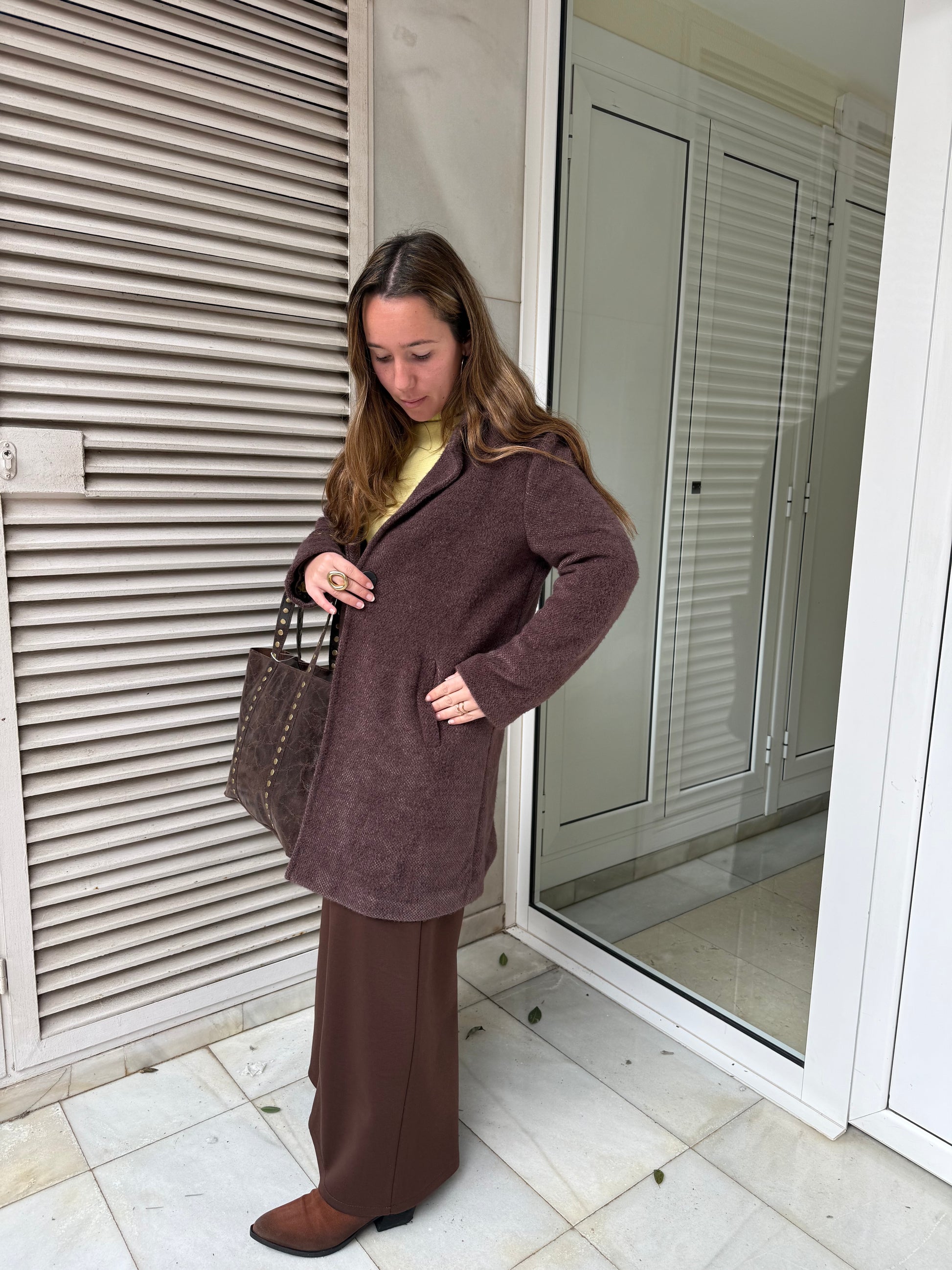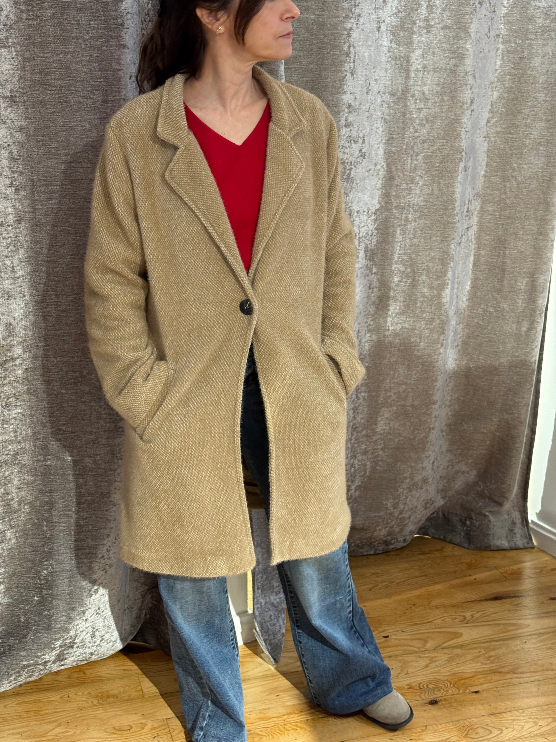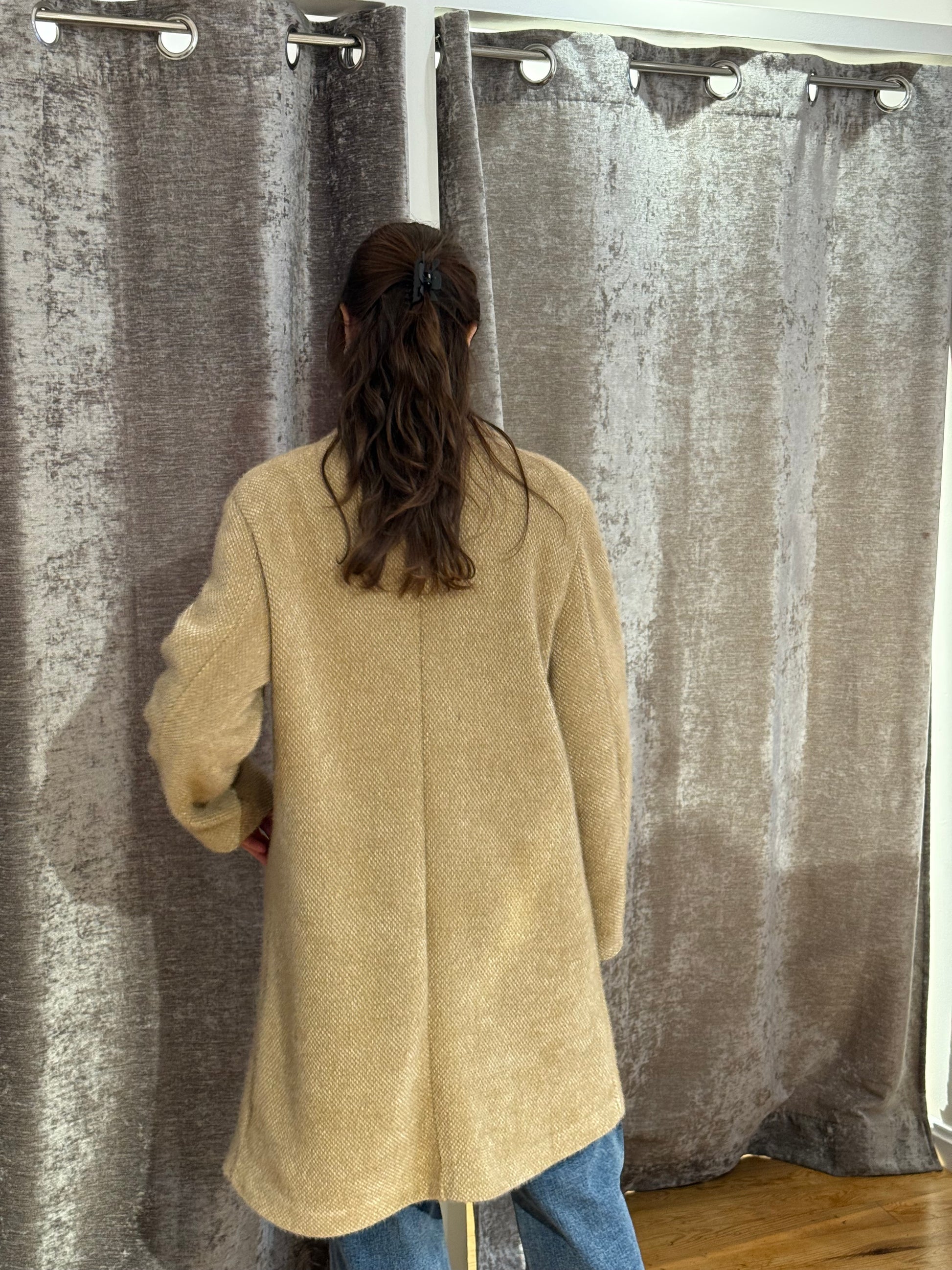 Abrigo jaspeado beige y camel con un botón y bolsillos, talla única.