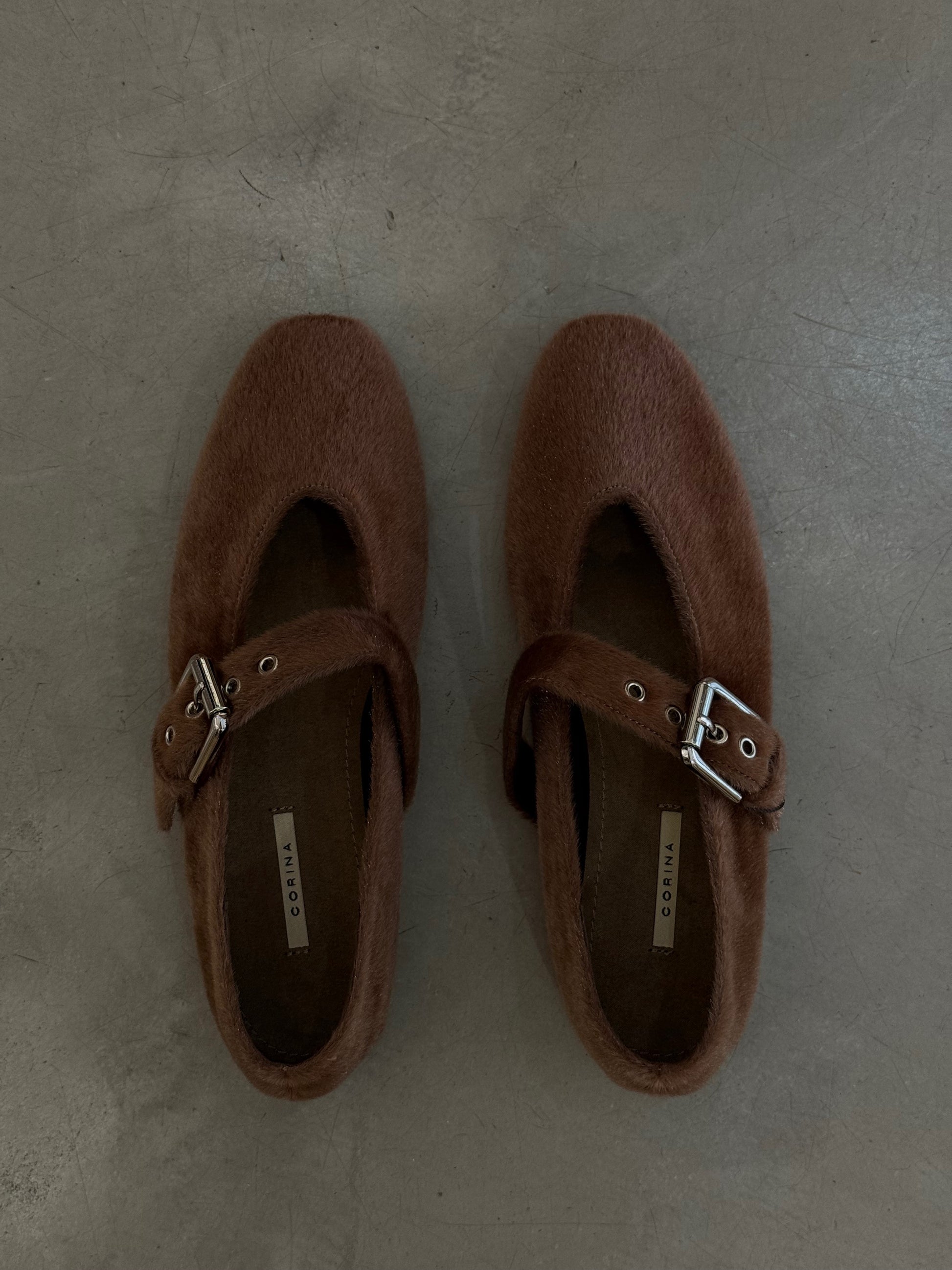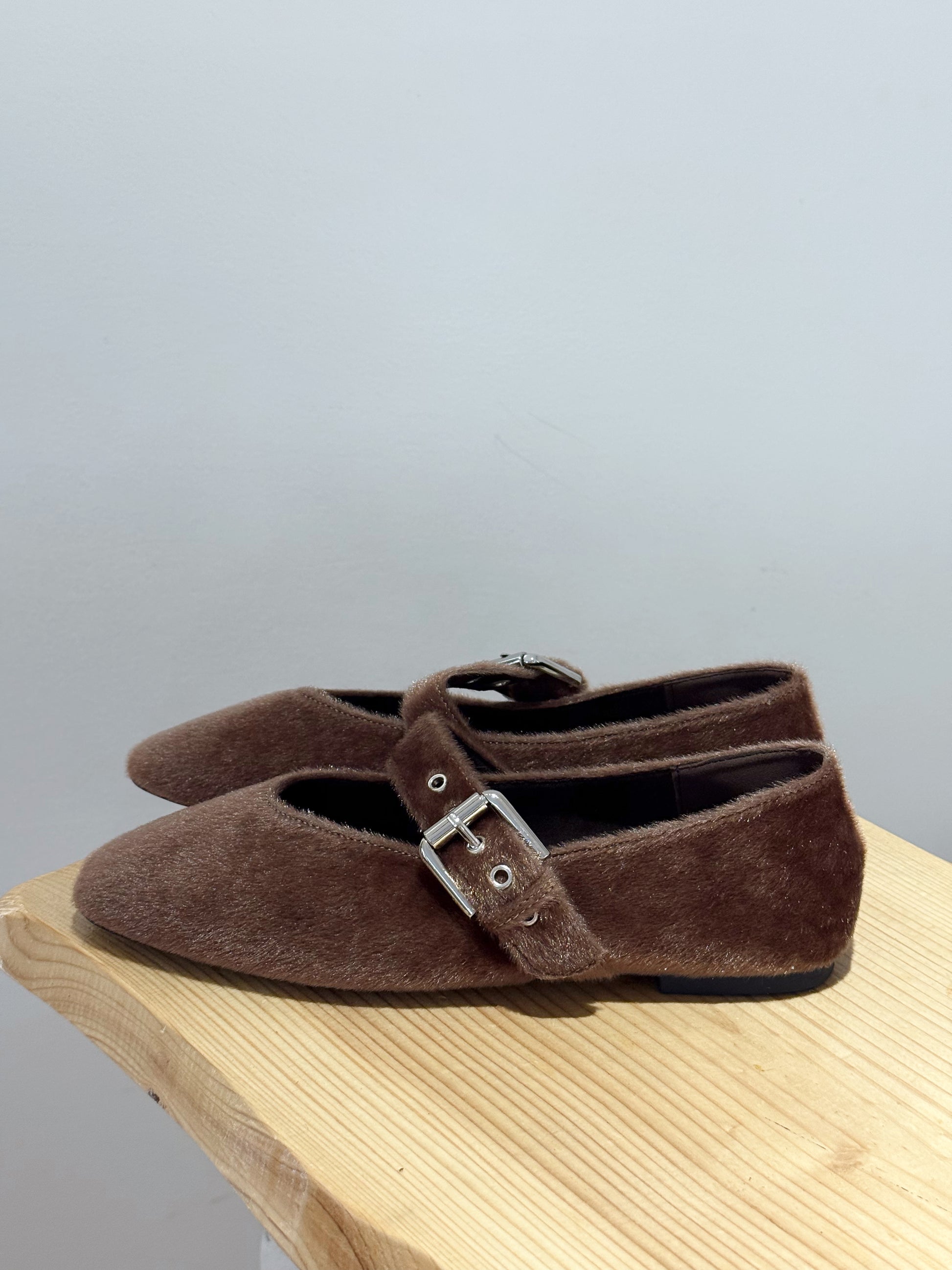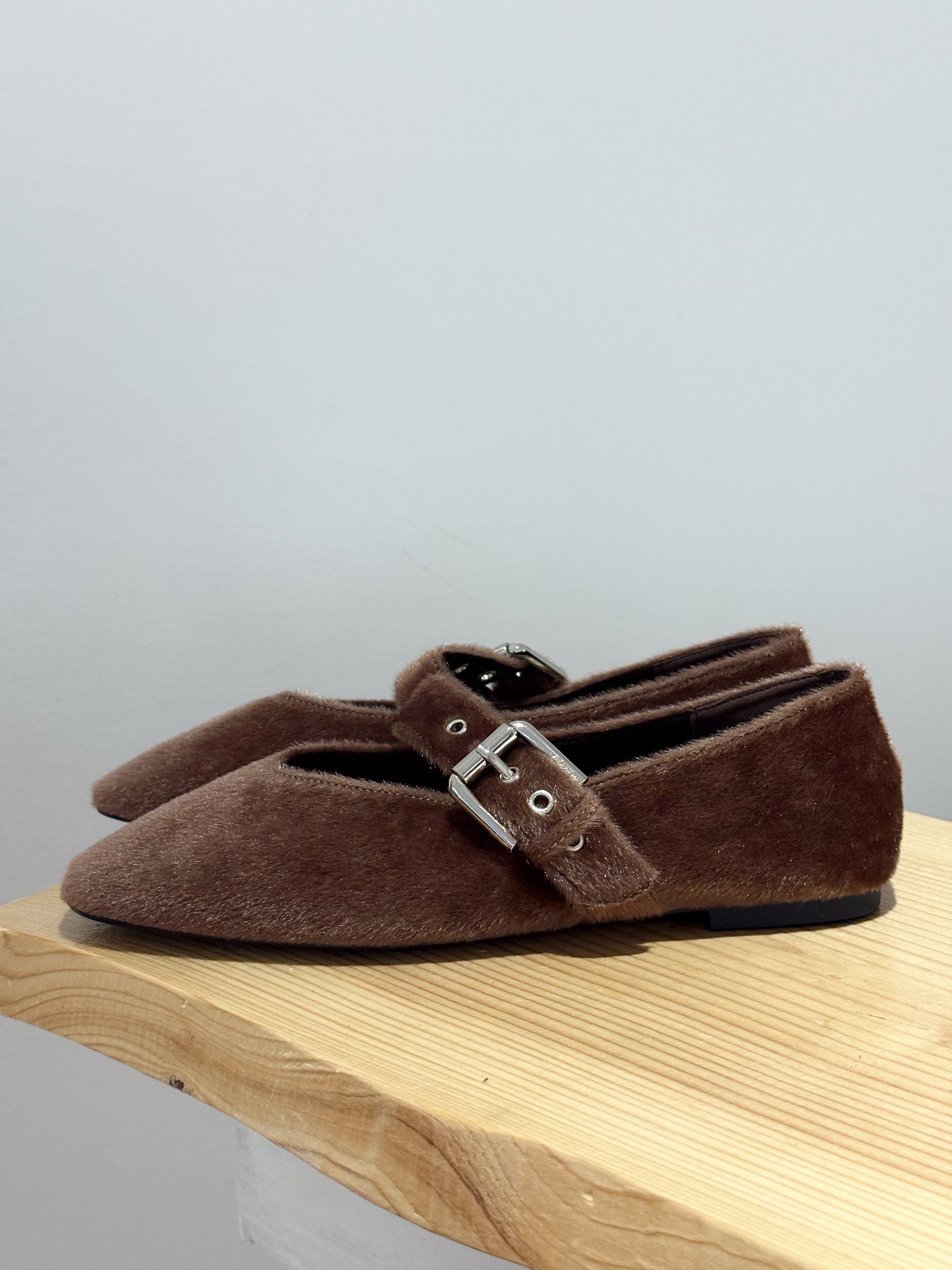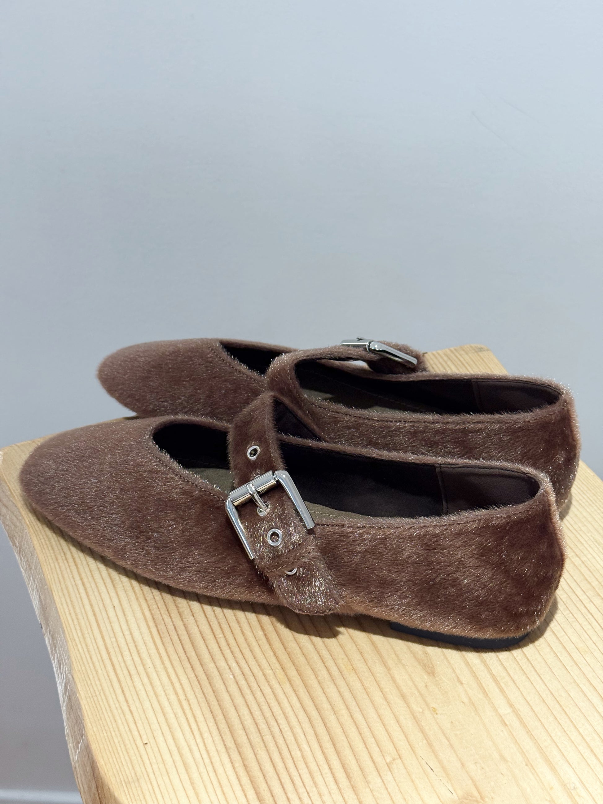Bailarina de pelo sintético marrón con hebilla en plteado.
