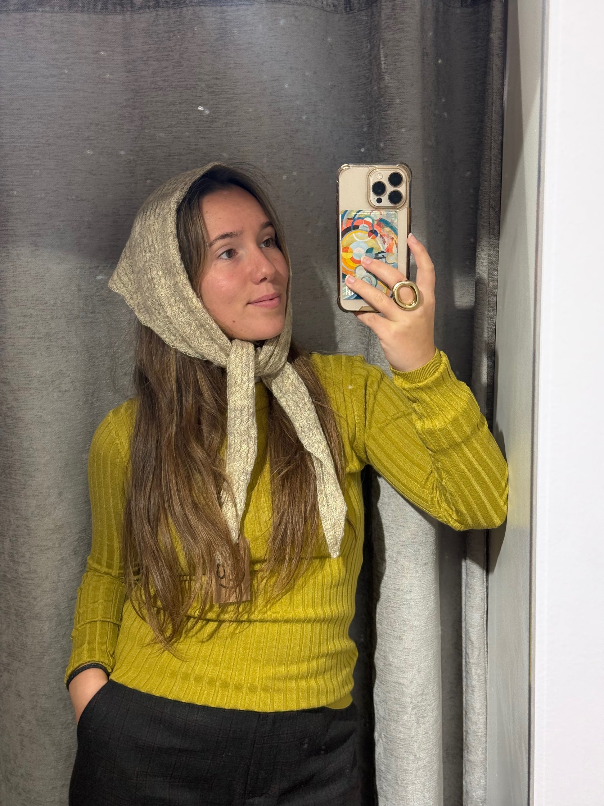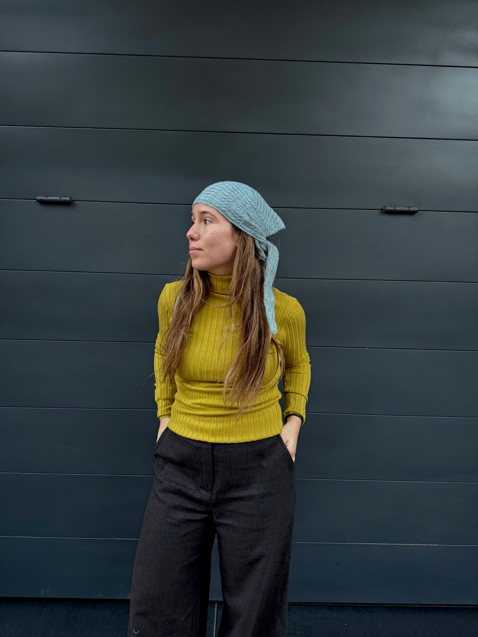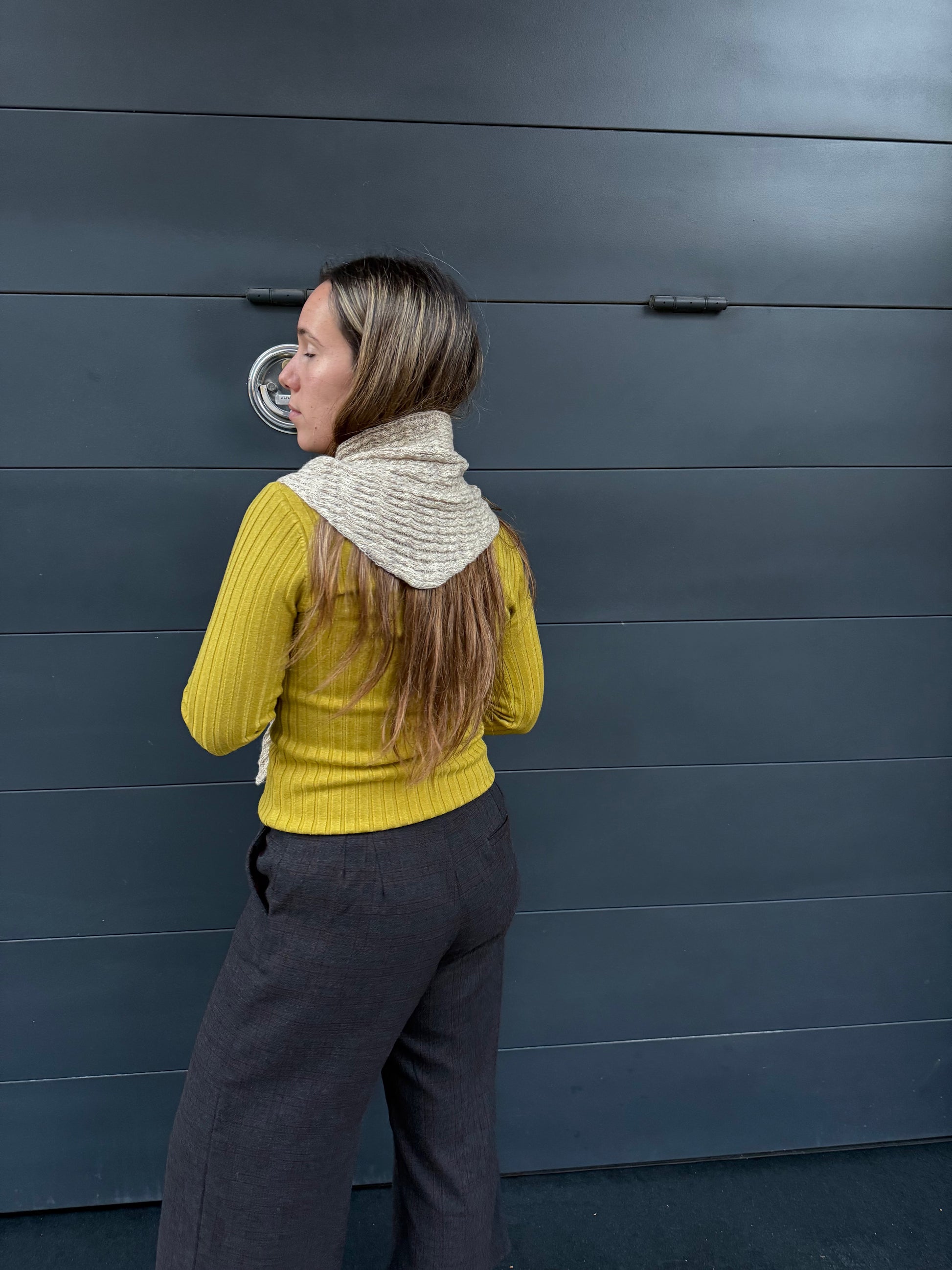 Bandana de punto en forma triangular, en diferentes tejidos y colores. Para cuello o pelo, multi posiciones.