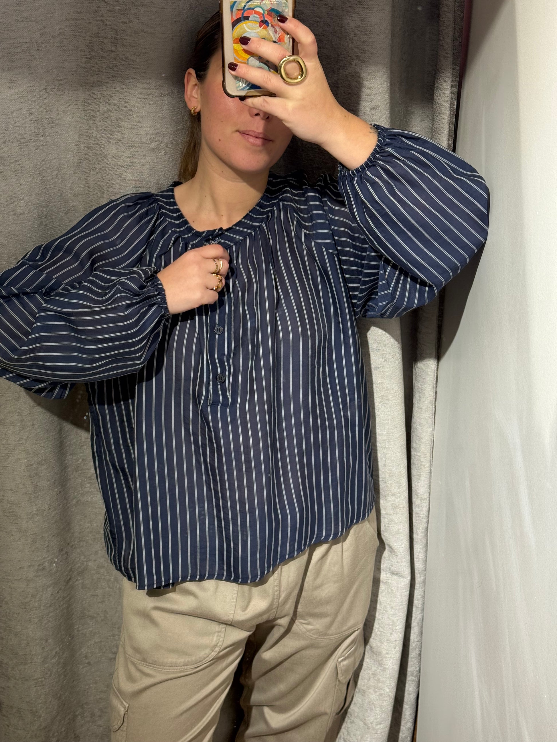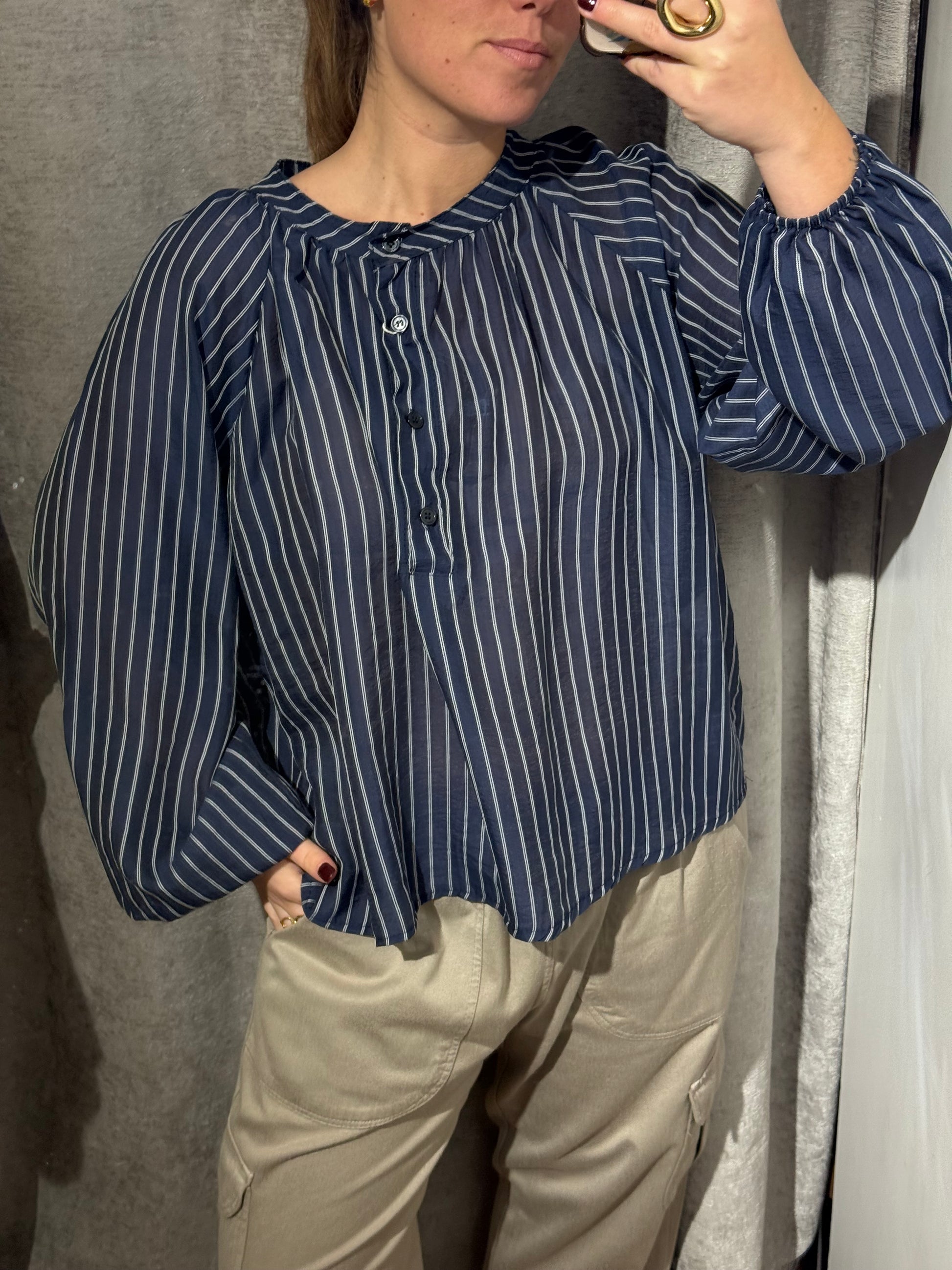 Blusa de rayas con botones en el cuello. Con mangas abullonadas.