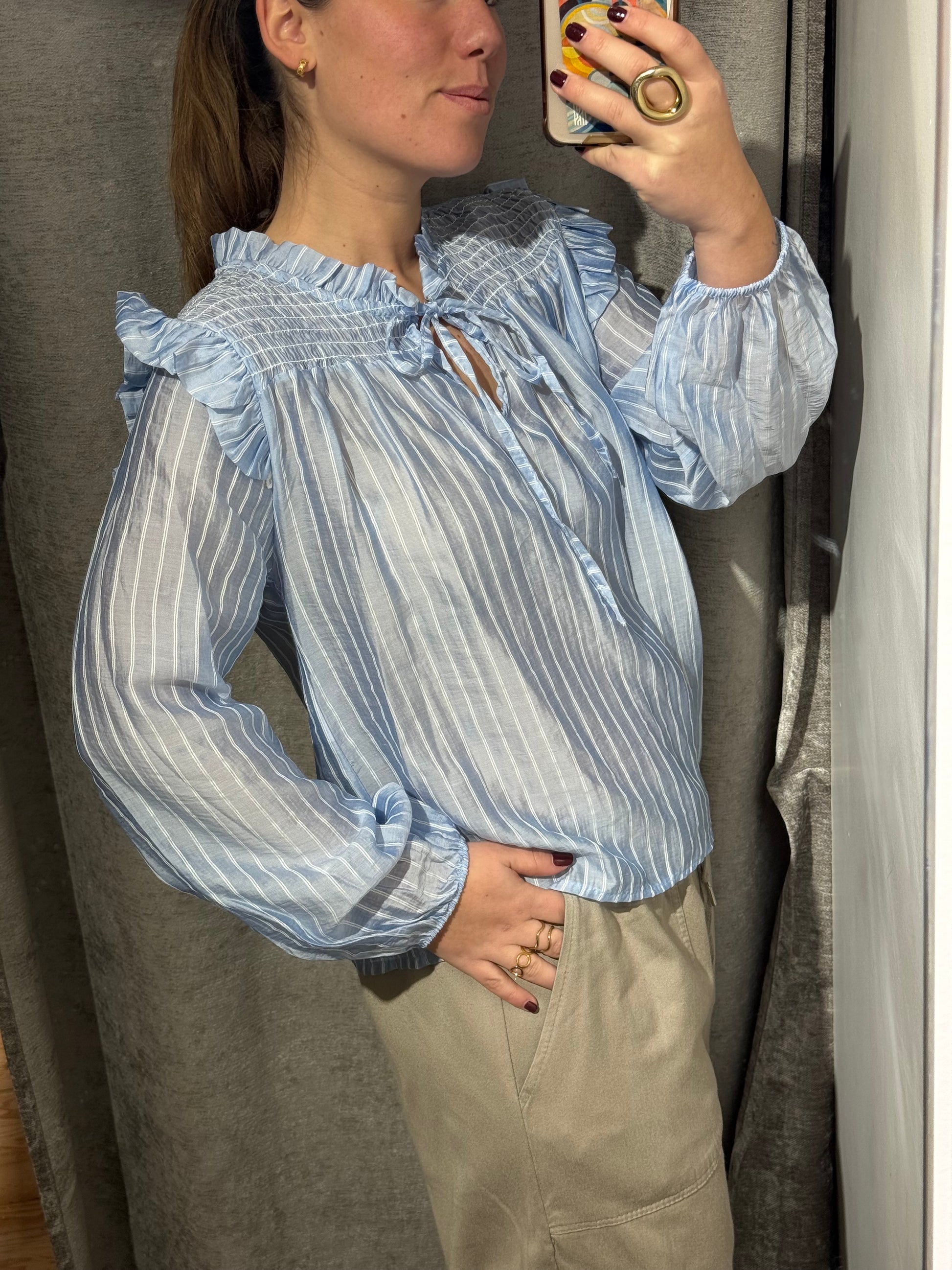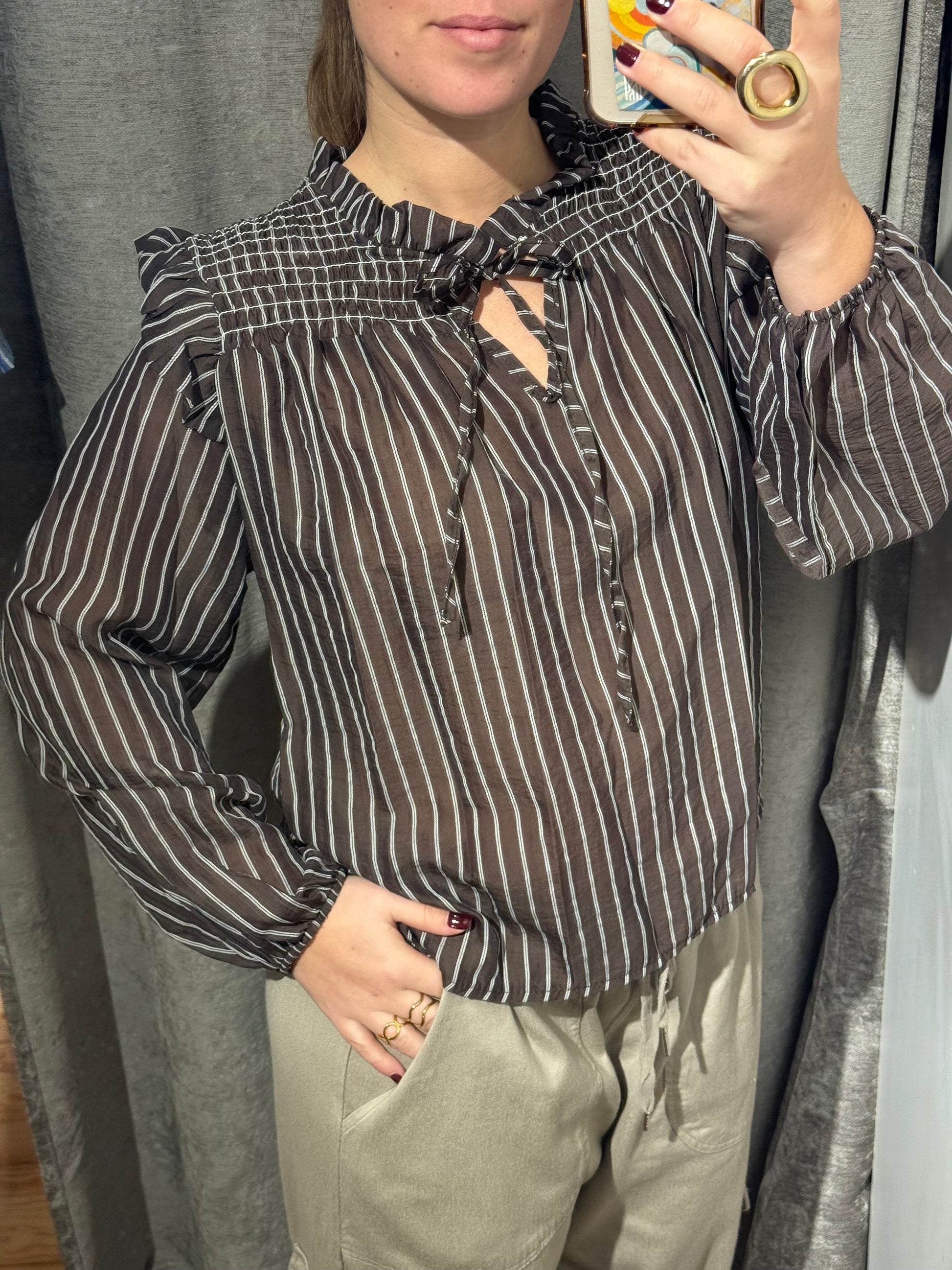 Blusa fina semi transparente con rayas finas, con volante en el hombro y en el cuello.