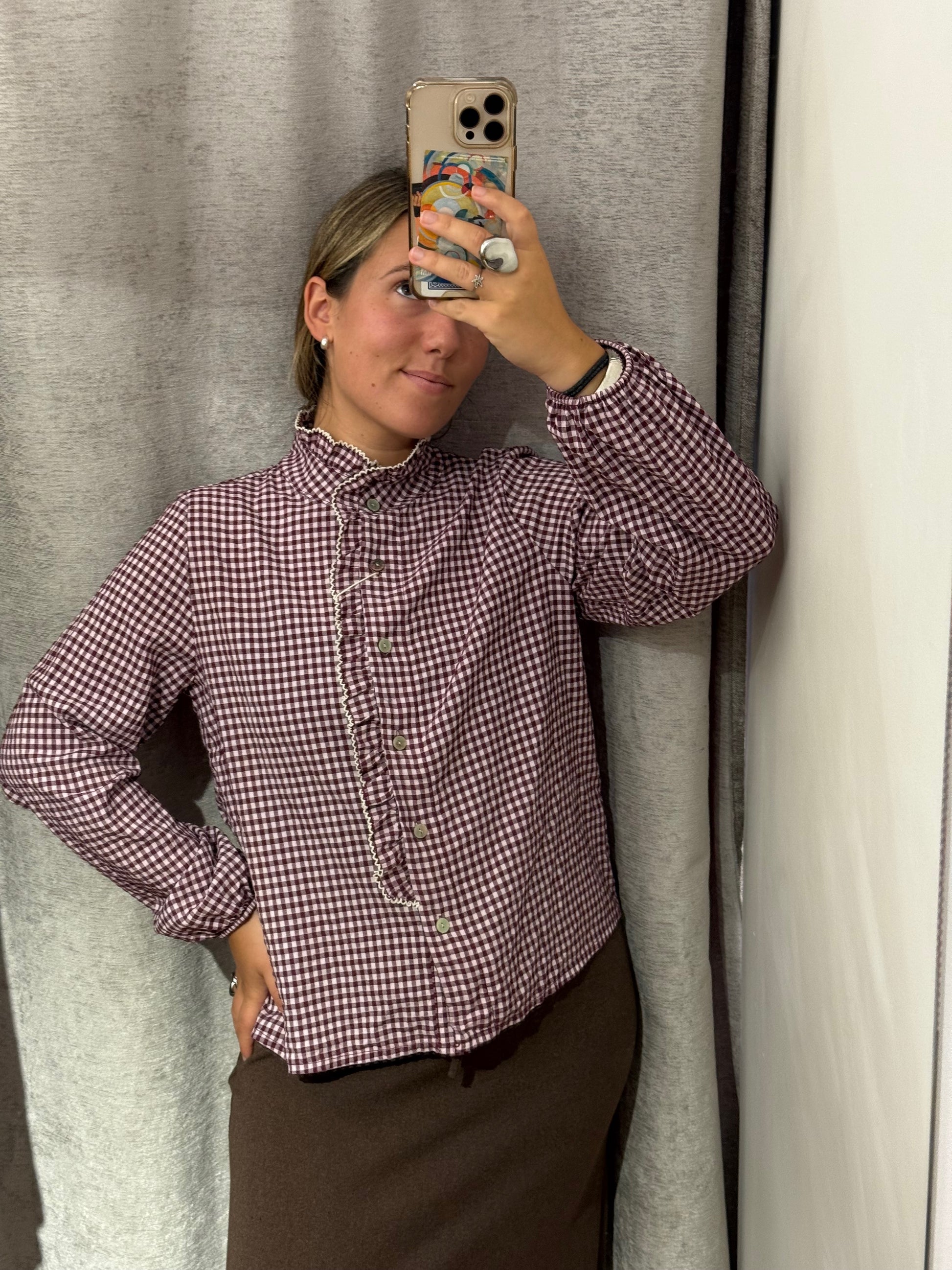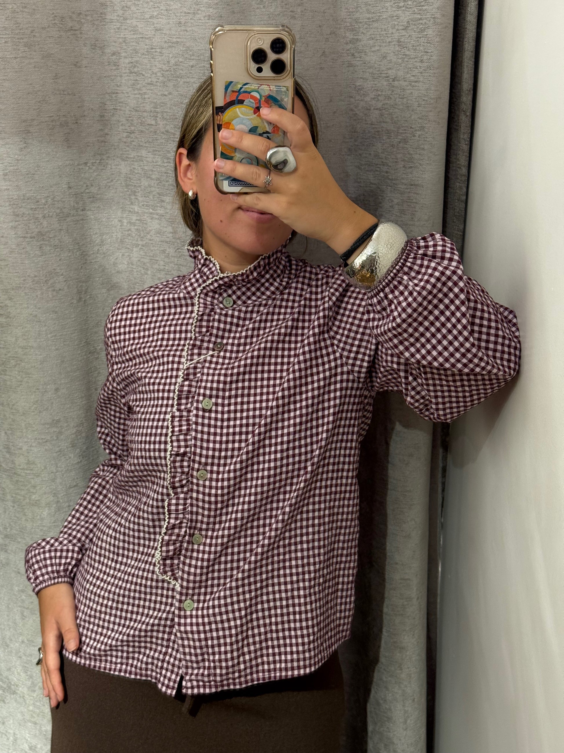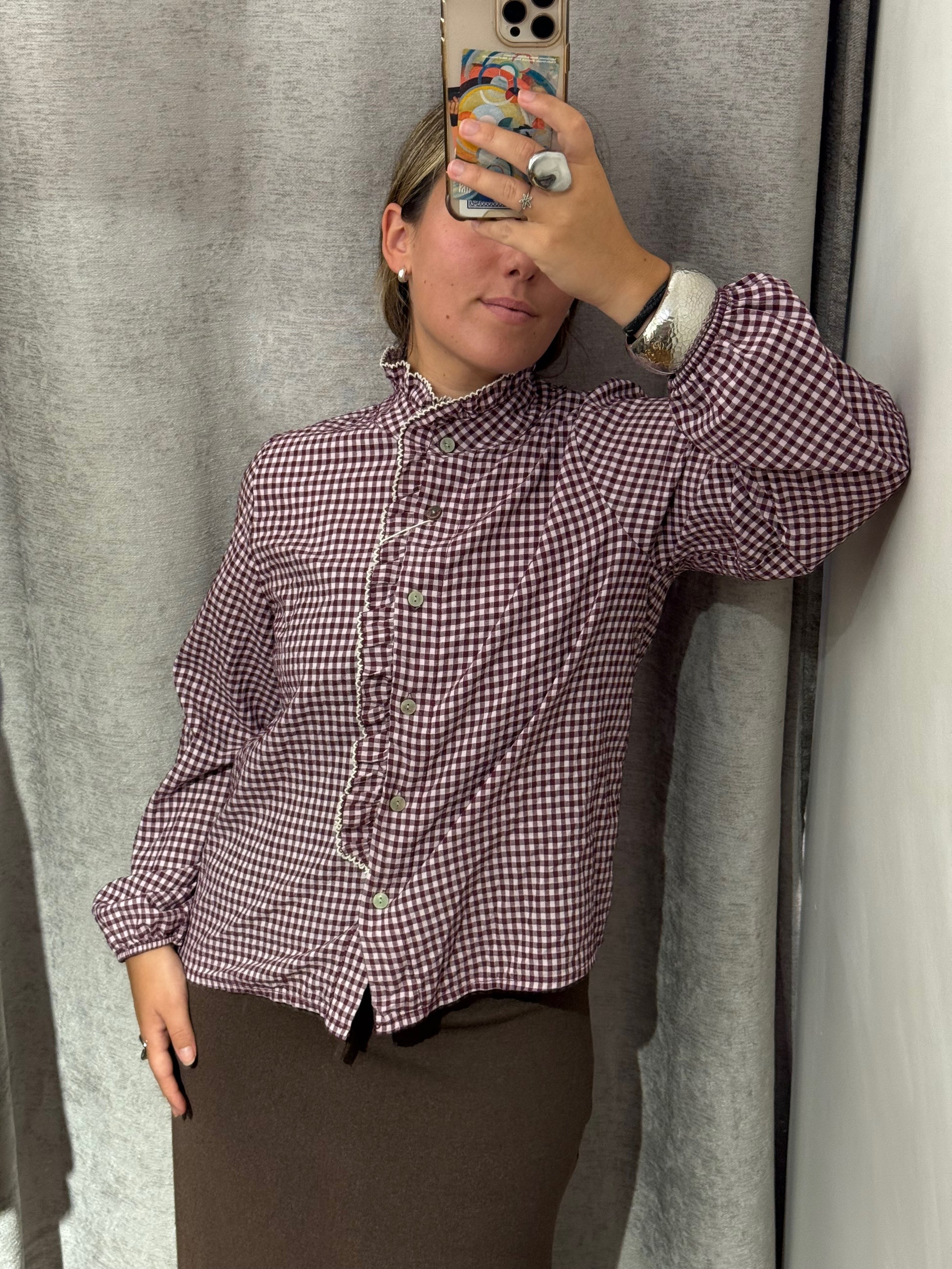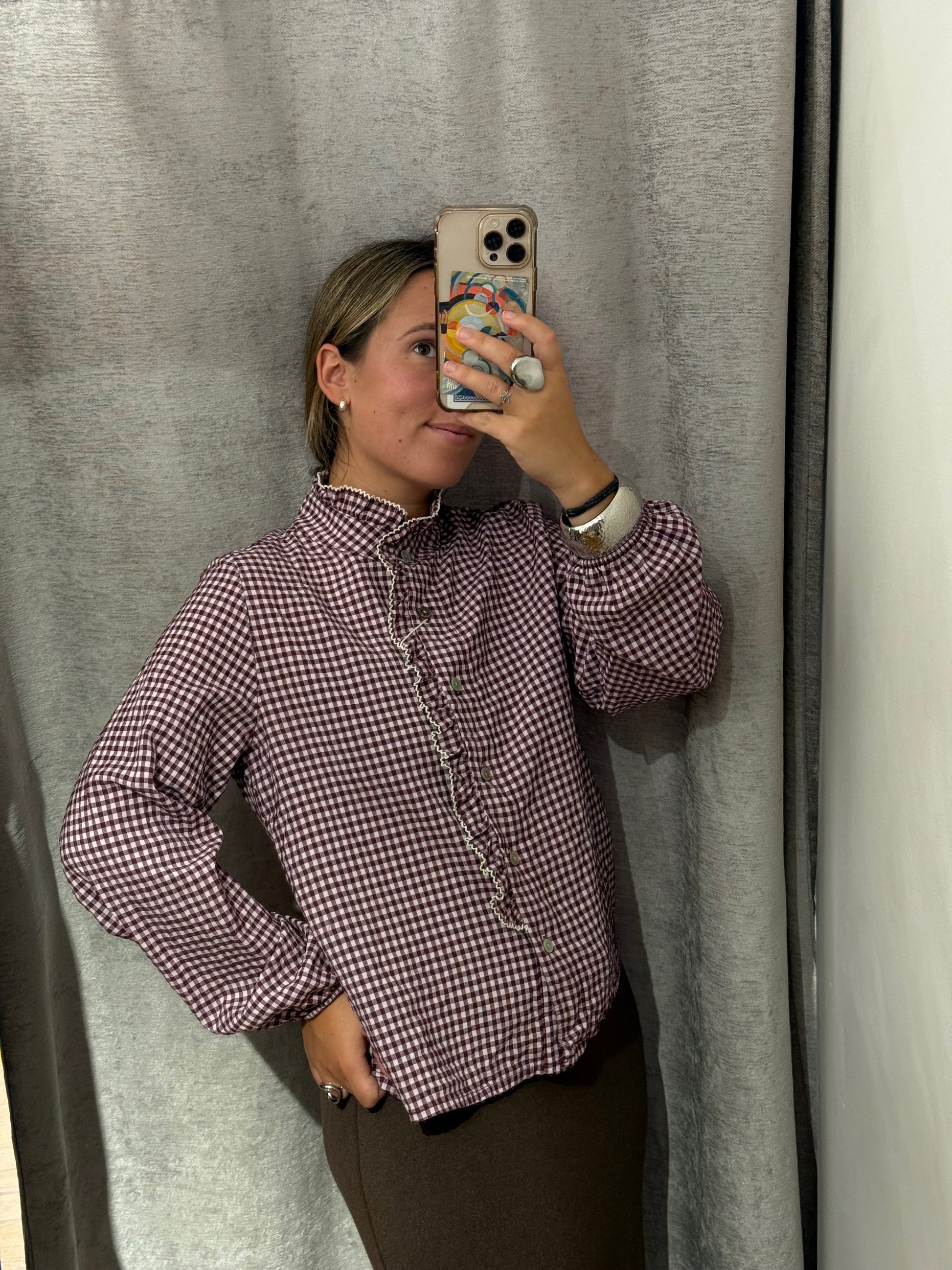 Blusa en estampado cuadro vichy con botones y volante del centro al cuello.