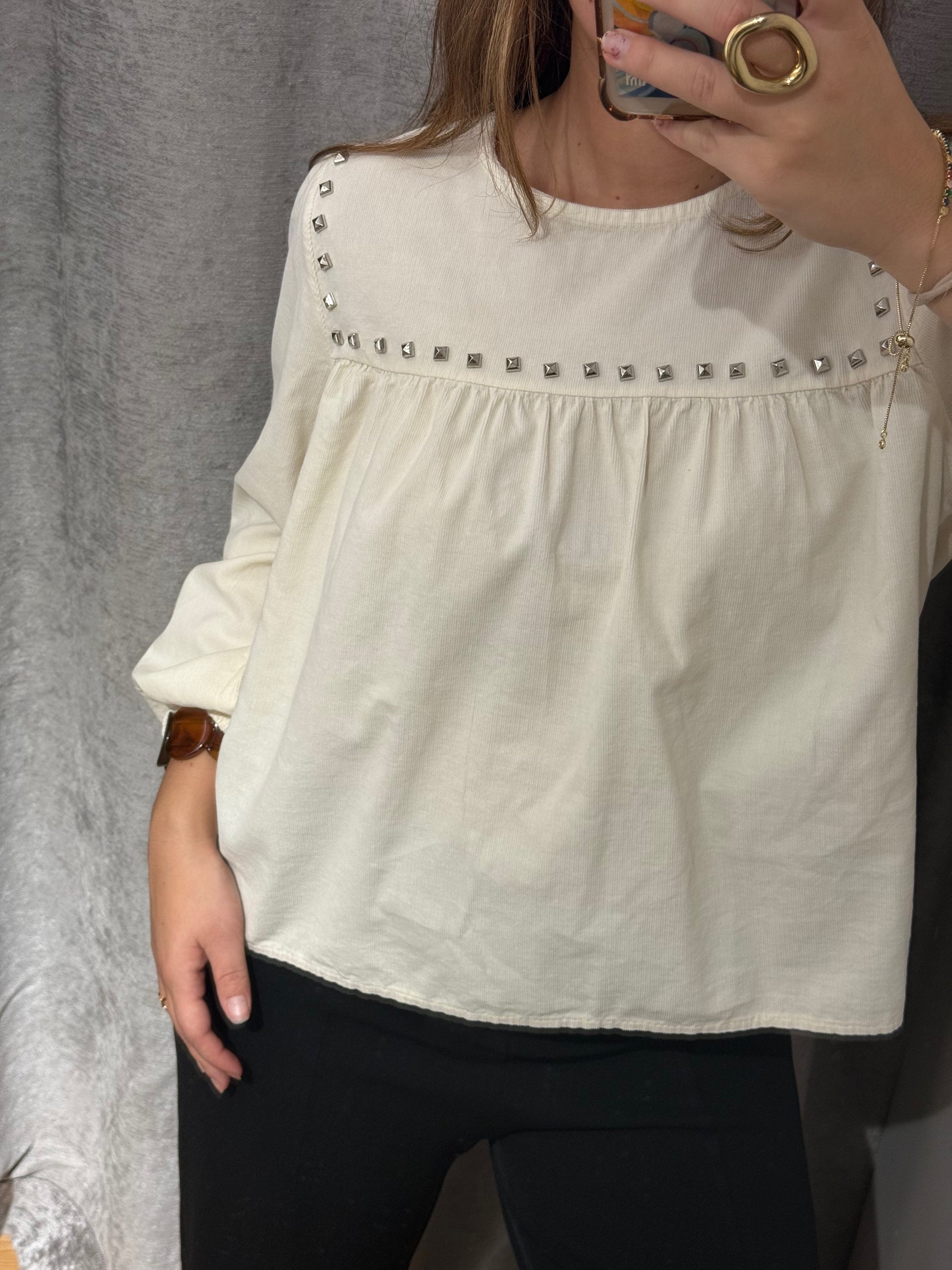 Blusa cuadrada de micropana con manga abullonada en el puño y tachuelas en la parte superior.