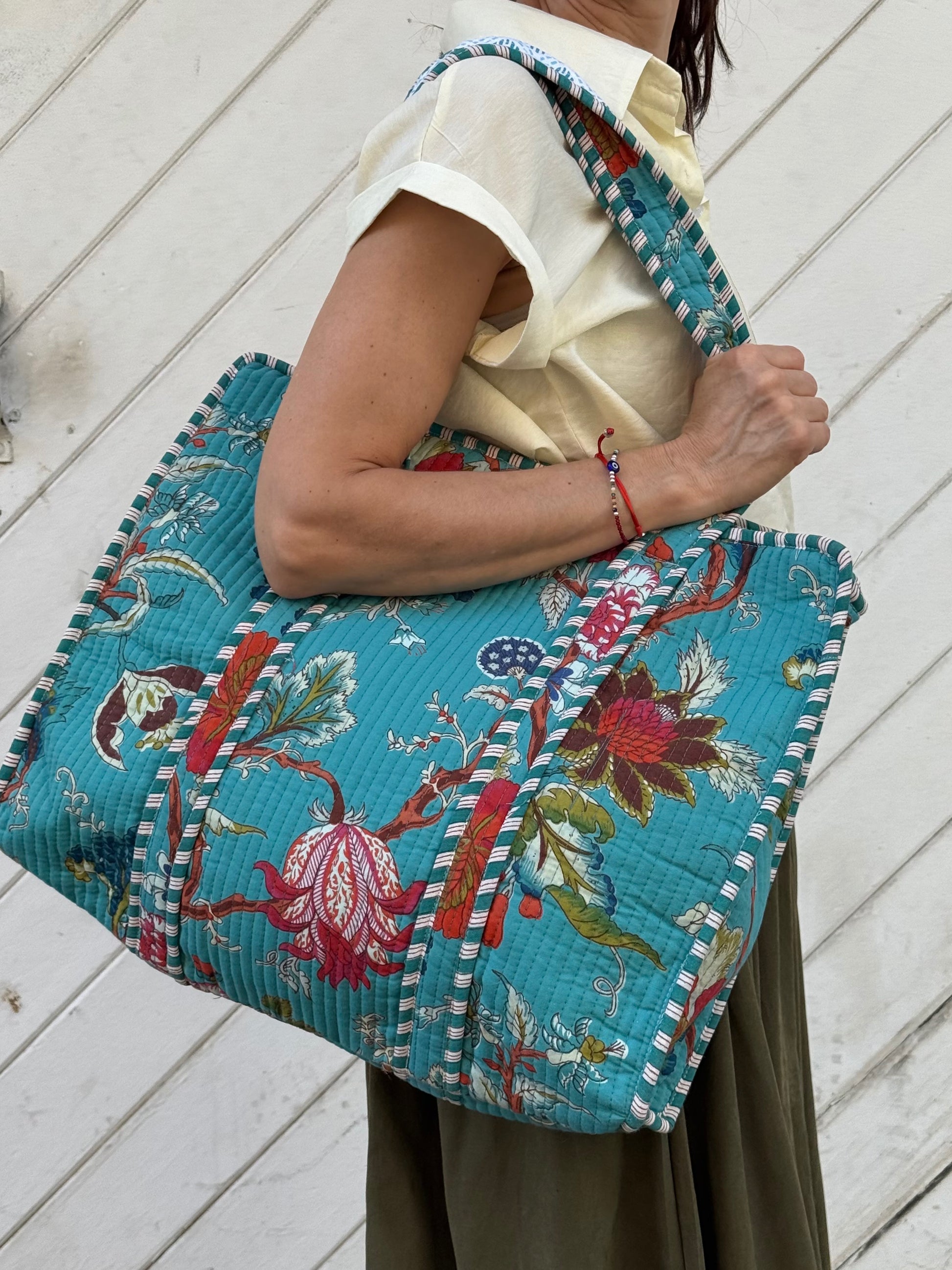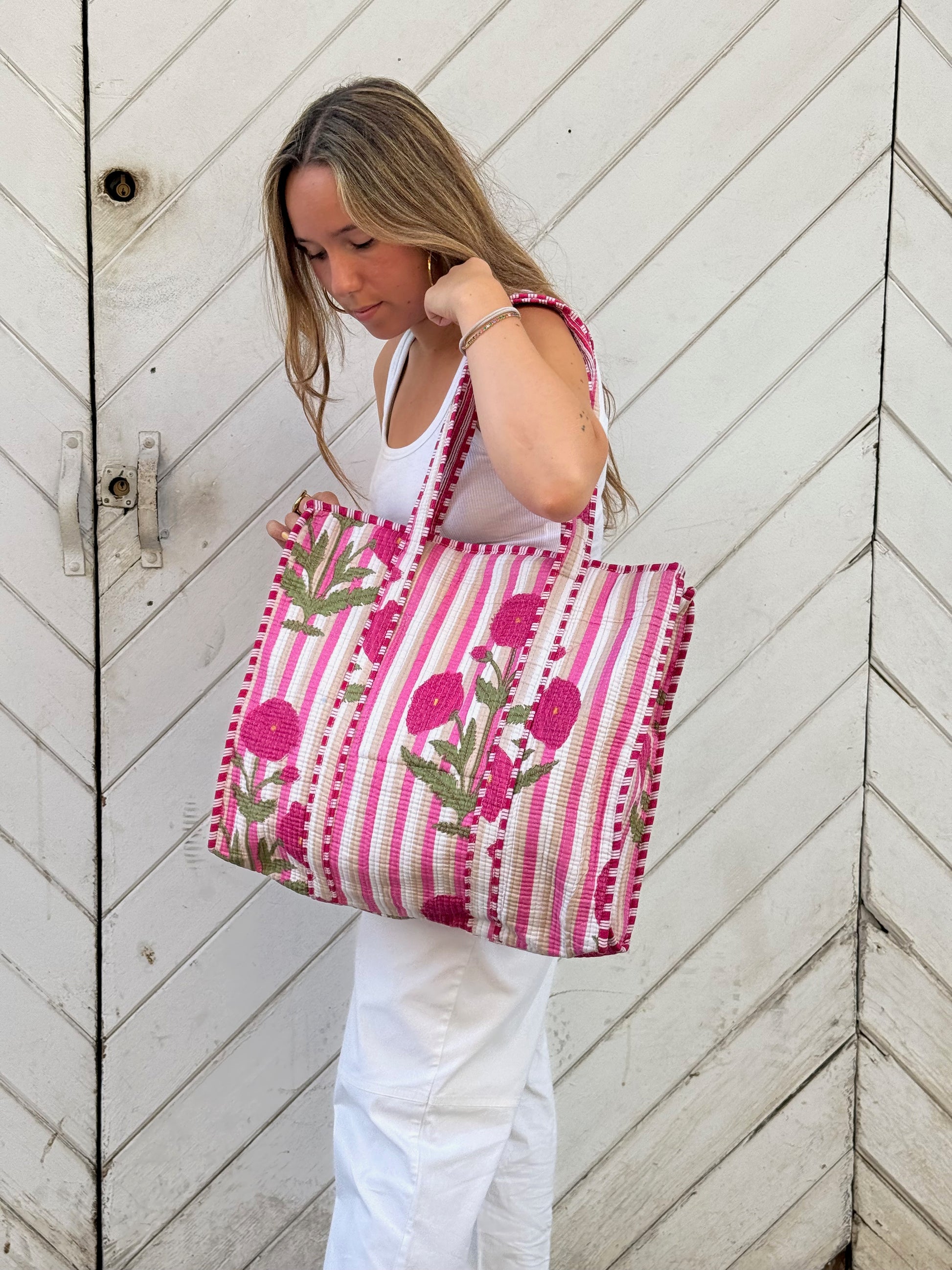 Bolsa de tela estampada en rayas tonos rojos y palmeras. Con cremallera.