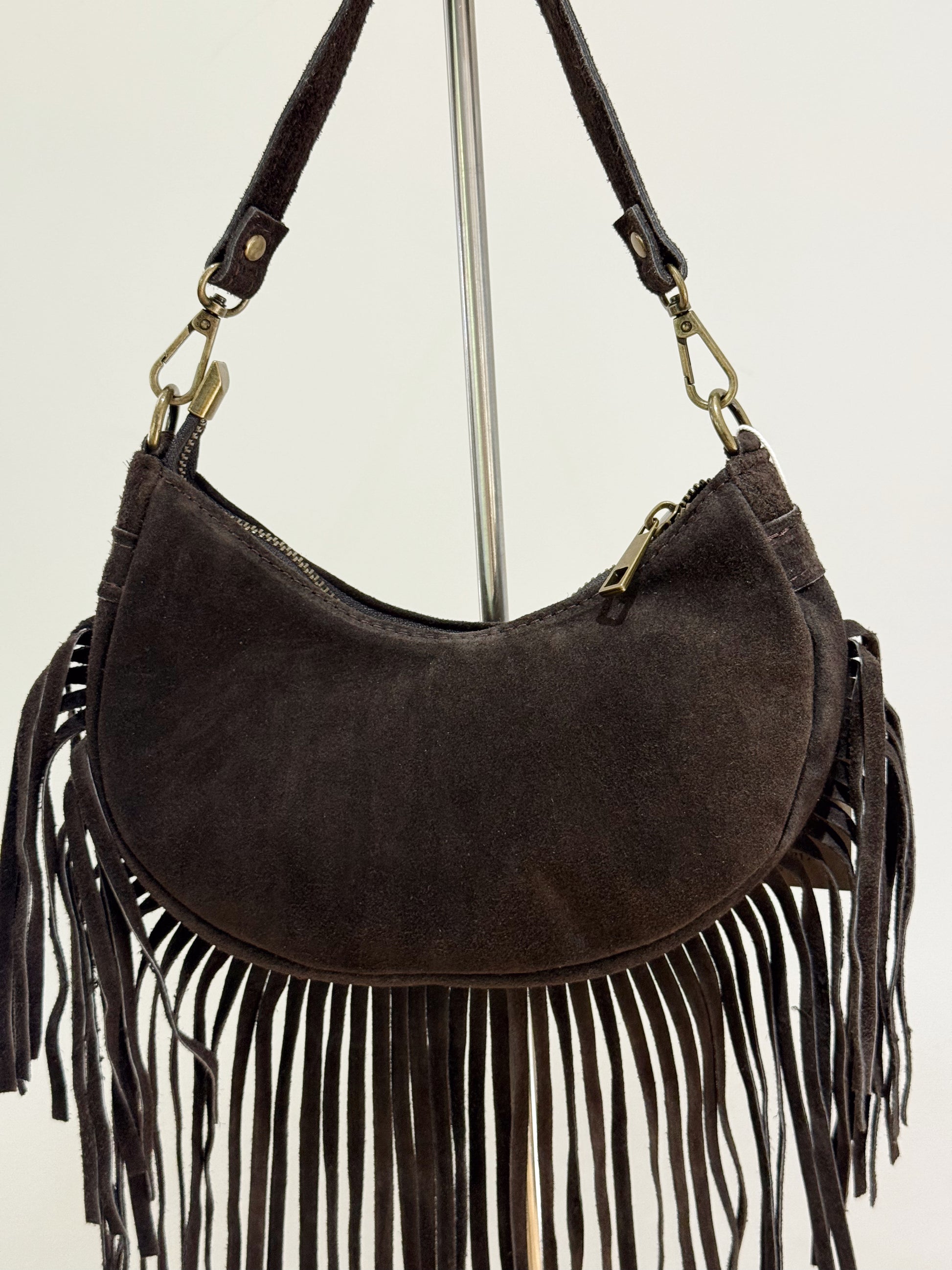 Bolso de piel pequeño, con la base de flecos. Asa corta y asa larga adaptable.