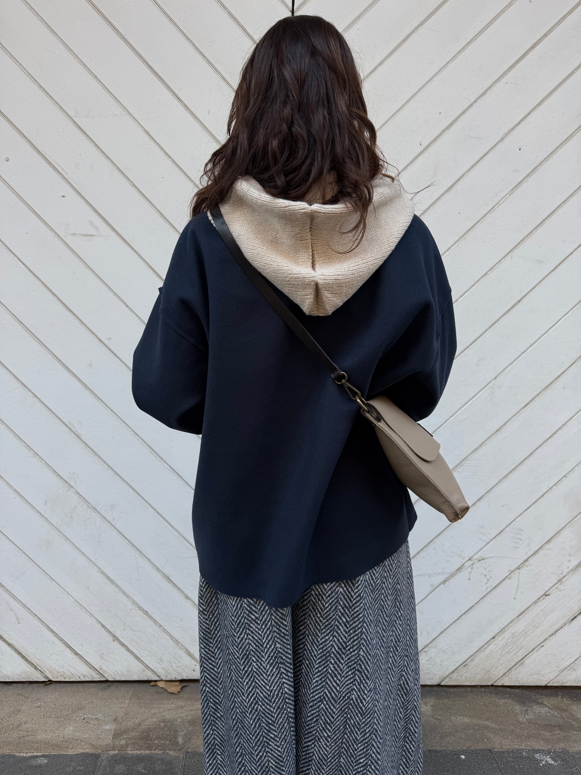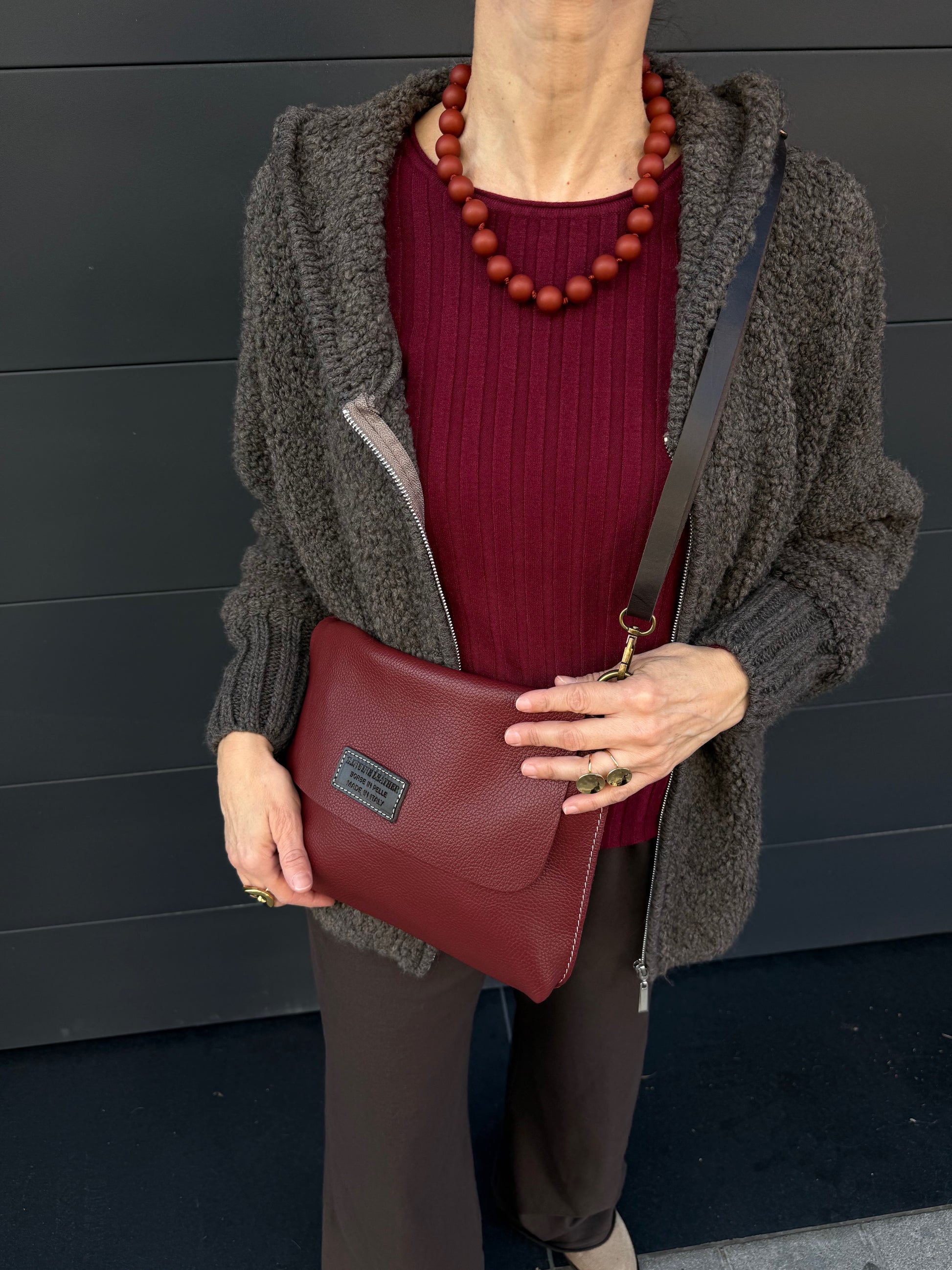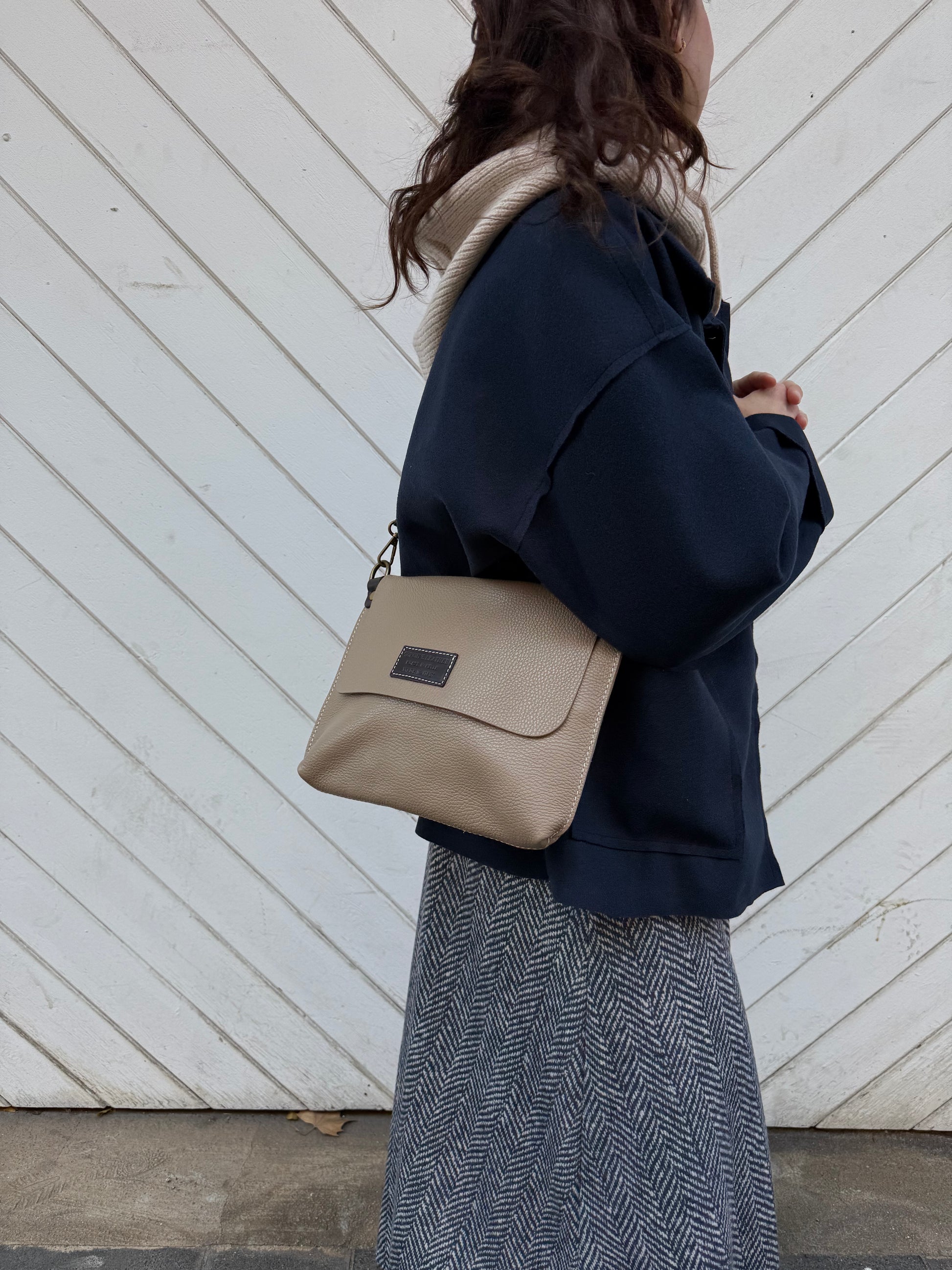 Bolso rectangular pequeño de piel, con solapa y cremallera. Cinta adaptable.