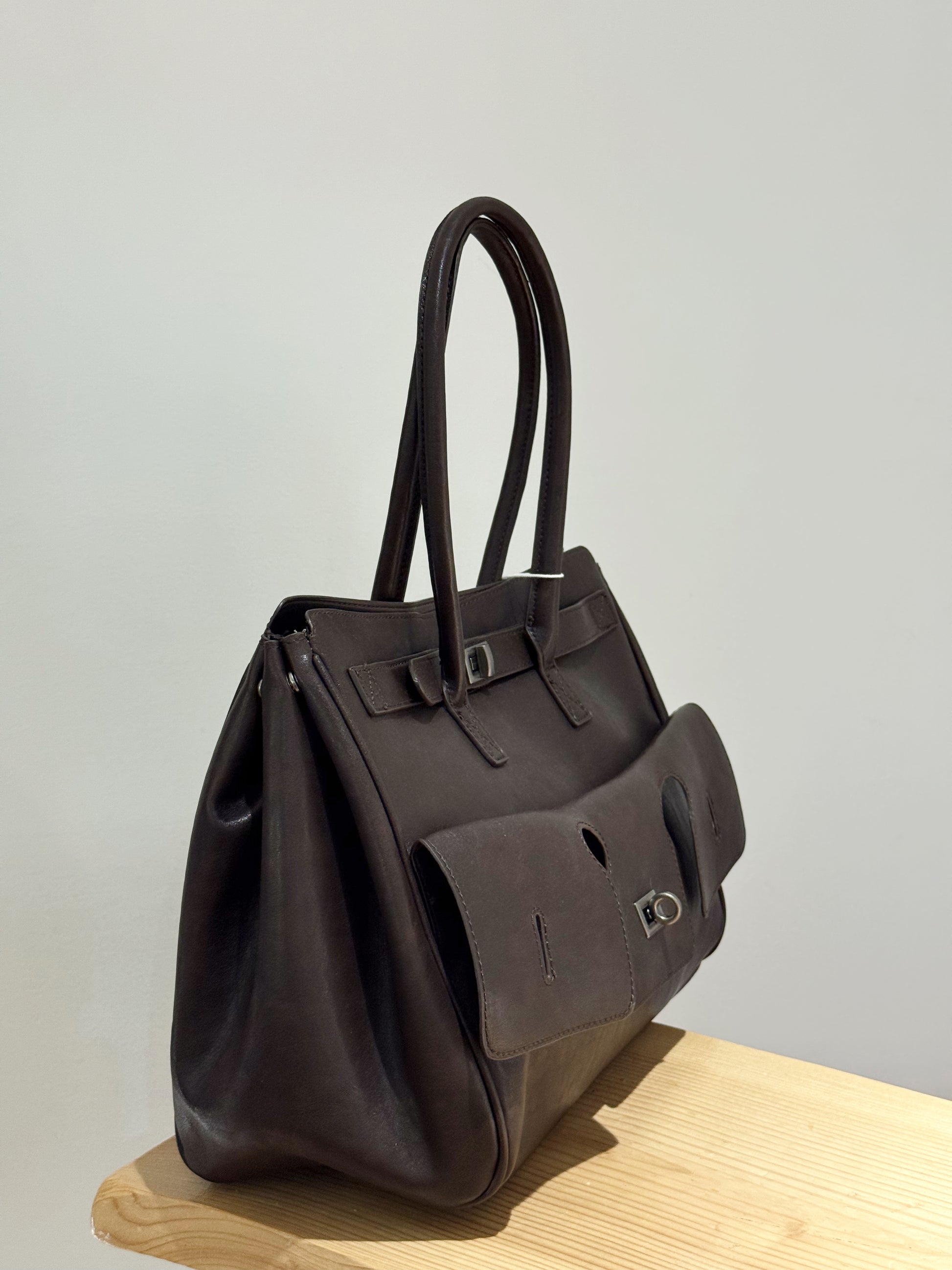 Bolso grande rígido. Con bolsillos en el exterior y asa de hombros.