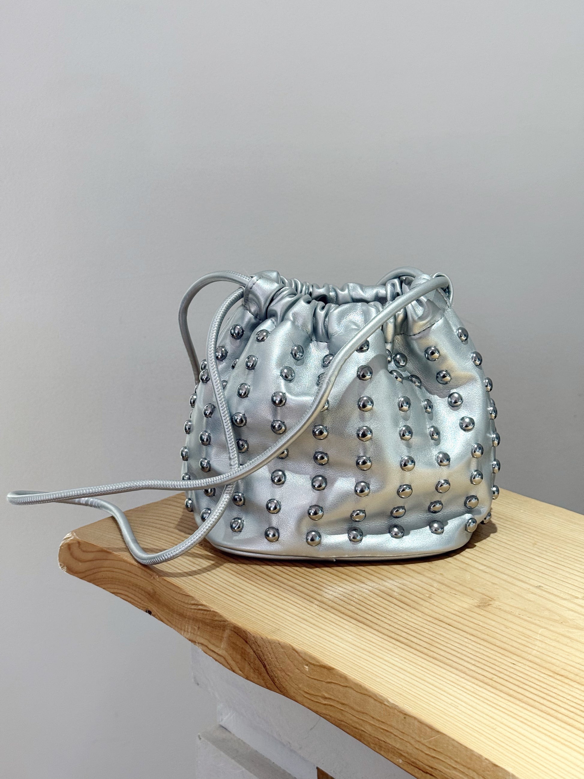 Bolso tipo bombonera de polipiel con tachuelas plateadas. Asa larga.