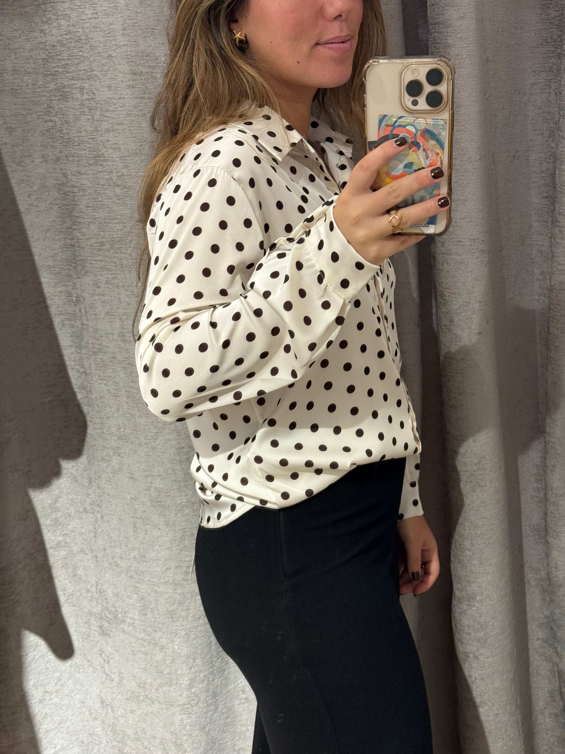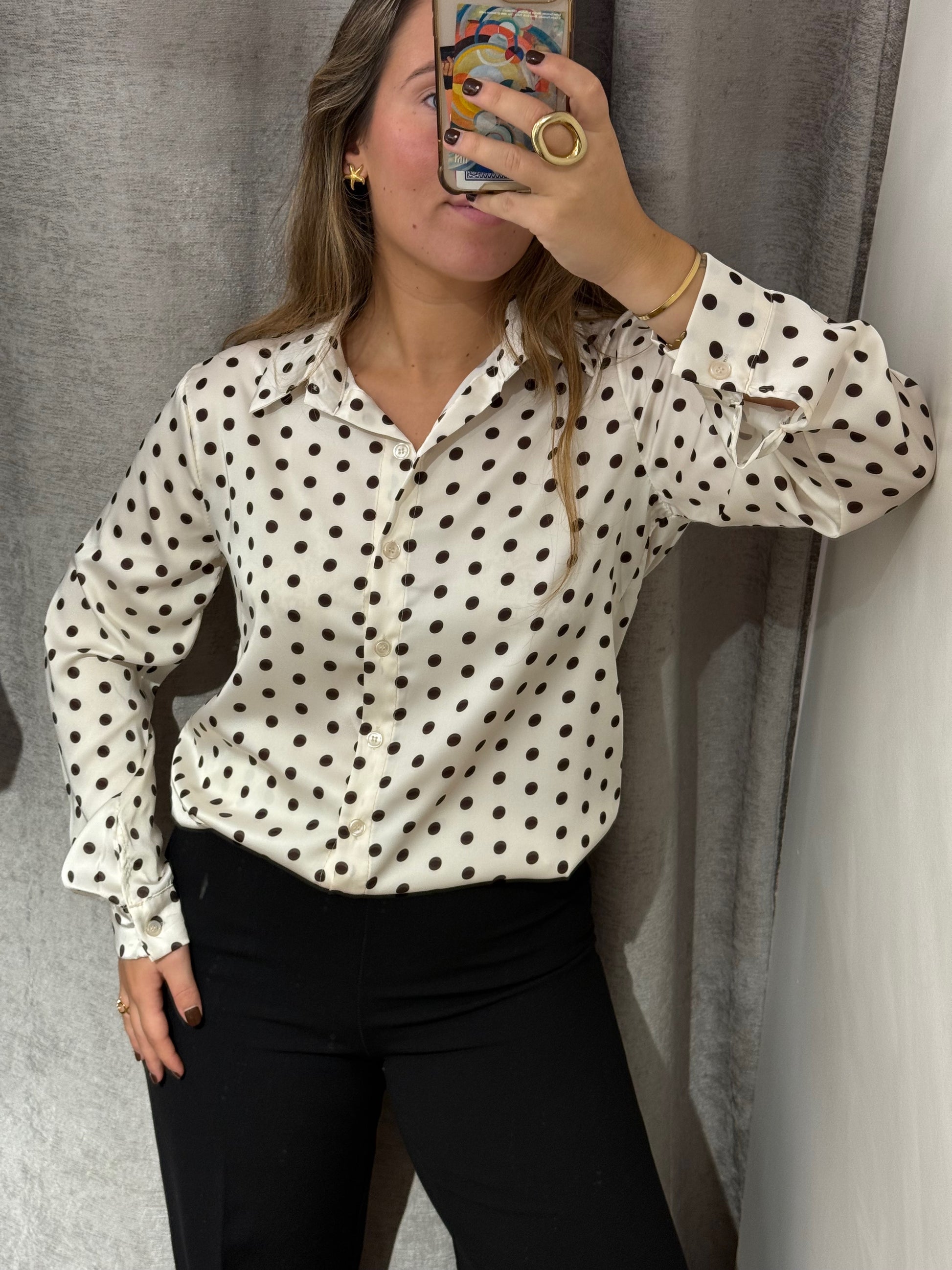 Camisa de raso en blanco roto con estampado de topos en chocolate.