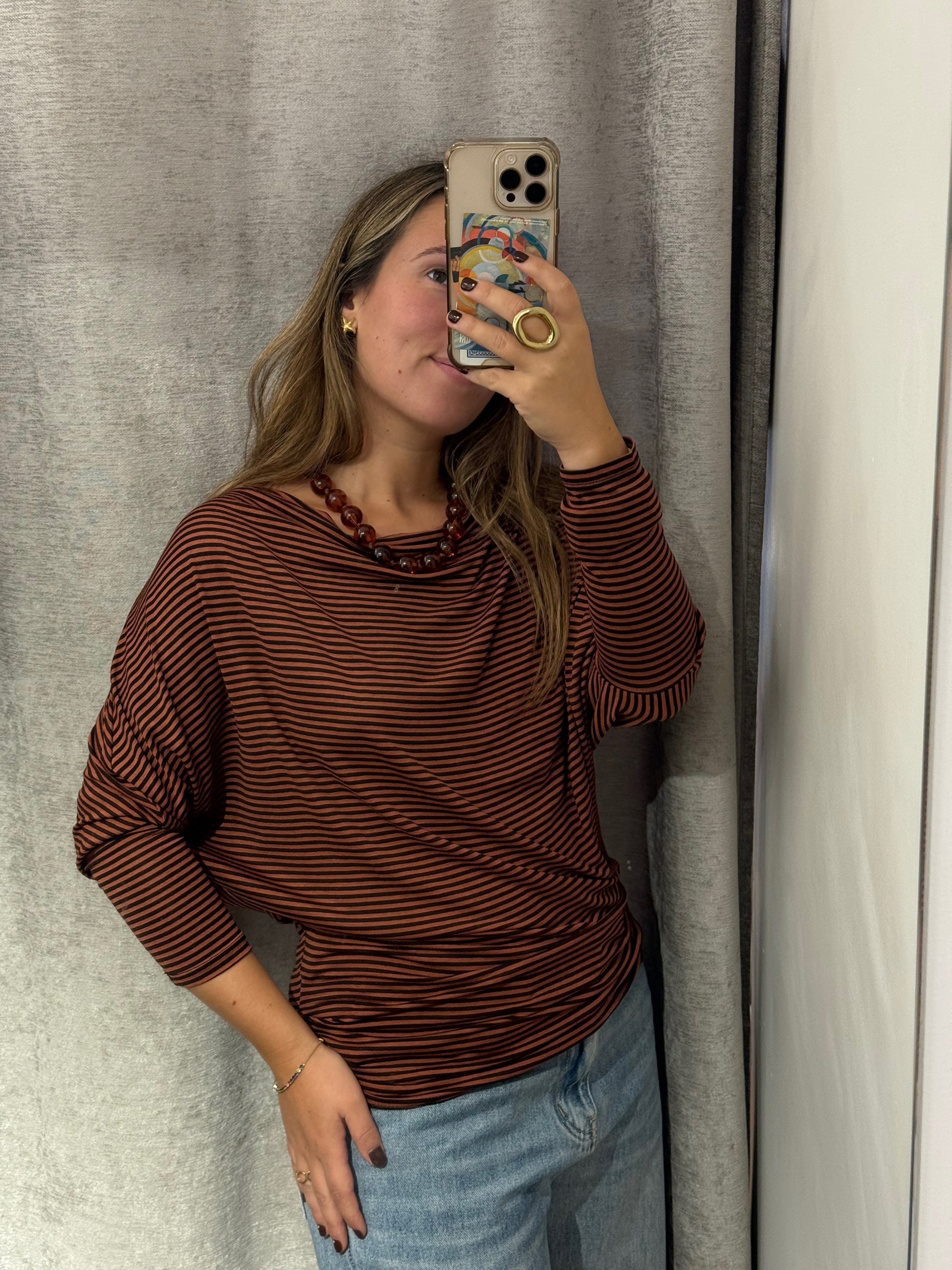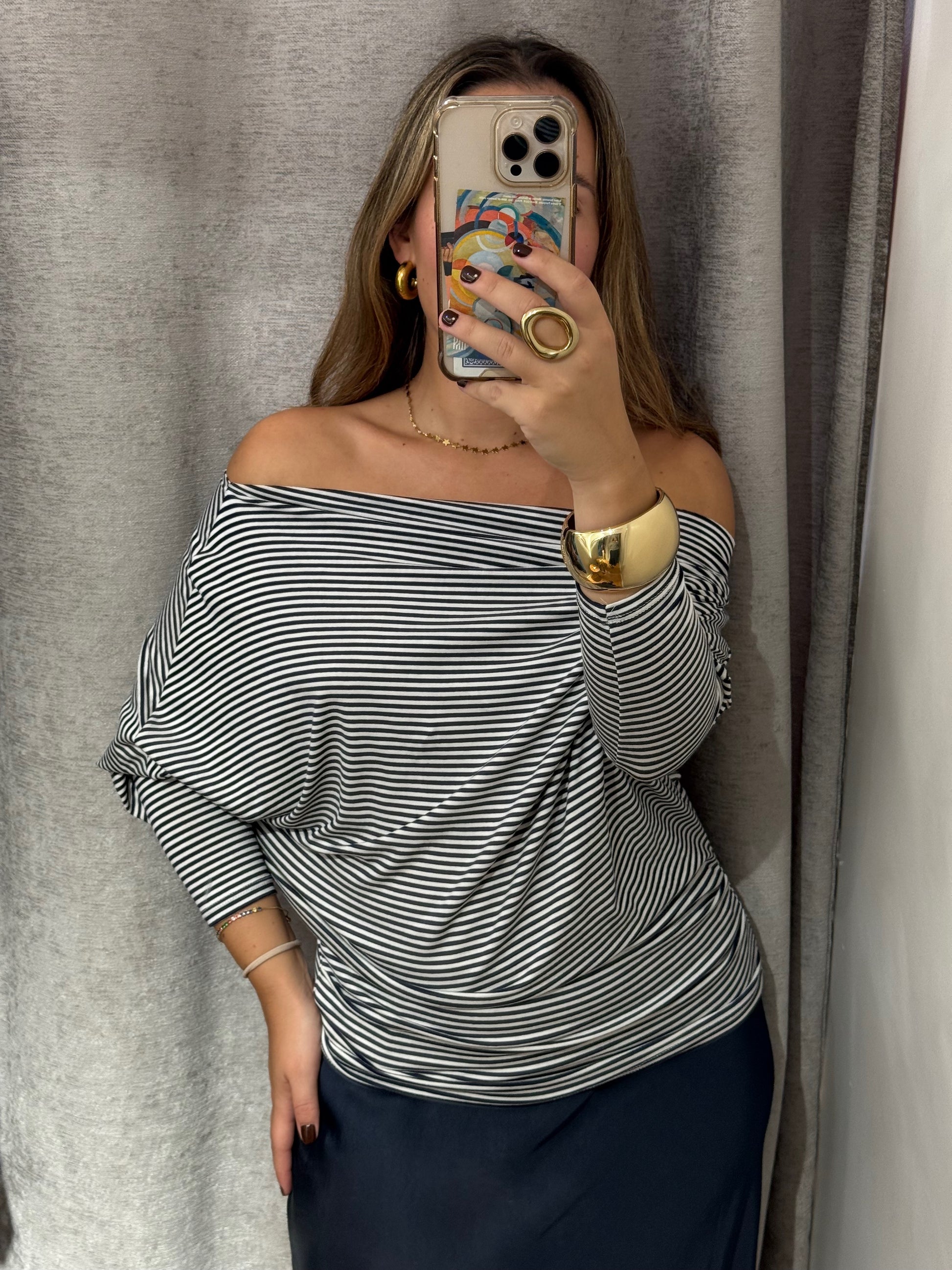 Camiseta fluida con multiposiciones, 1 hombro descubierto, 2 hombros descubiertos o escote caído. En estampado de rayas.