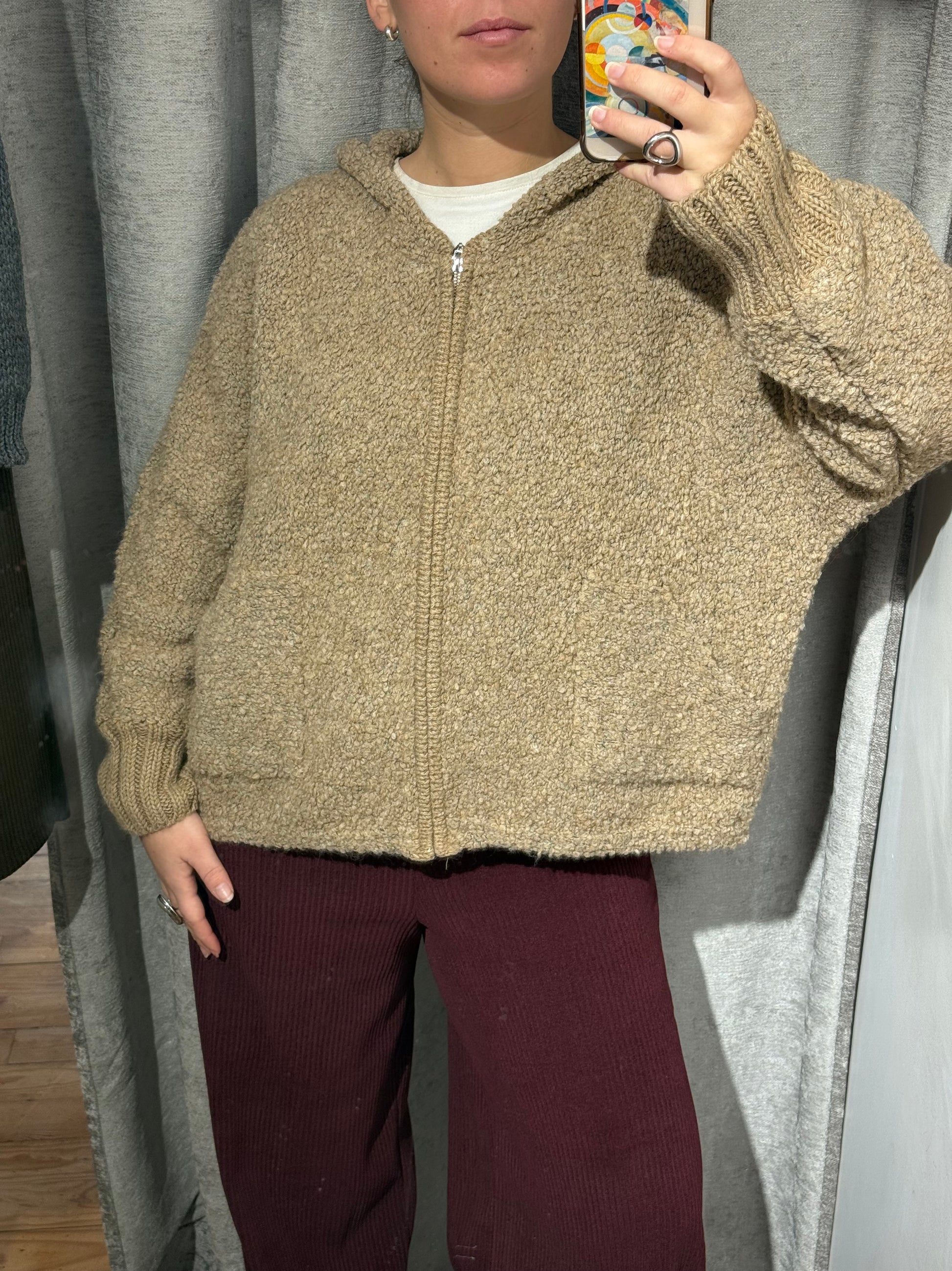 Chaqueta con cremallera y capucha tipo borreguito y bolsillos.