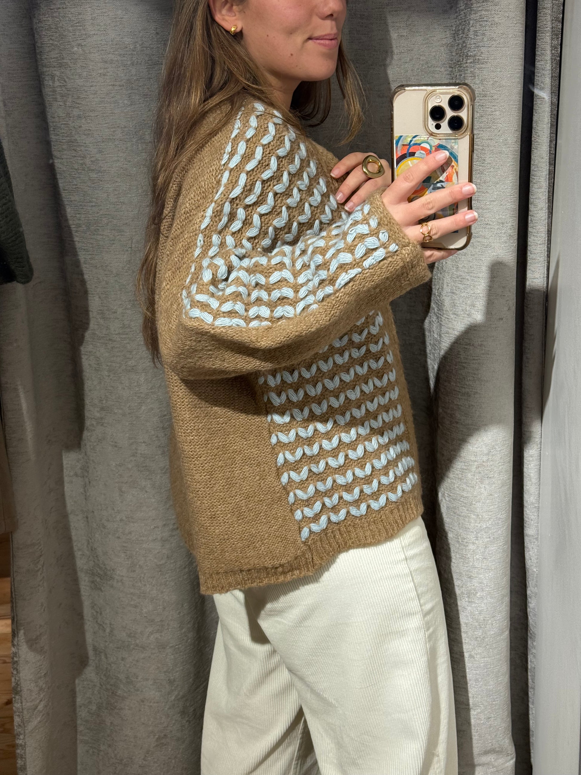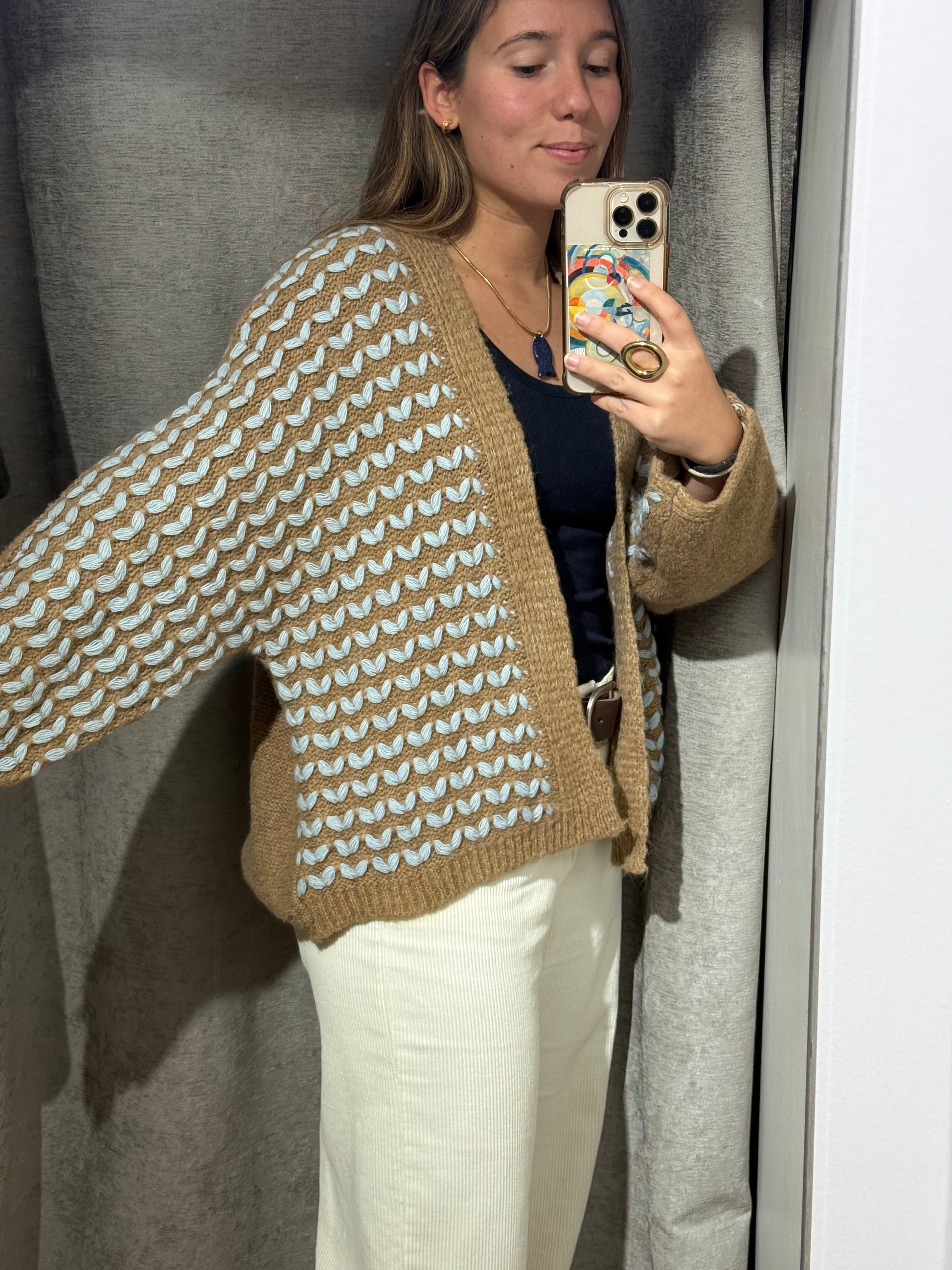 Chaqueta abierta en color camel con detalles tipo olas en azul celeste.