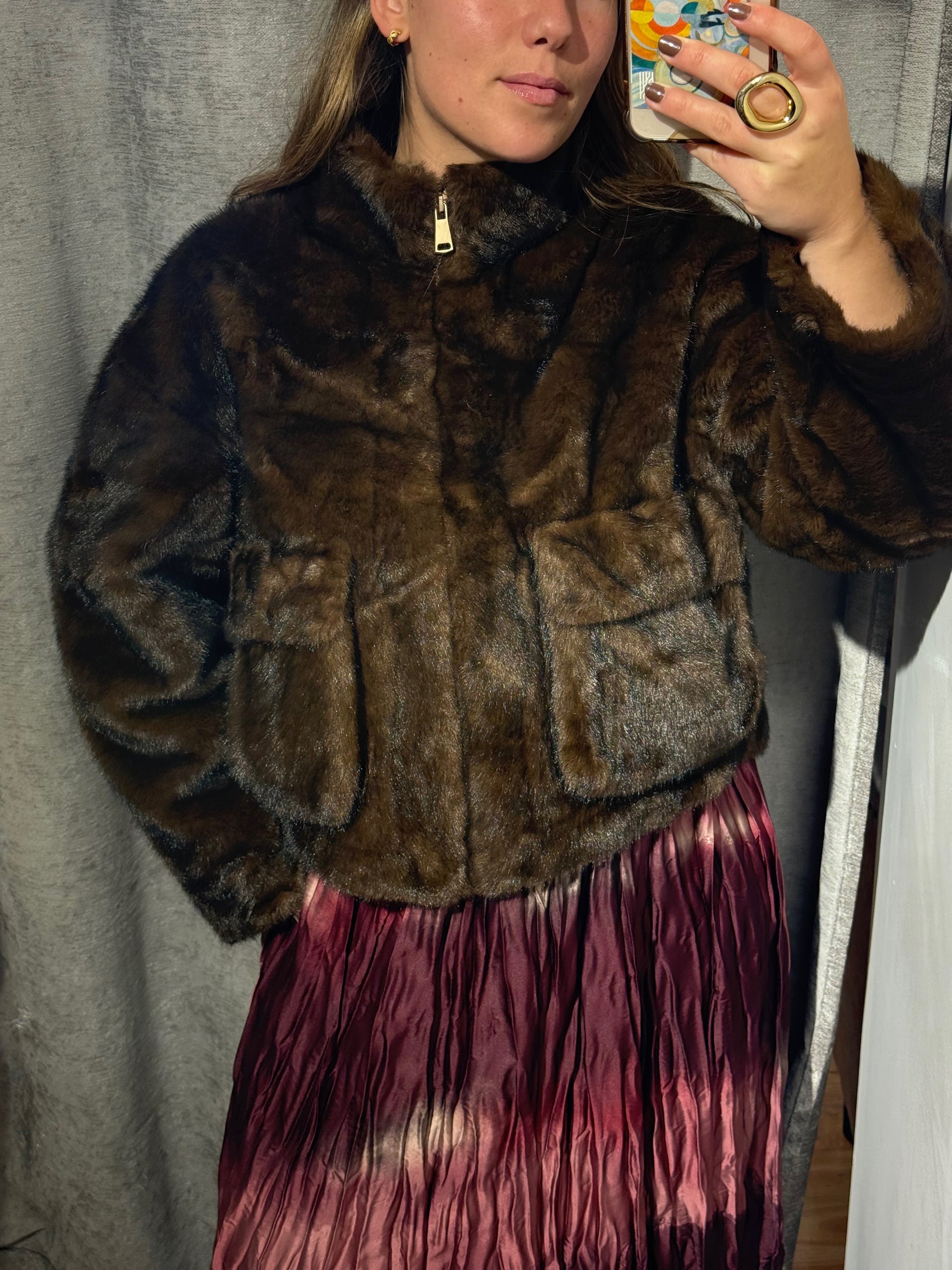 Chaqueta marrón de pelo fantasía corta con bolsillos en el delantero y cremallera.