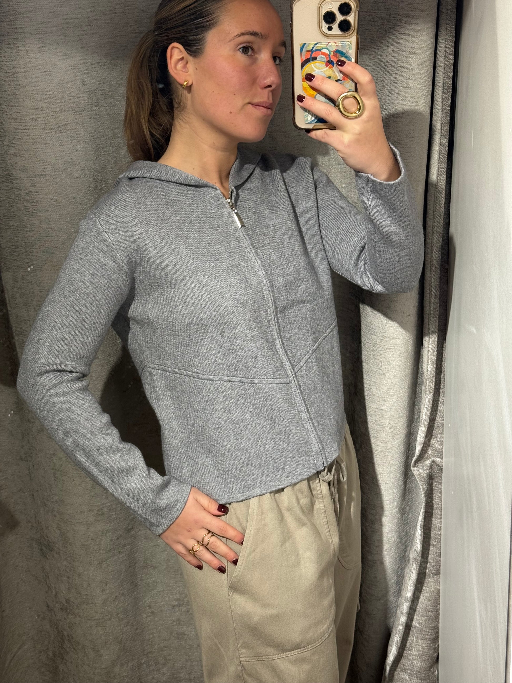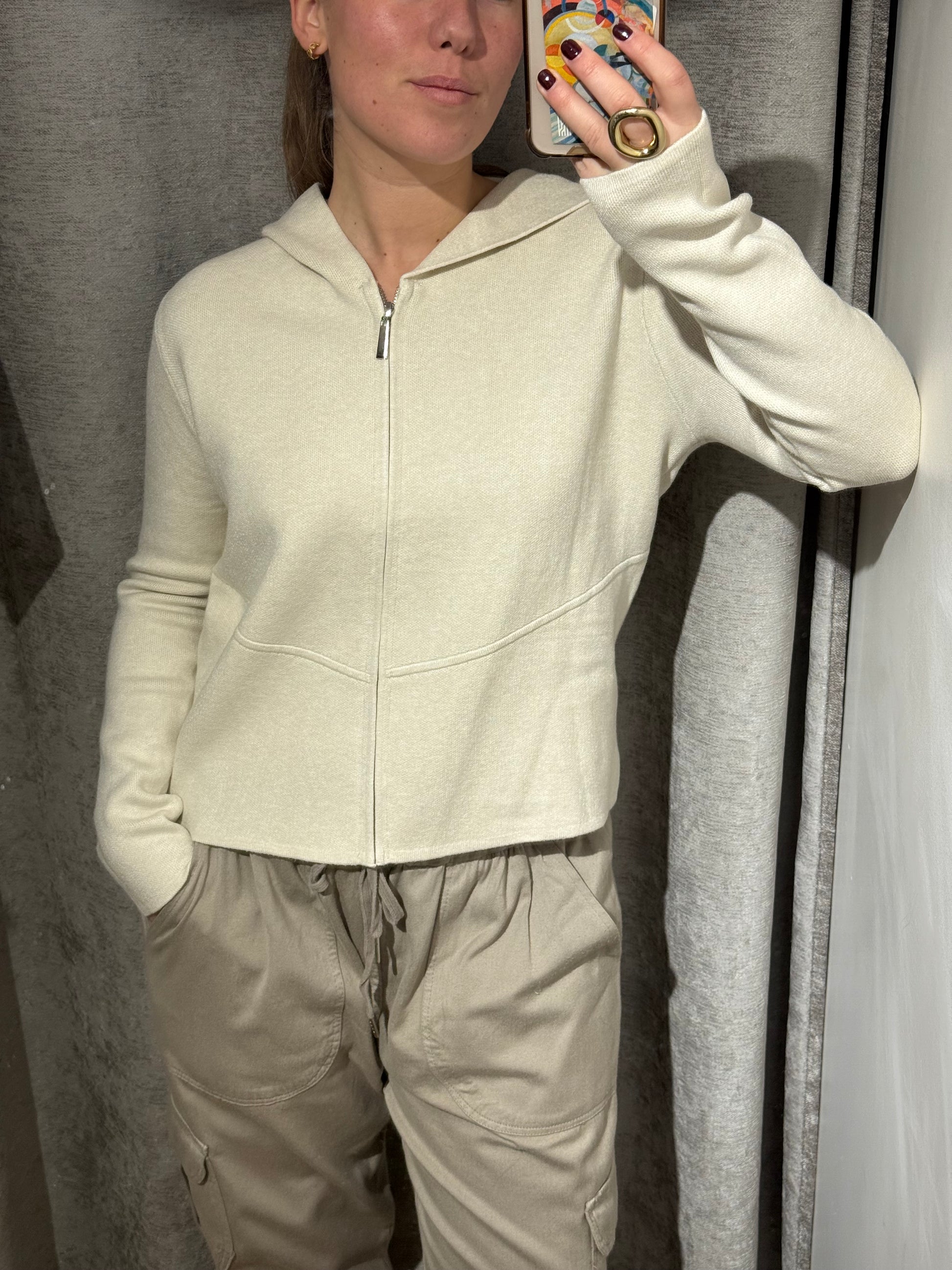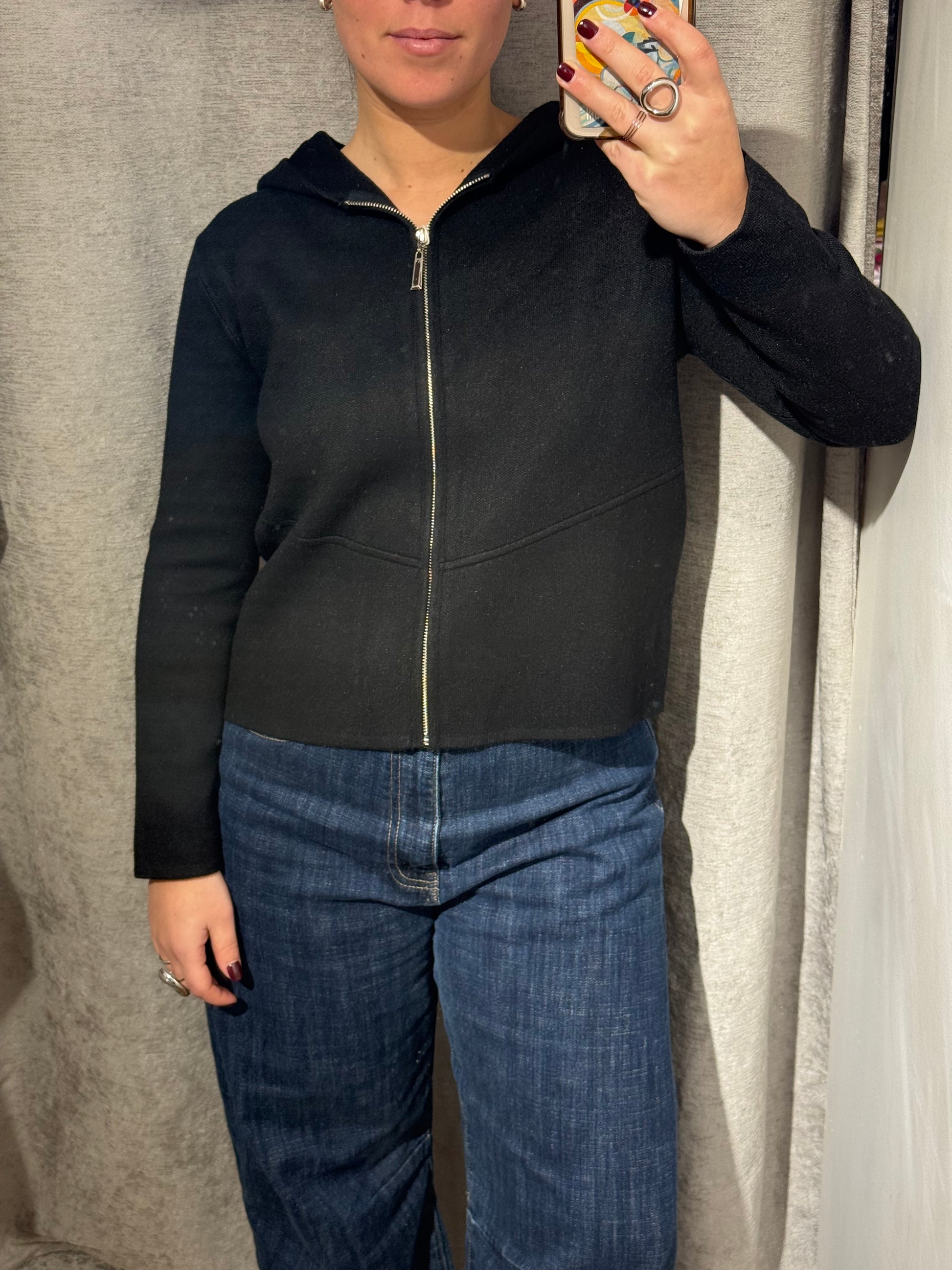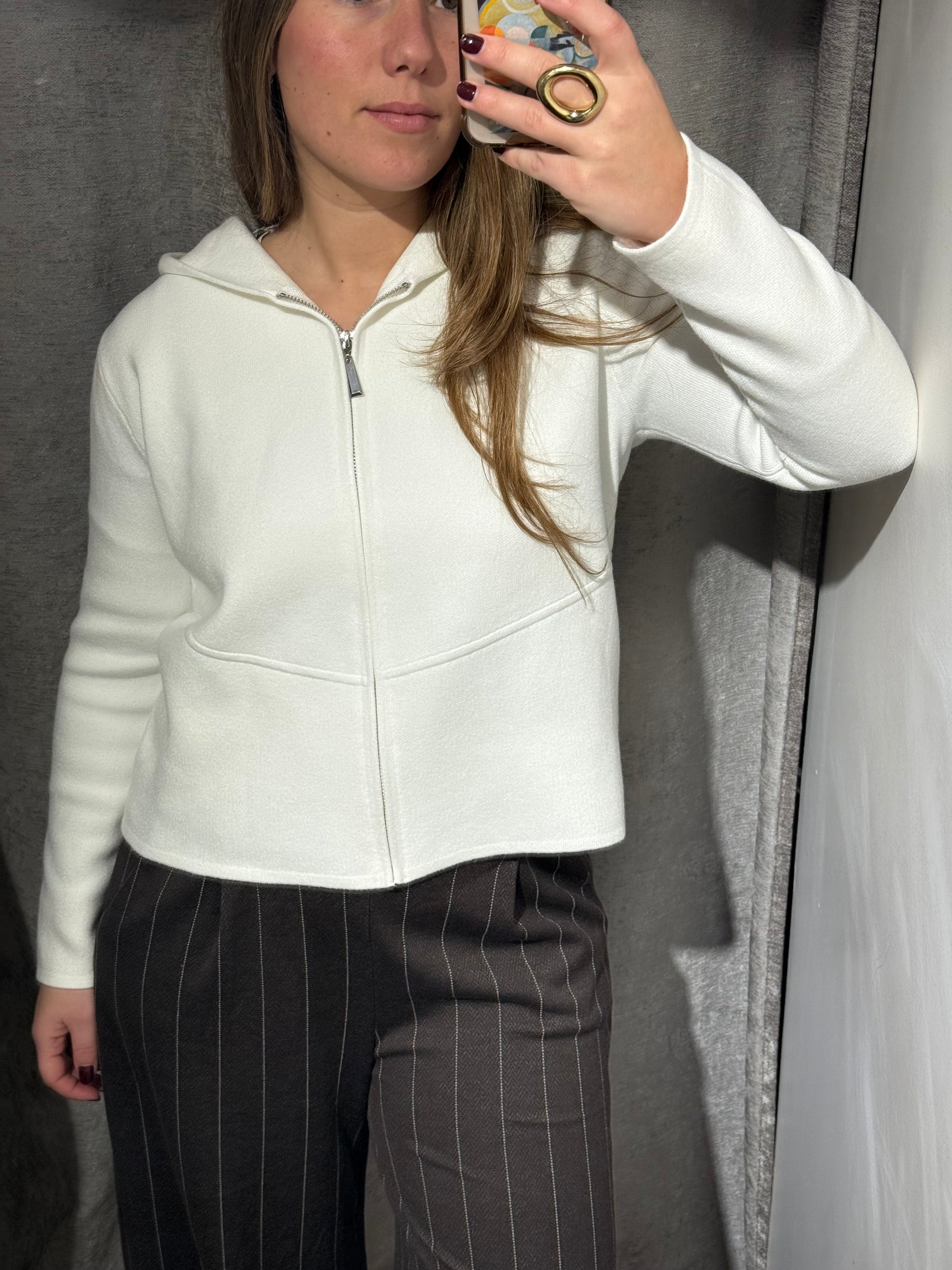 Chaqueta cuadrada con cremallera y con capucha.
