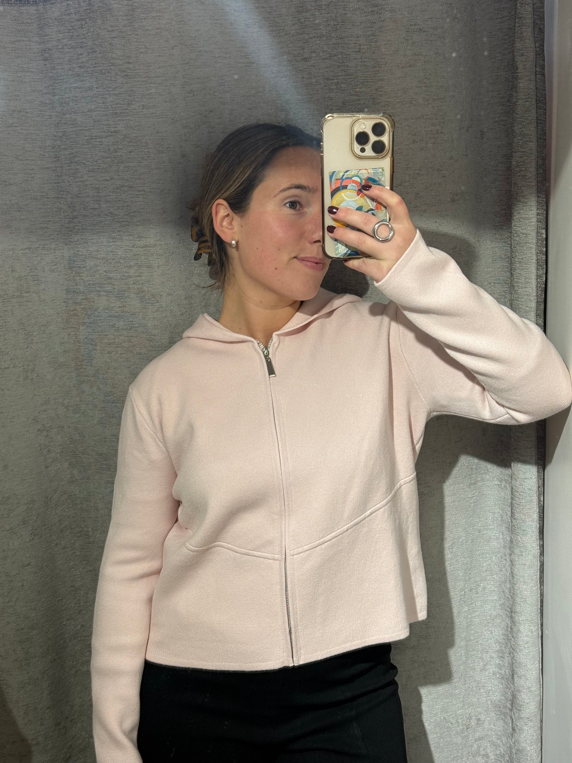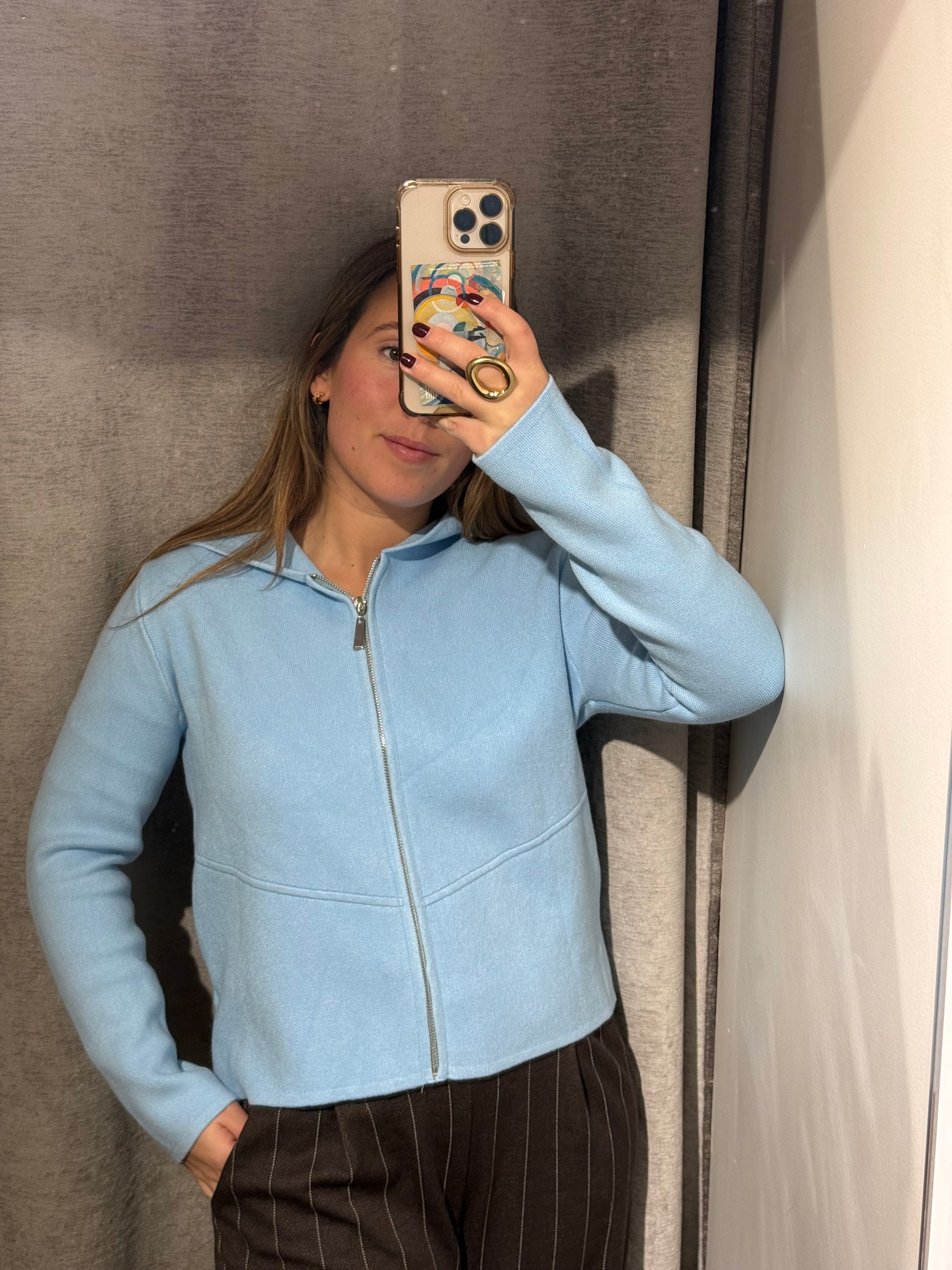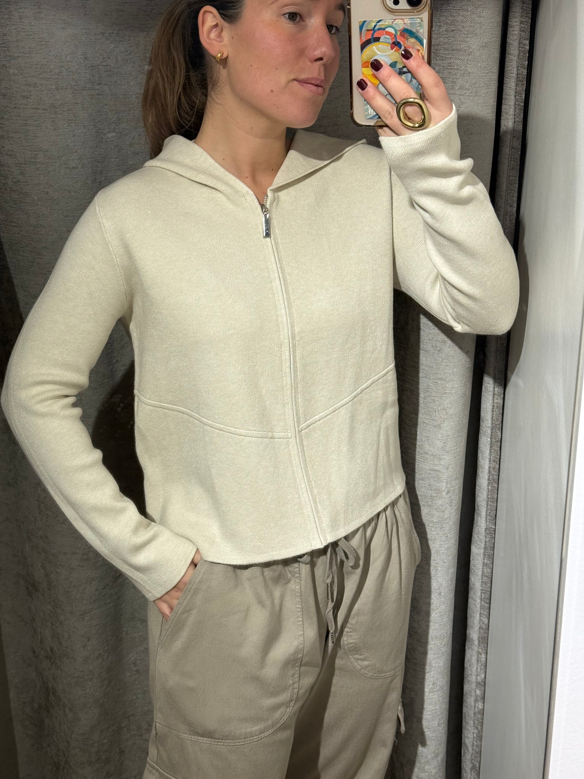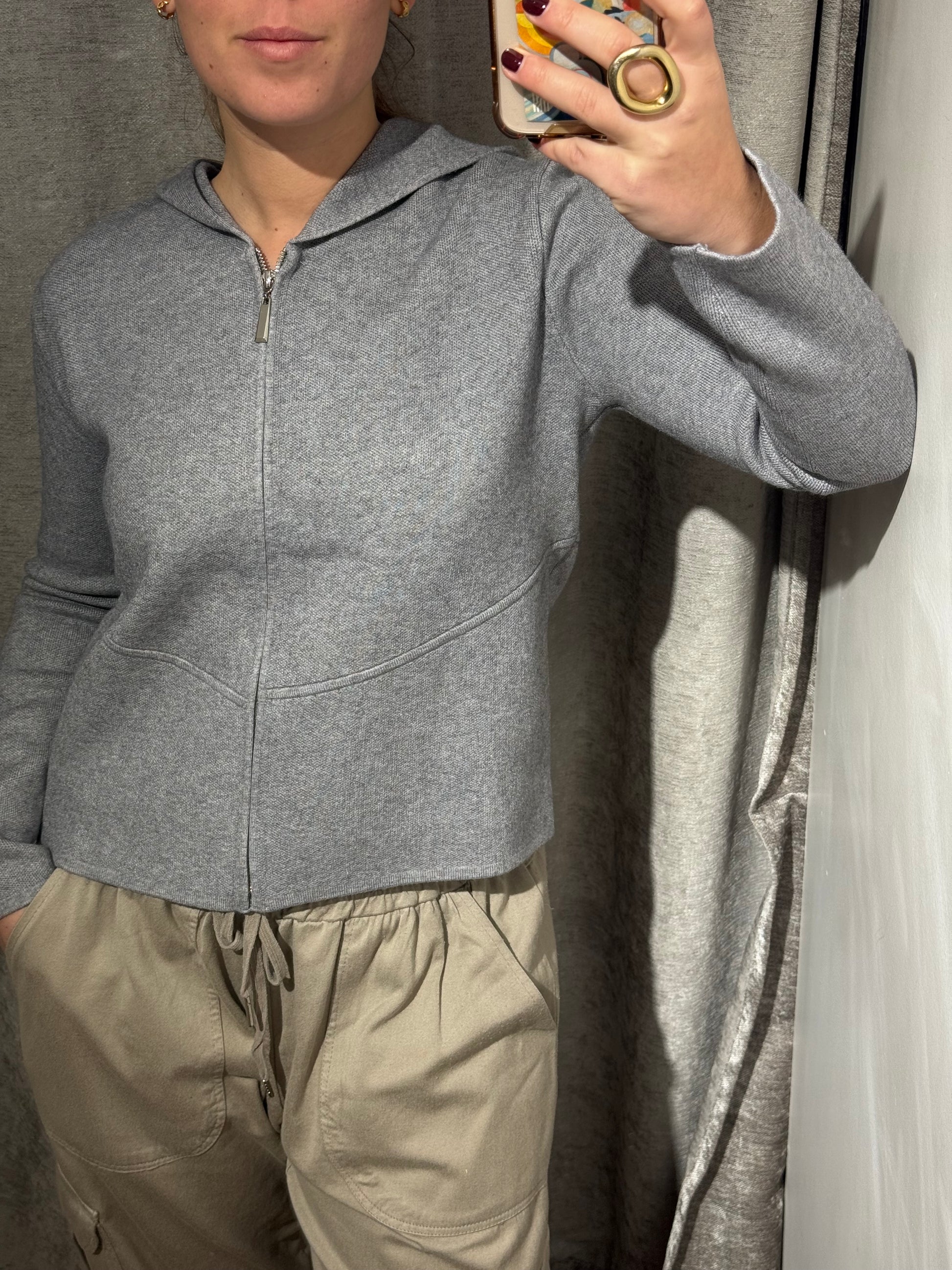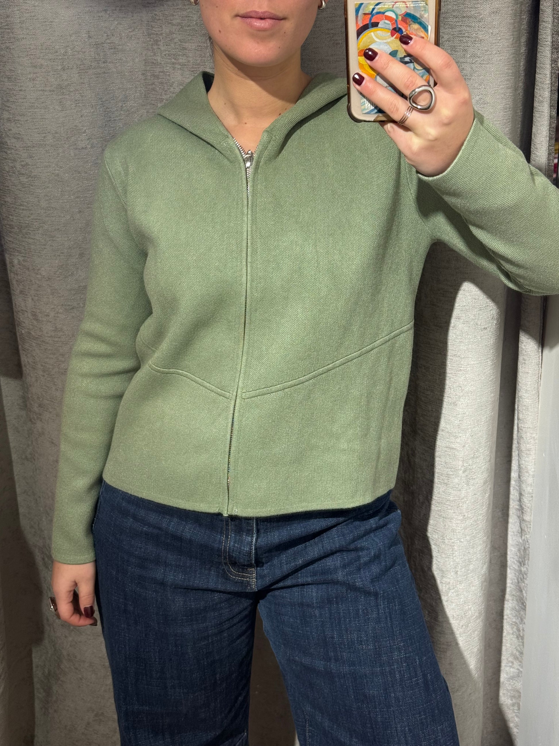 Chaqueta cuadrada con cremallera y con capucha.