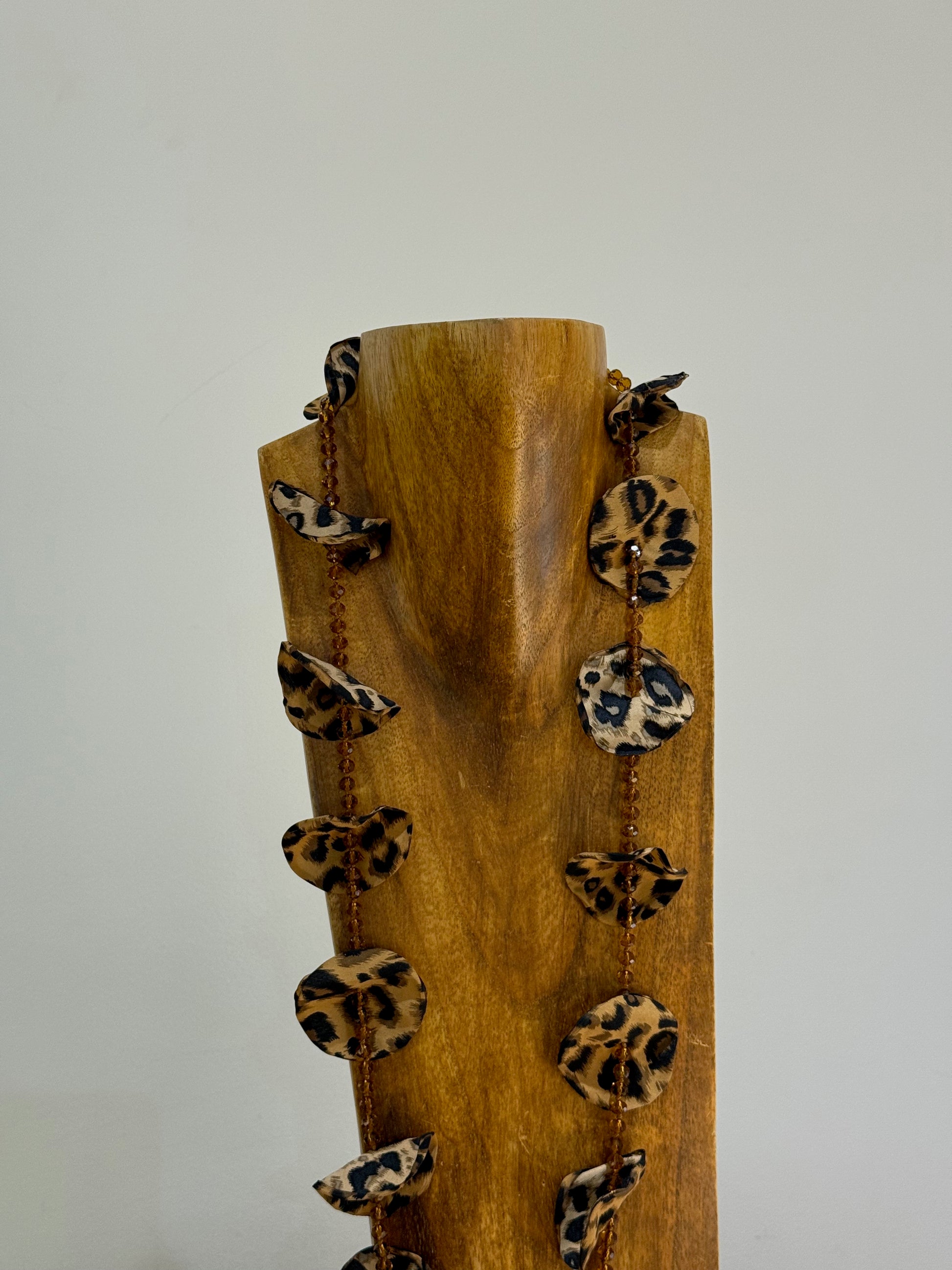 Collar de bolitas largo con pétalos estampados en leopardo.