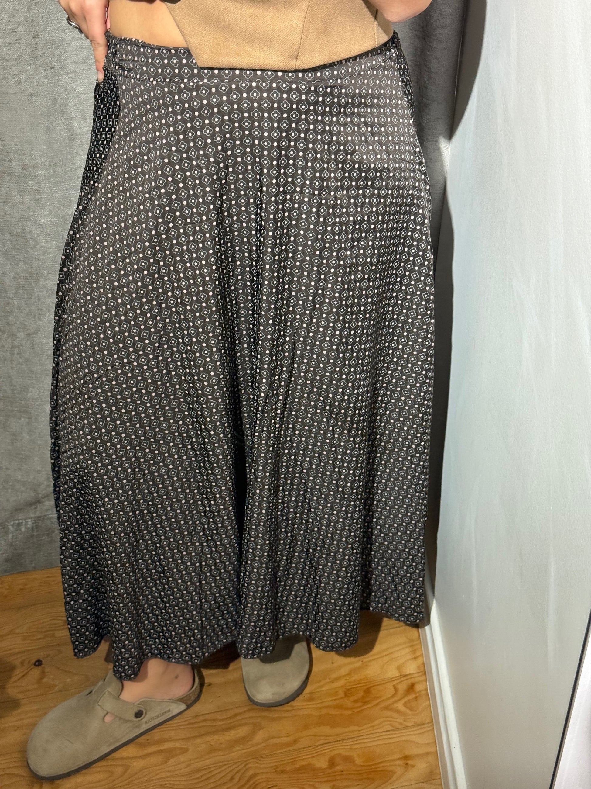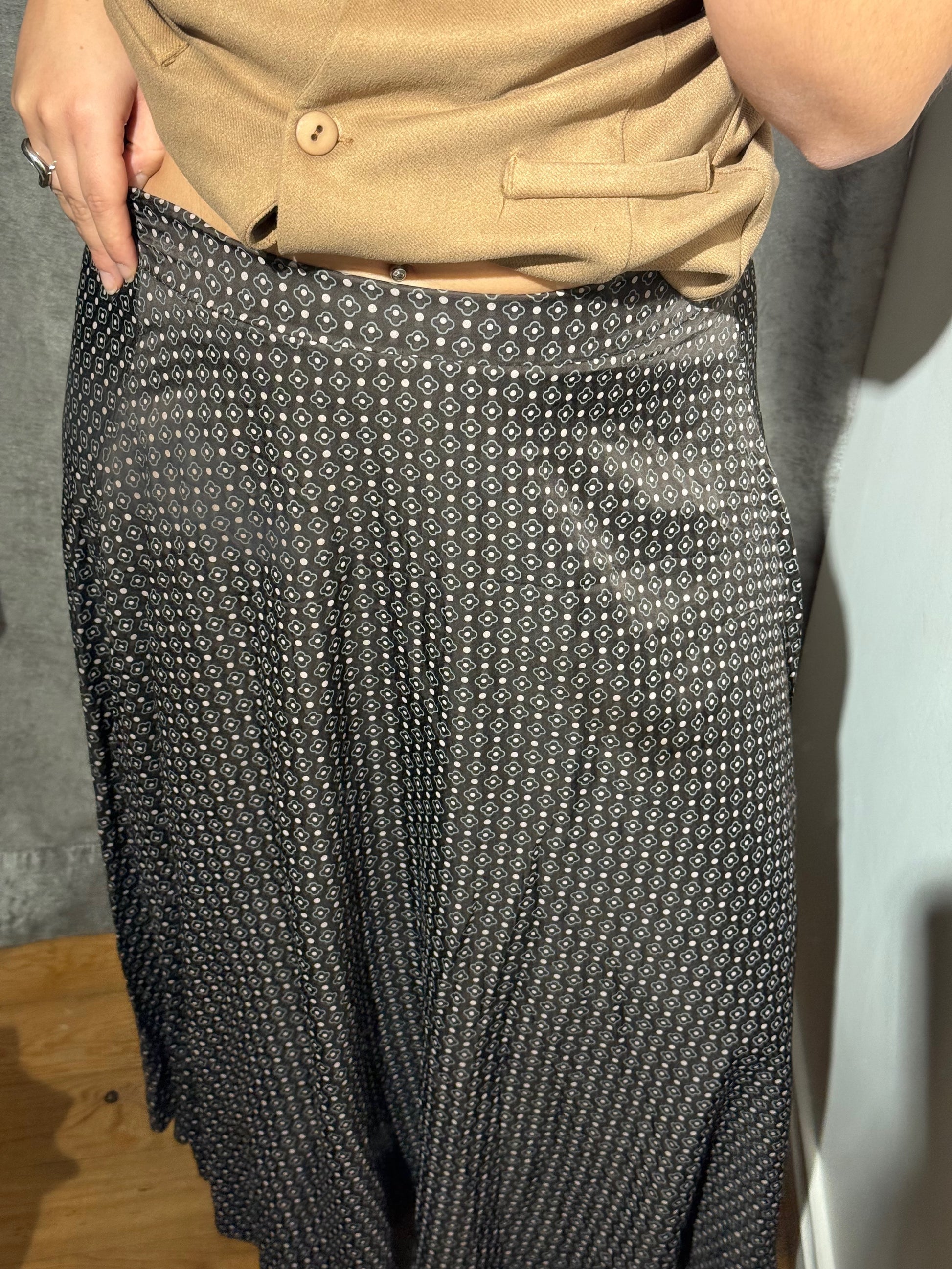 Falda de raso estampada con goma en la parte trasera de la cintura. Estampado en forma de topitos y flores pequeñas.