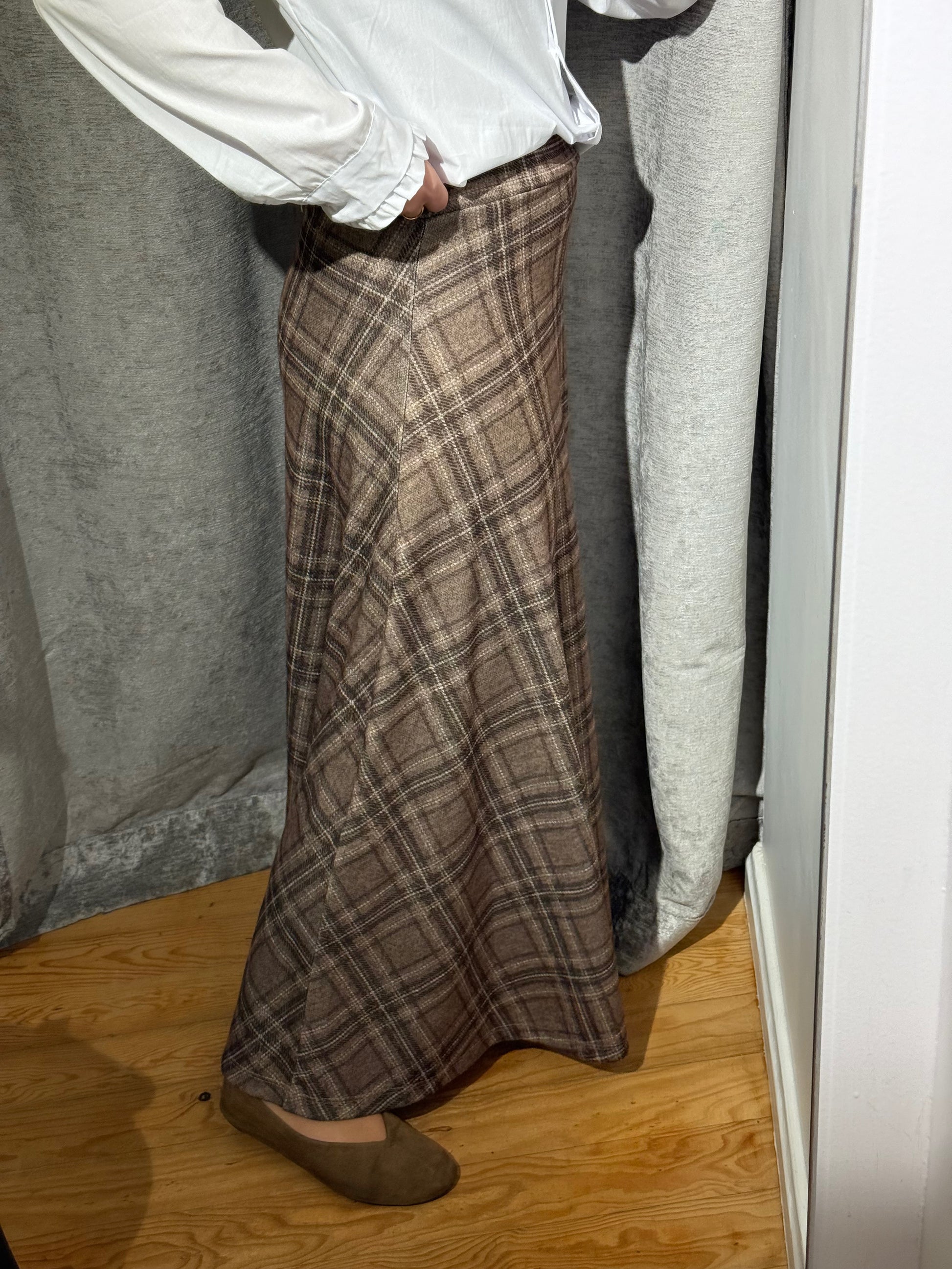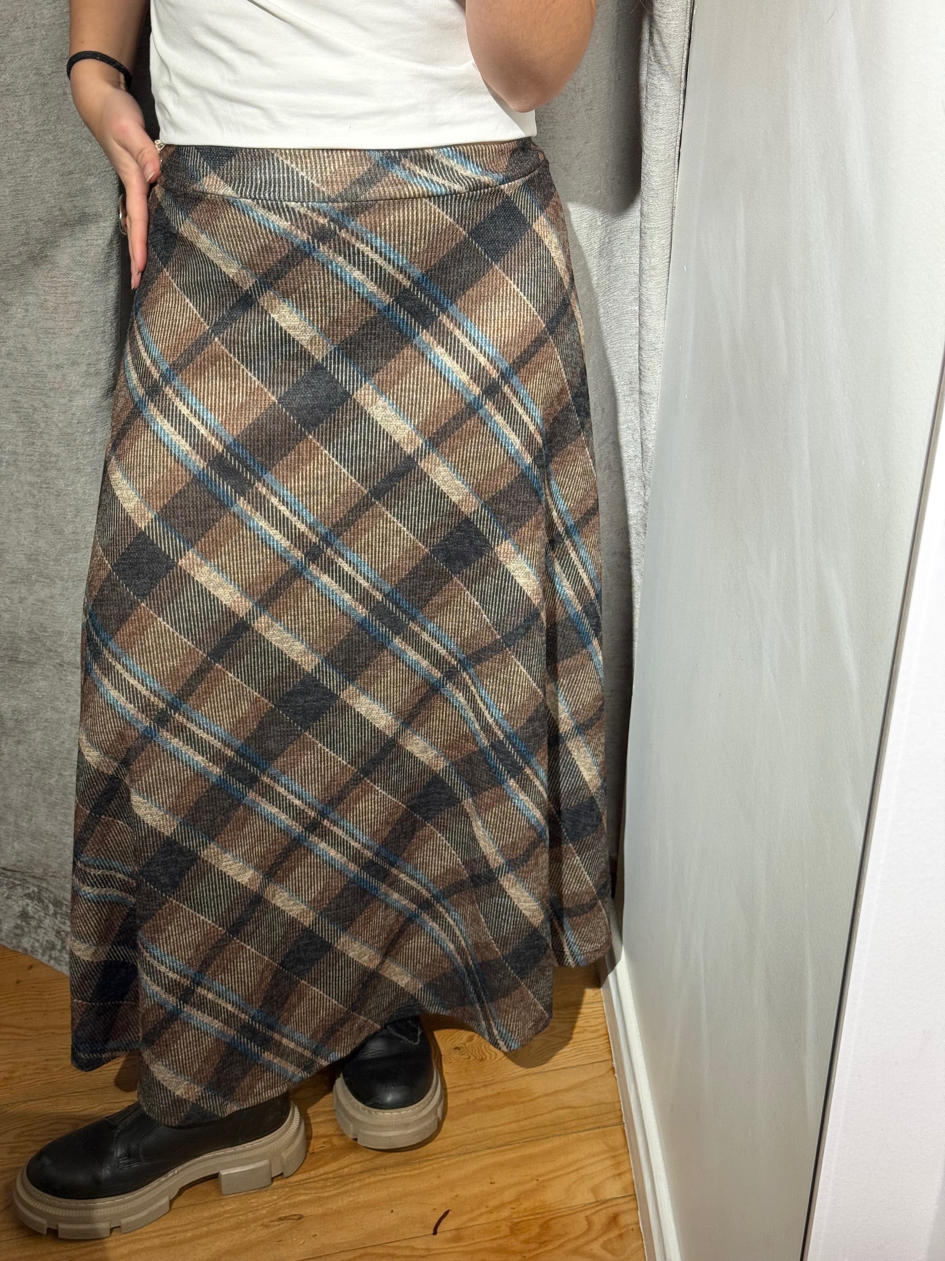 Falda larga con estampado de cuadros en marrones y azules, goma en la cintura.