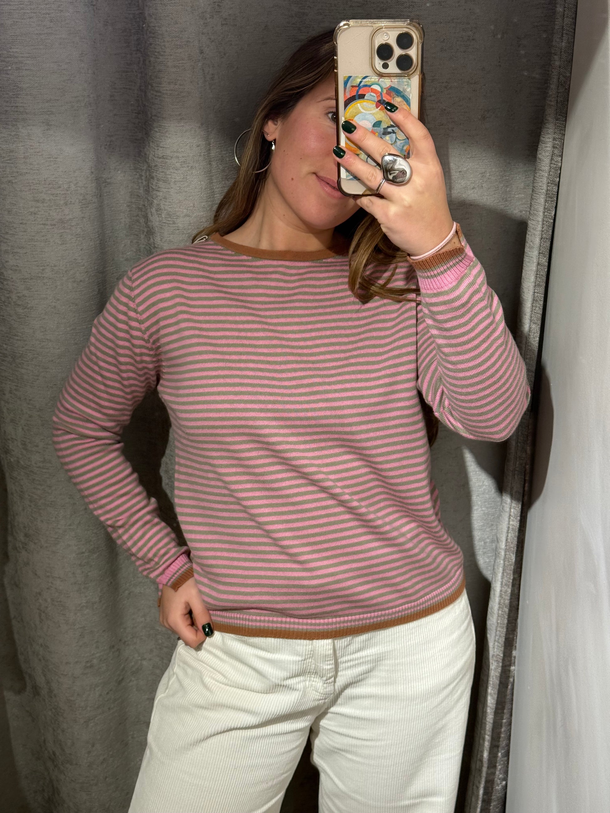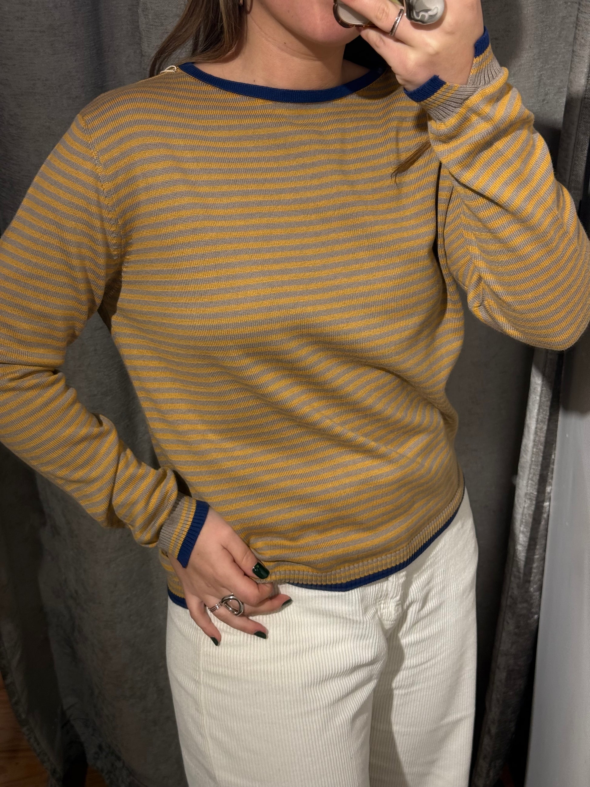 Jersey fino cuello redondo, en estampado de rayas con detalles en color contraste.