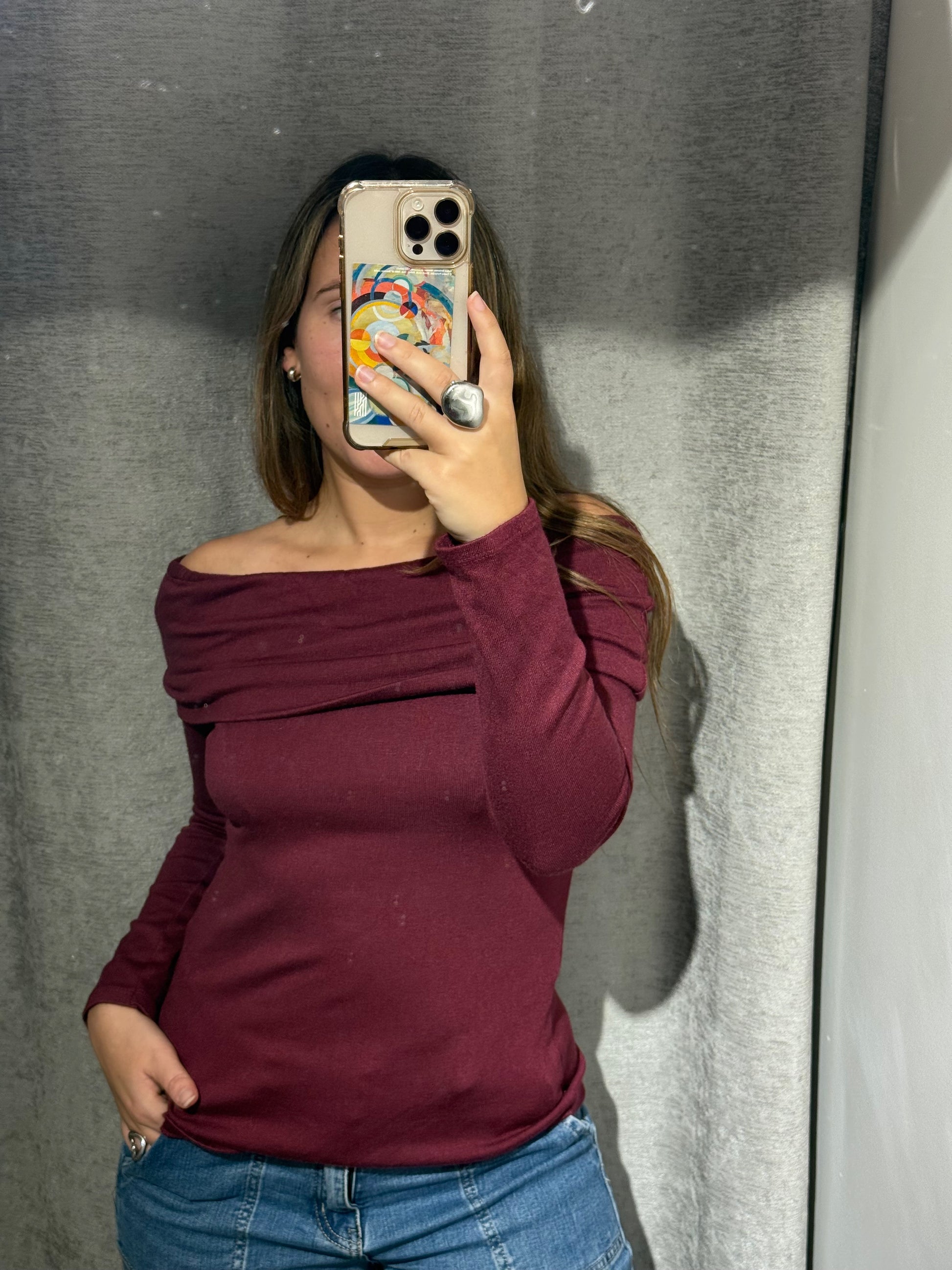 Jersey ceñido hombros descubiertos, en granate.
