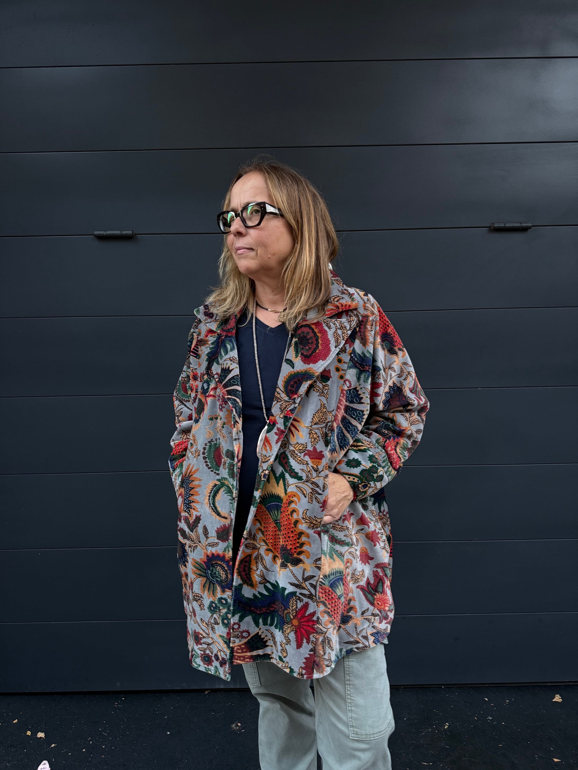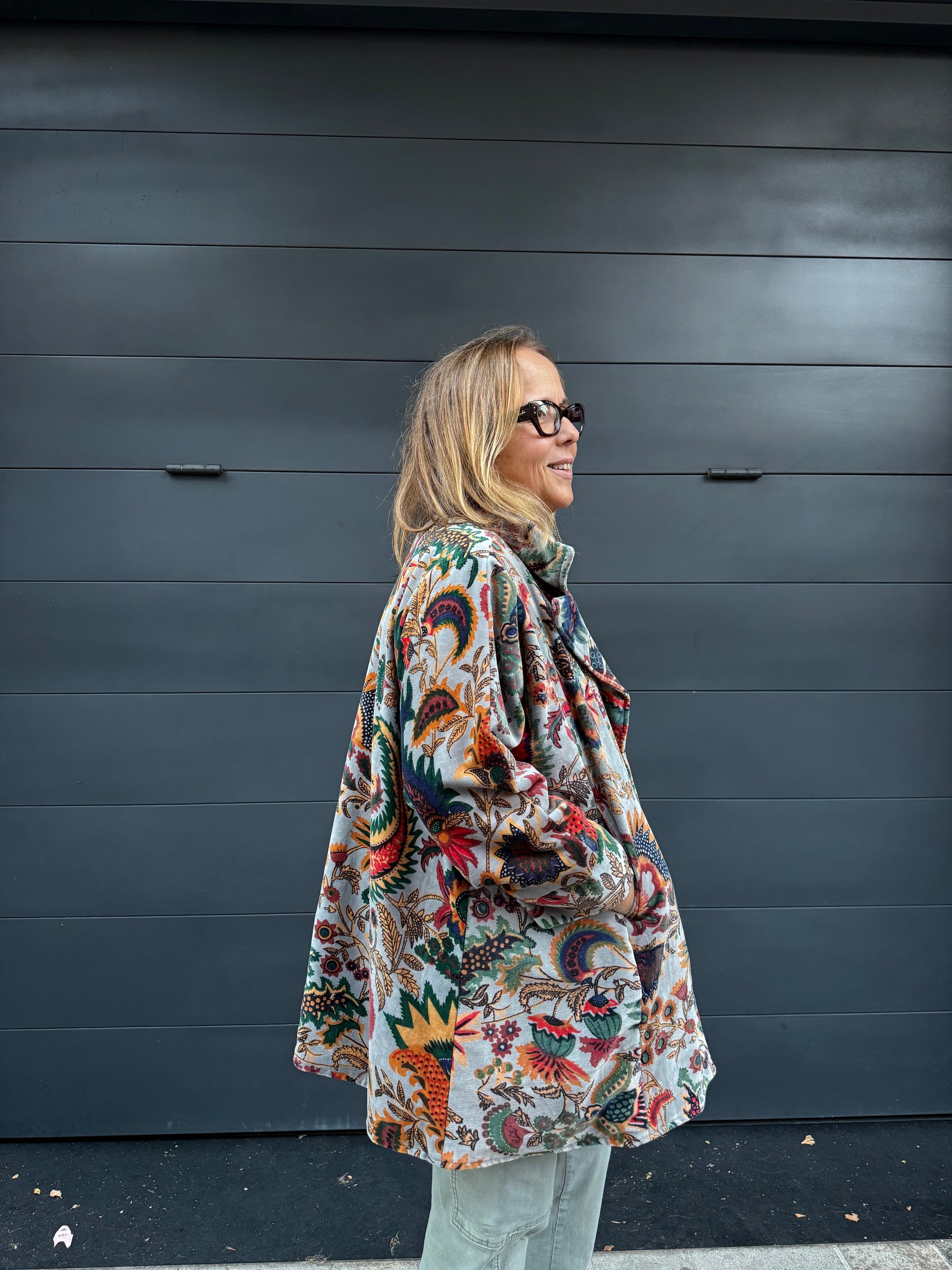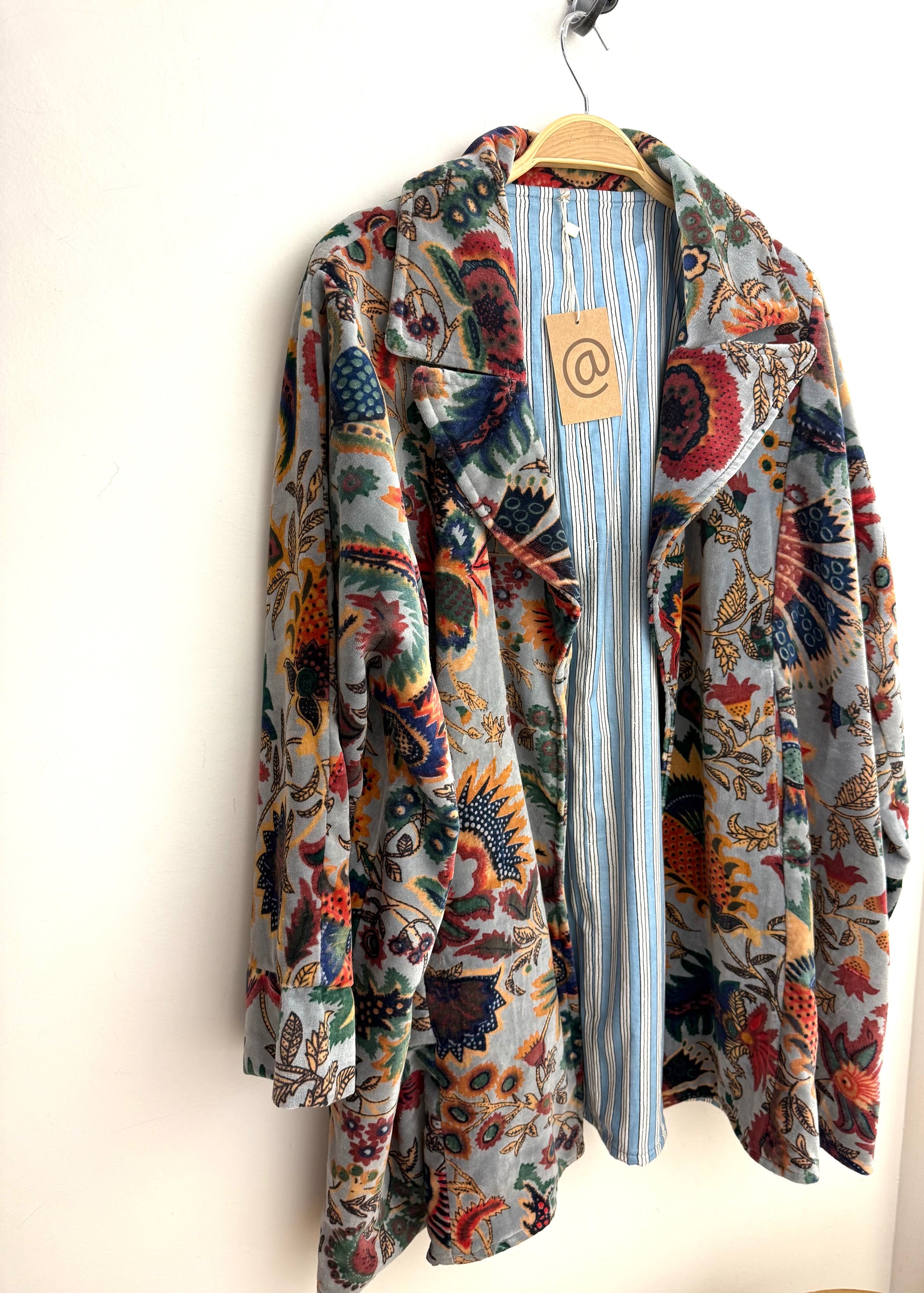 Kimono largo medio de terciopelo y estampado de flores en varios colores.