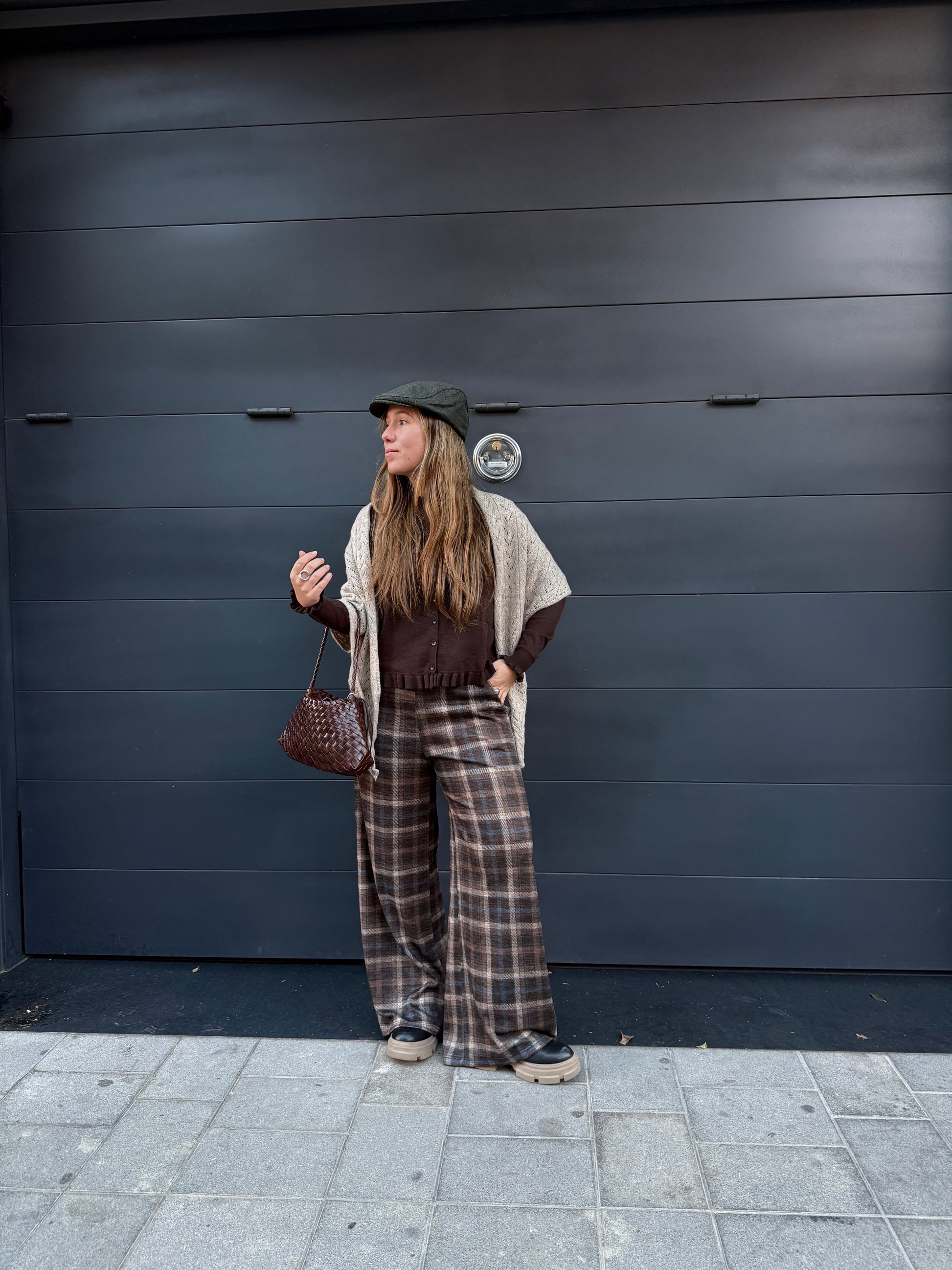 Pantalón largo ancho con estampado de cuadros, en diferentes tonos. Con bolsillos y goma en la cintura.