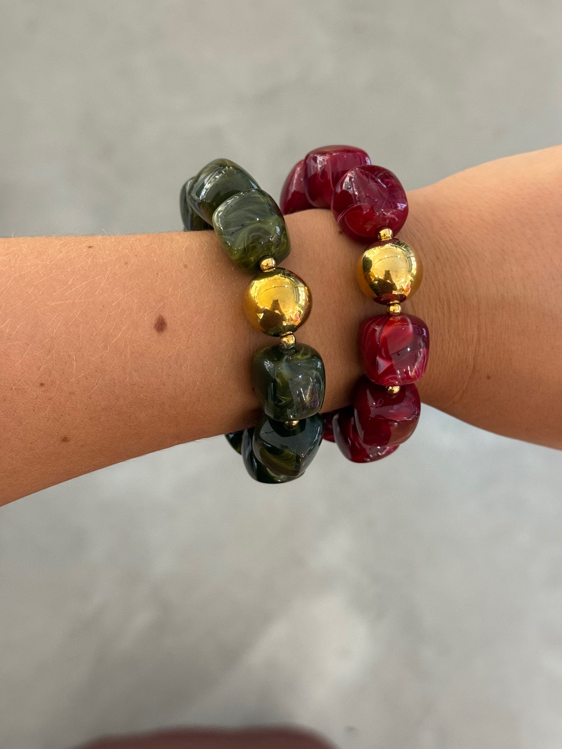 Pulsera / brazalete de bolas asimétricas en color y una bolsa en dorado.