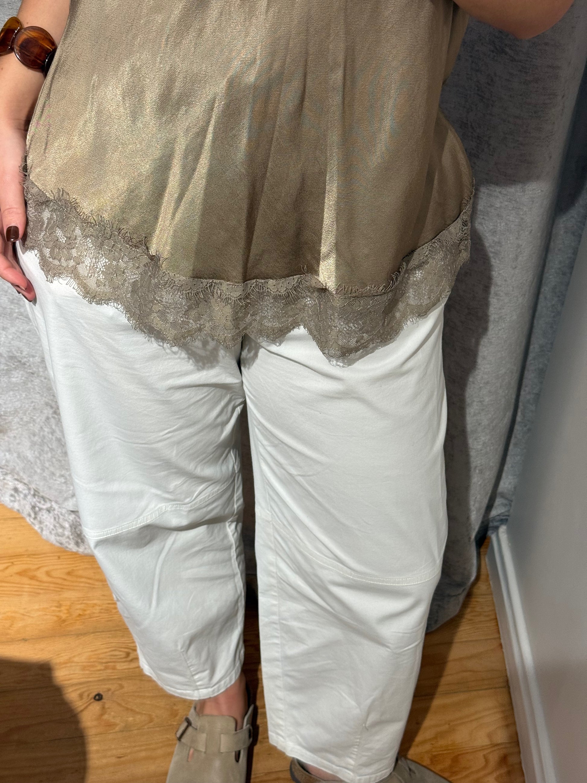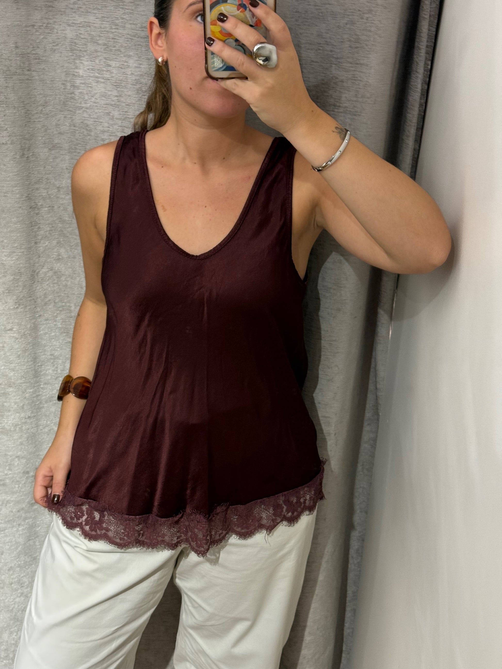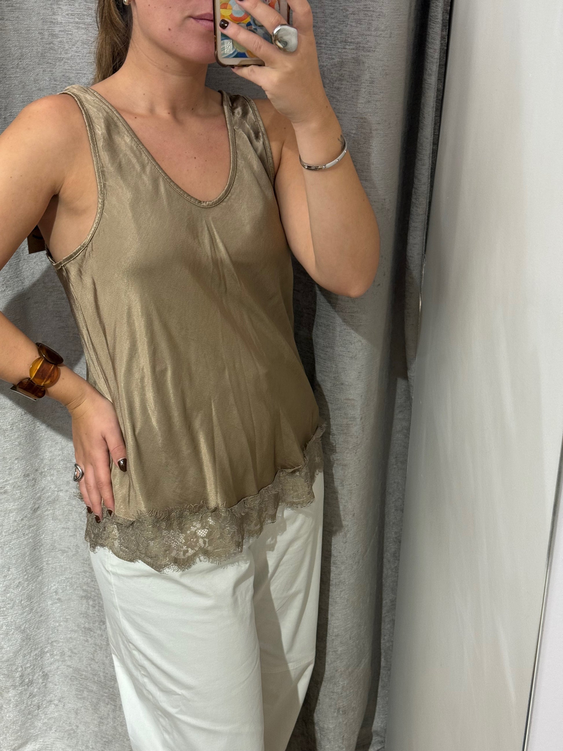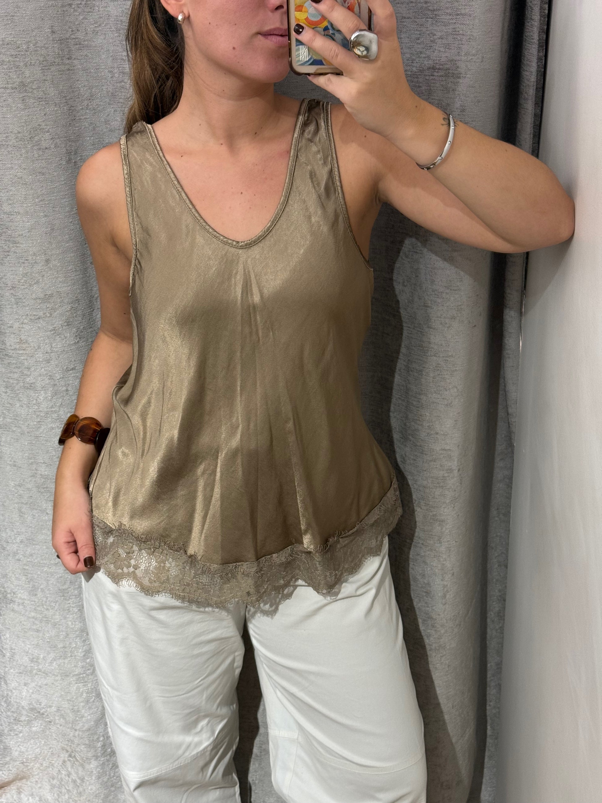 Top de tirantes en raso corte en evasé. Con encaje en el inferior.