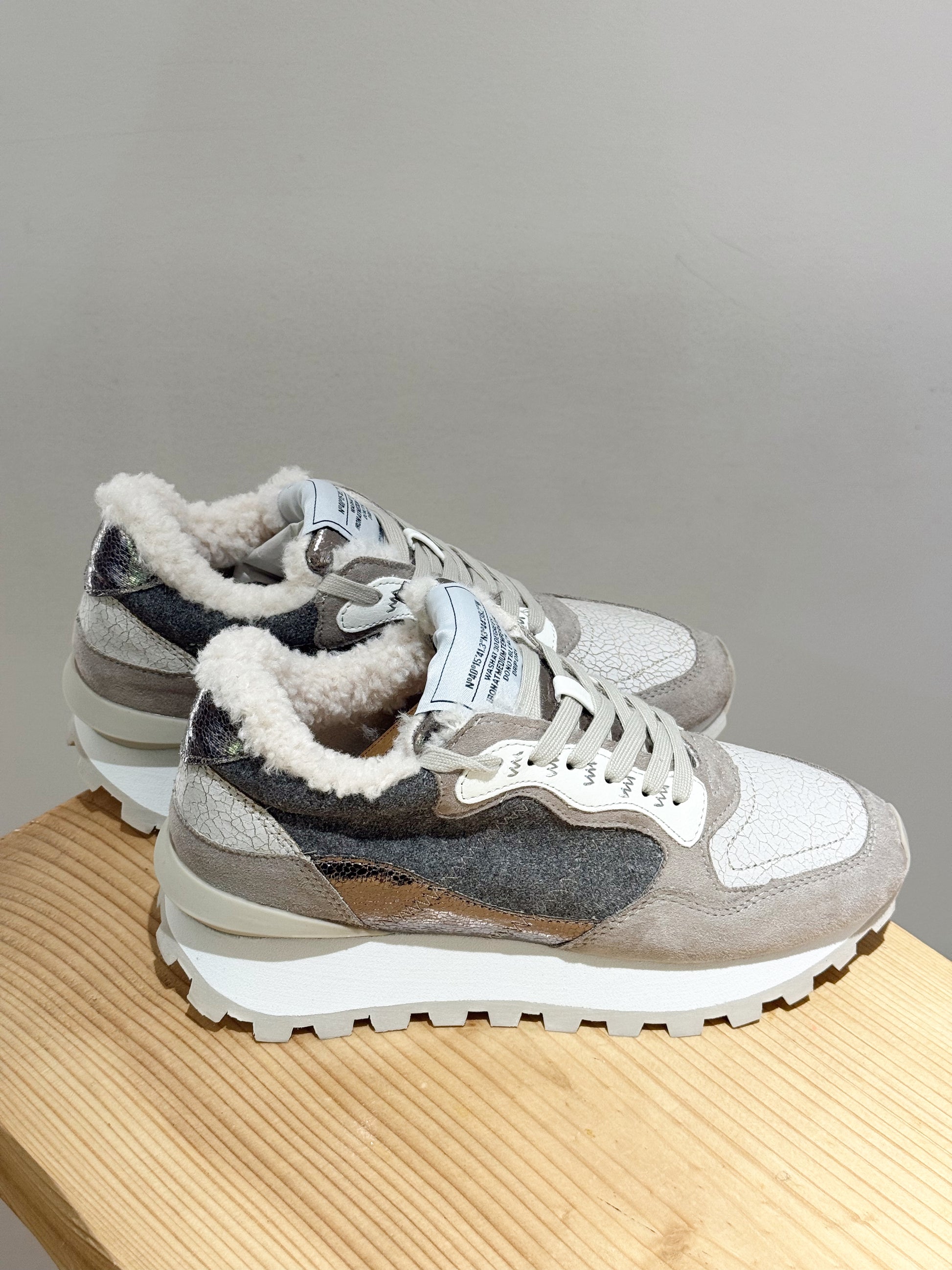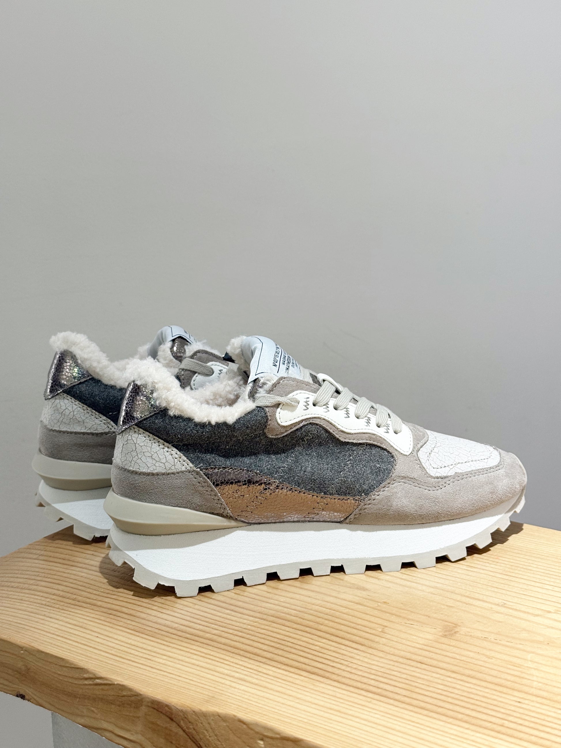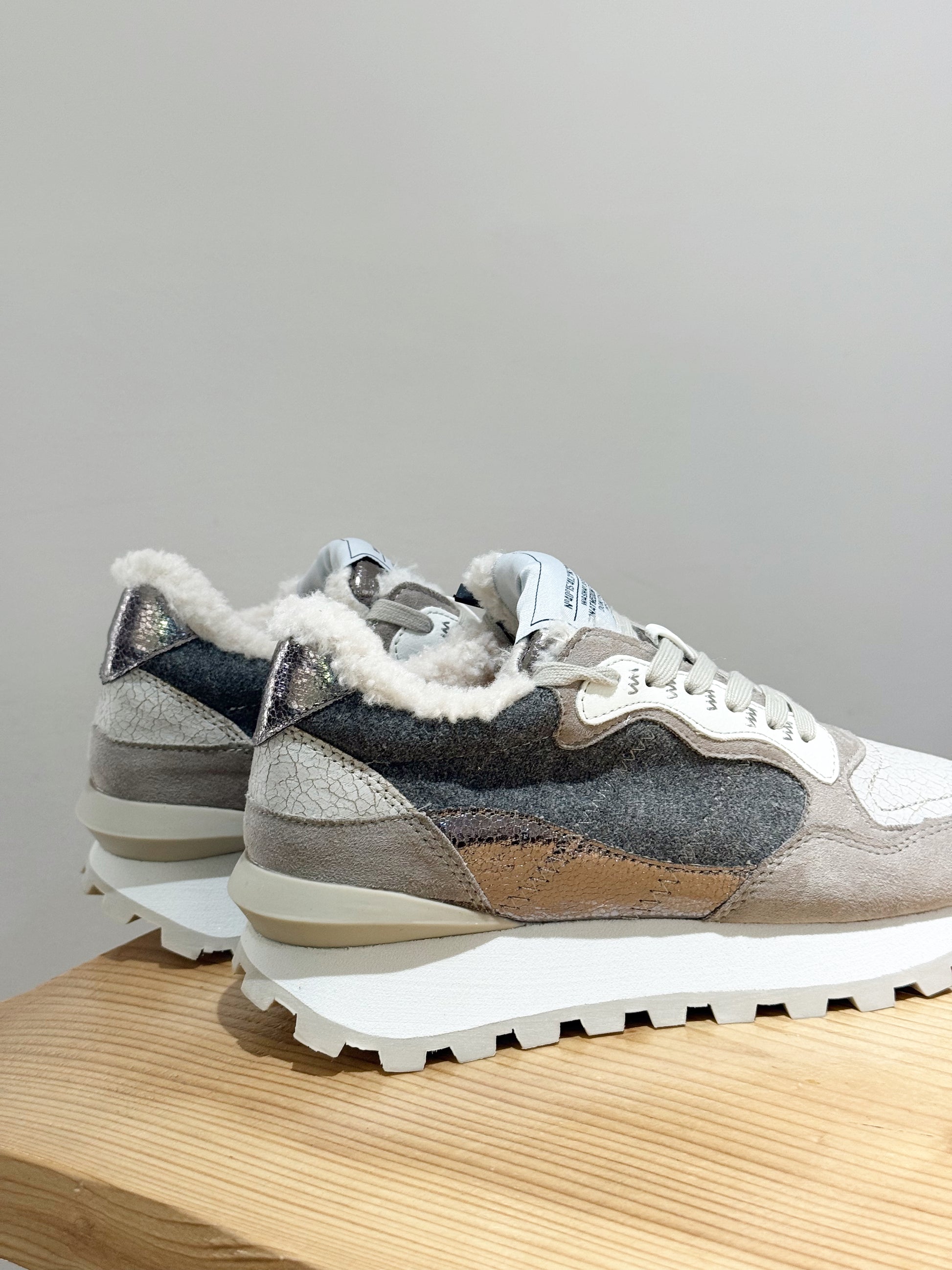 Zapatilla deportiva en tonalidades grises con plataforma de suela dentada y con borreguito en el borde de la entrada.