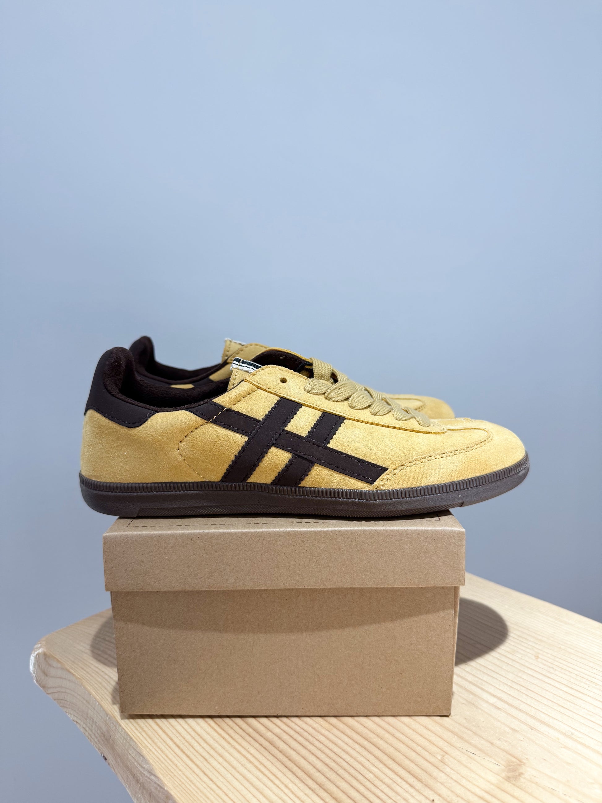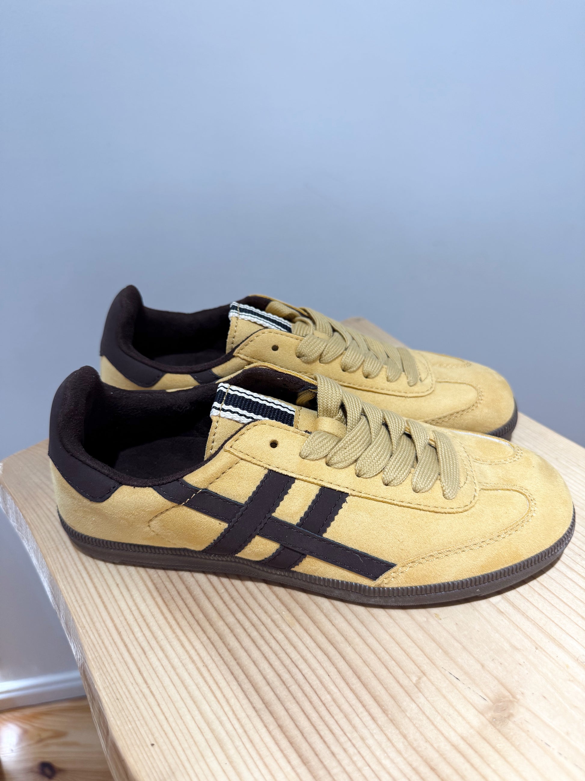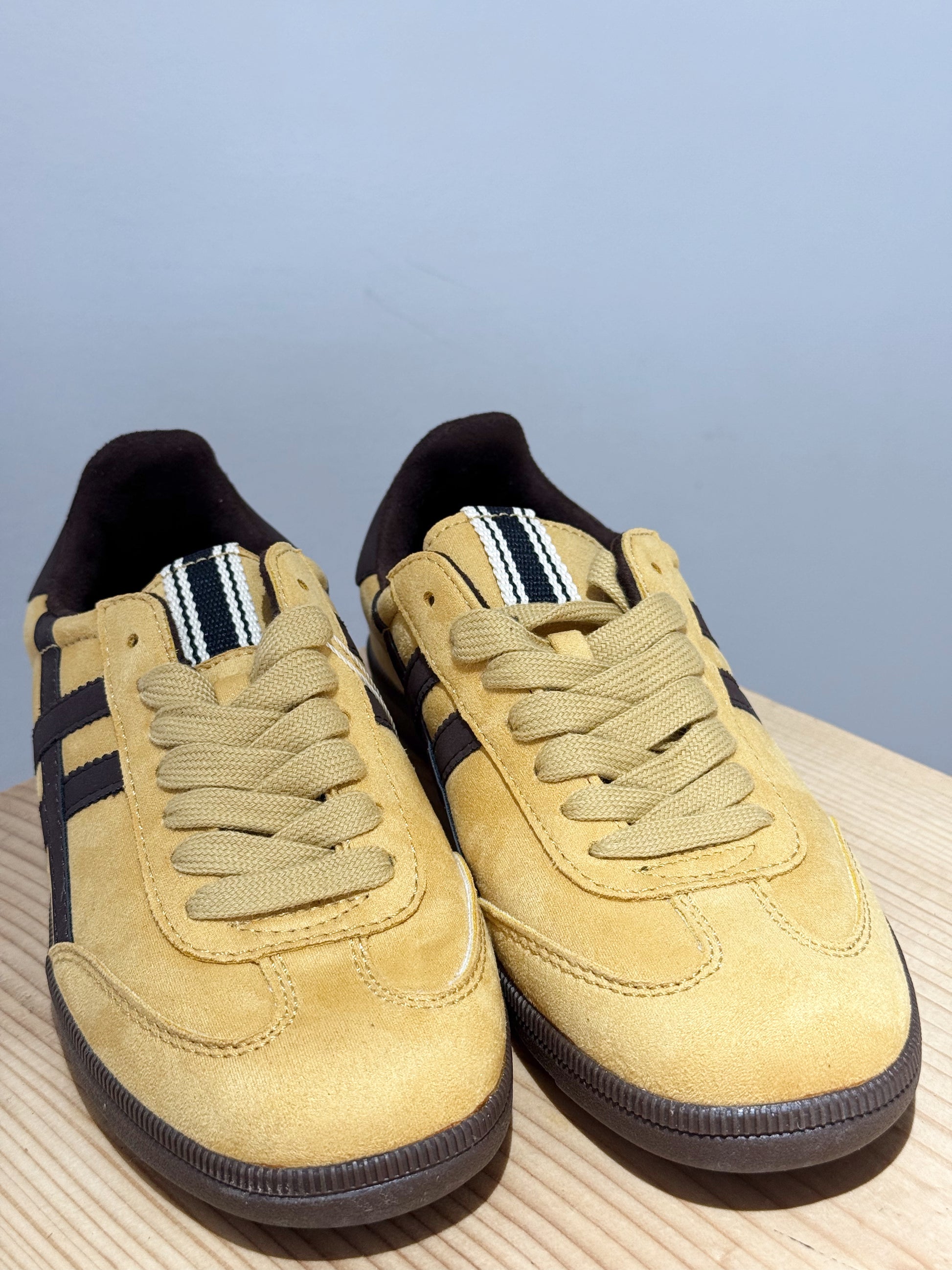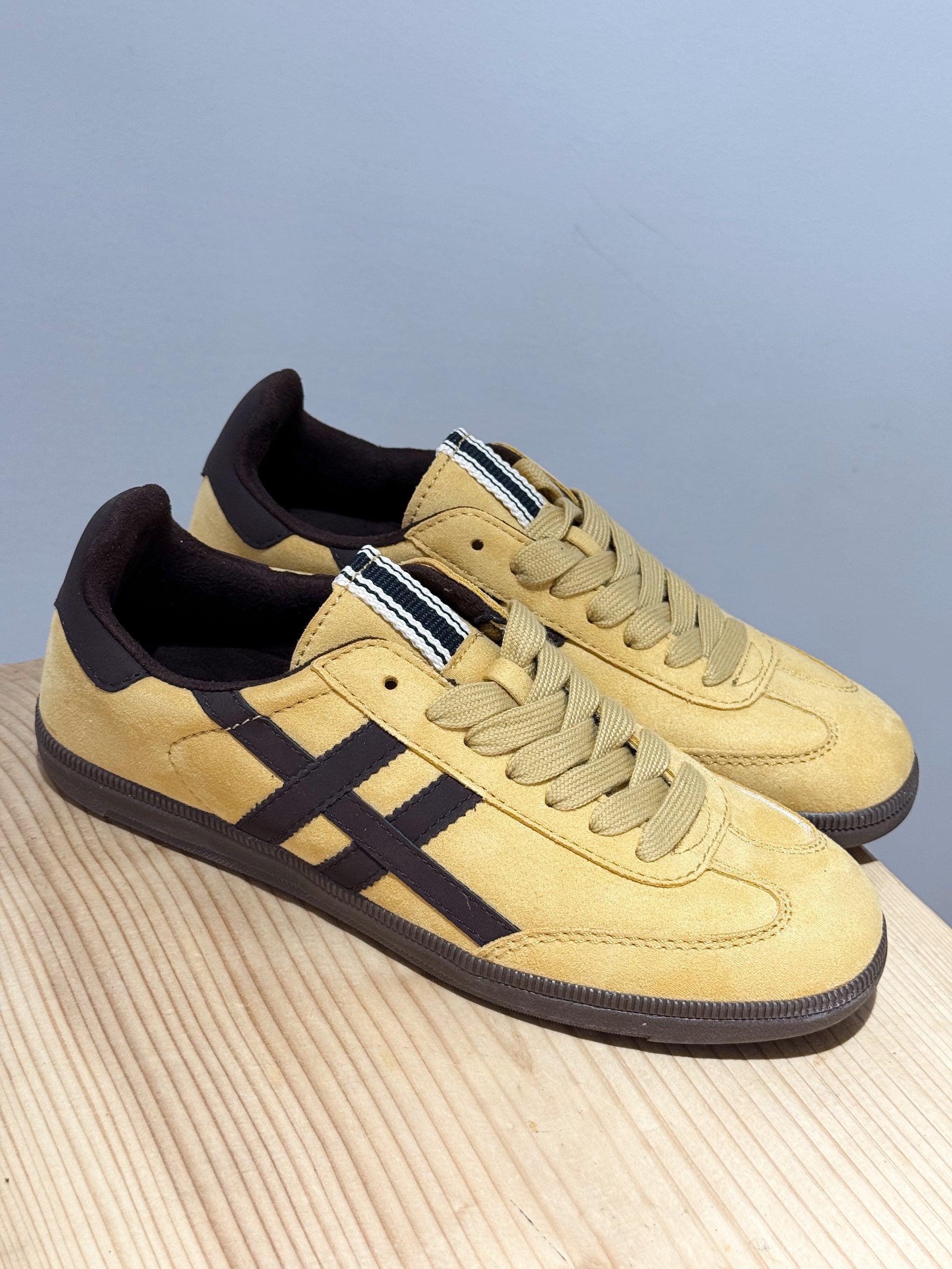 Zapatilla / bamba color mostaza con los detalles en marrón chocolate.